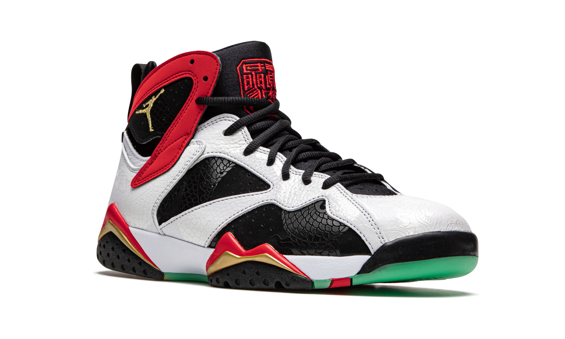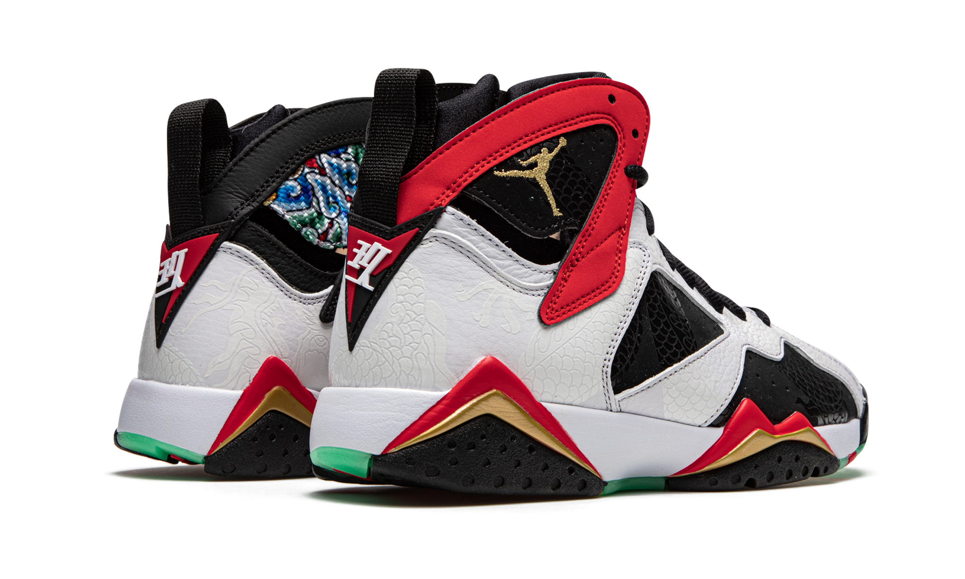 The Air Jordan 7 “Greater China” is a special colorway of Michael Jordan’s seventh signature shoe that honors China’s passion for the game of basketball. The “Greater China” also salutes the country’s appreciation for Jordan’s signature shoe collection, which has been a fixture in China’s streetwear scene for decades. As for the look of this shoe, overtures to traditional Chinese culture appear throughout the design. Patterns reminiscent of dragon scales can be found on the detailing of the black nubuck material that appears on the mid-panel and forefoot. The scales are lasered into the white leather overlays found on the toe, eyelets, and heel. Both the heel and tongue feature Chinese characters in white and red embroidery, respectively. Jordan Brand incorporates a gold embroidered Jumpman on the outside of the collar while placing traditional Chinese patterns on the medial side to complete the look. Release date: September 5, 2020. Greater China