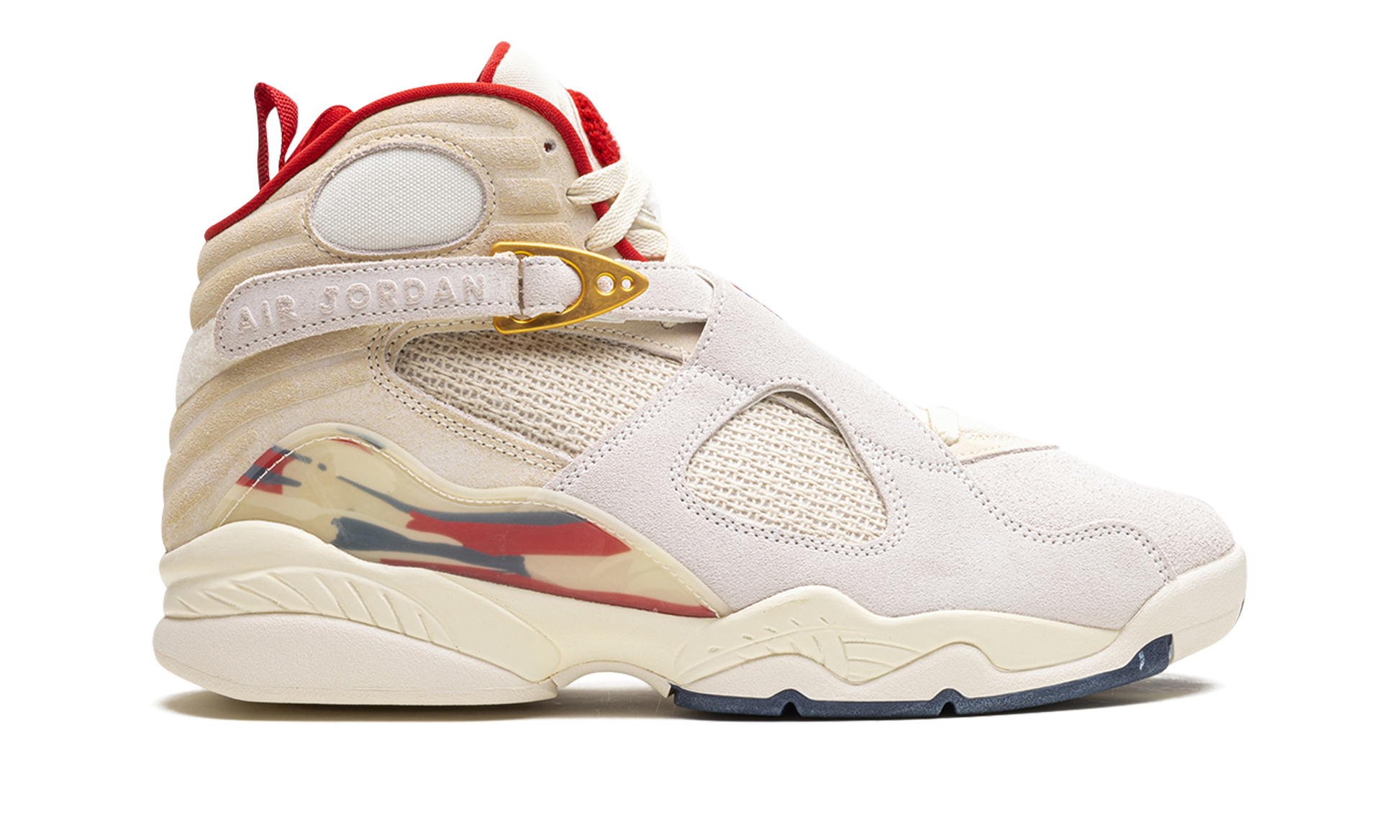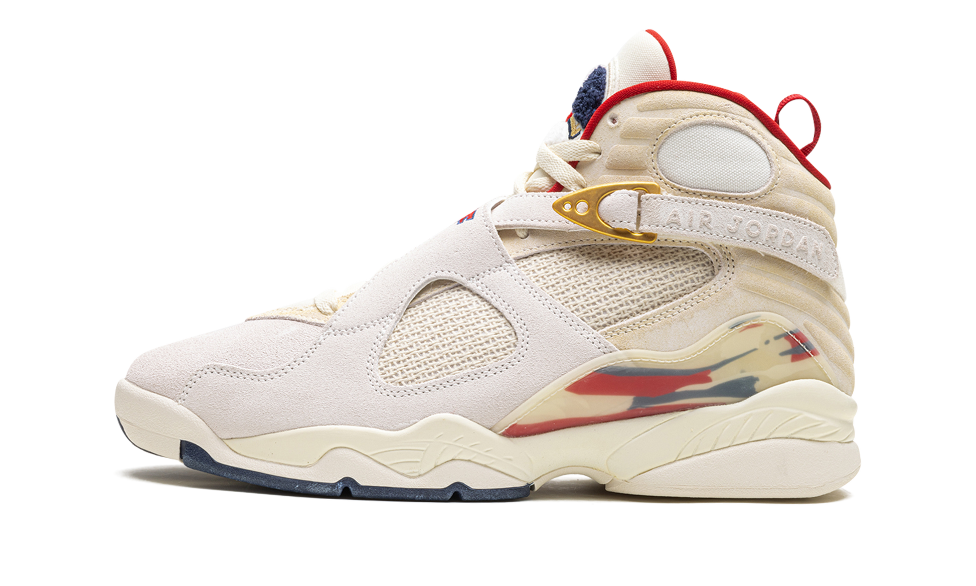 The SoleFly x Air Jordan 8 “Mi Casa Es Su Casa” is a collaboration by the Miami based retailer and Jordan Brand on a colorway of the retro basketball shoe celebrating Cuban heritage and culture. In a color scheme said to be inspired by the Cuban flag, the premium design features a Sail suede and custom mesh upper with blue and red accents throughout. The cross-strap buckles are highlighted by a metallic gold finish, while “SF” for SoleFly replaces the “23” on the left shoe’s strap. The Jordan 8’s signature graphic mudguard at the heel is presented in a unique semi-translucent plastic with the graphic underneath instead of painted on the surface for a frosted effect. Release date: December 2, 2023 SoleFly - Mi Casa Es Su Casa