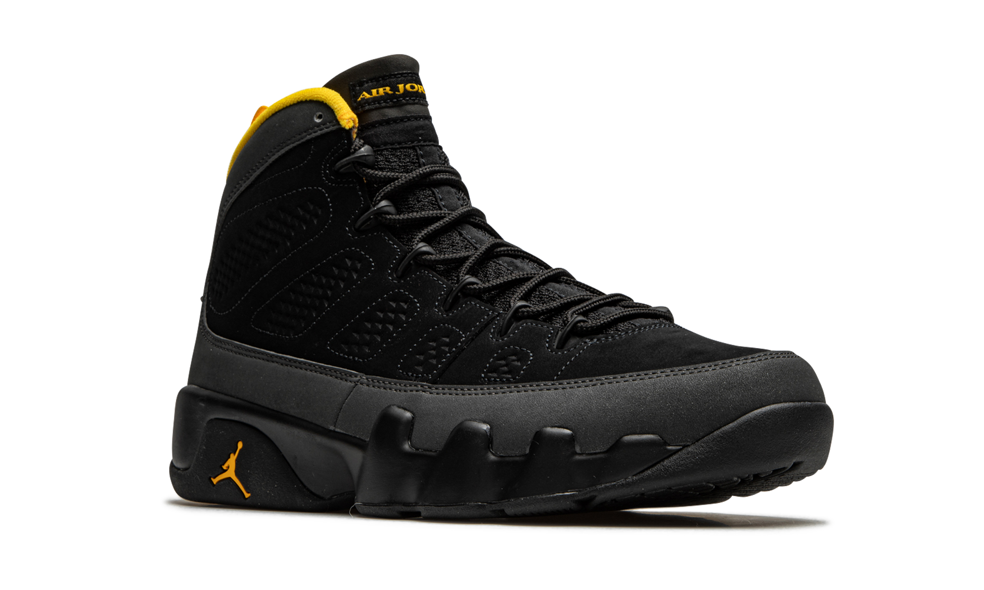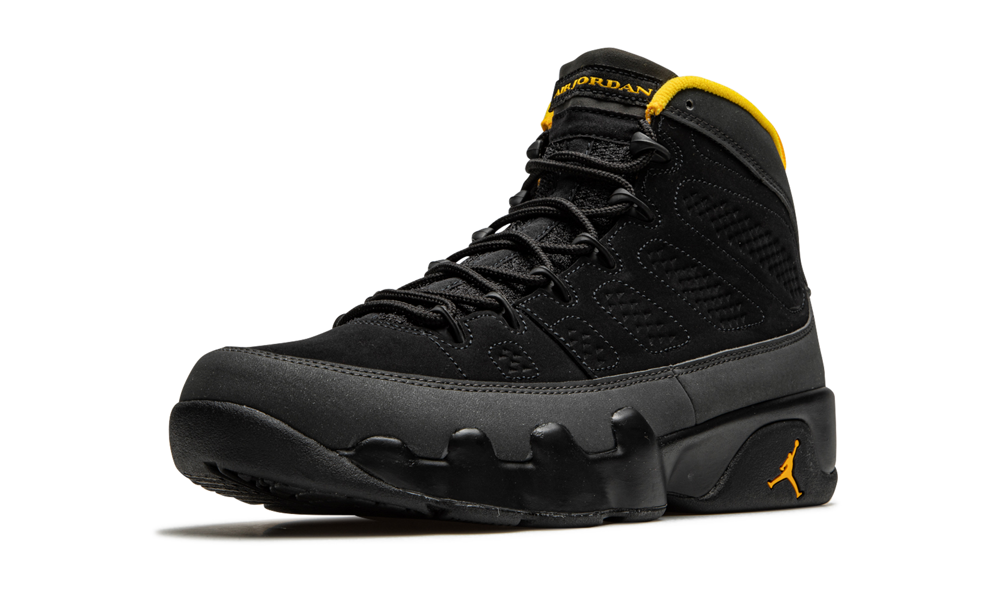 The Air Jordan 9 “University Gold” is a January 2021 colorway of Michael Jordan’s ninth signature shoe. Sneaker collectors may find similarities between the “University Gold” and “Citrus” colorway that originally debuted in July 2010. Like the “Citrus,” the “University Gold” makes use of a predominantly neutral design with subtle pops of orange, or in this case, yellow. That’s where the similarities between the two coveted sneakers comes to an end. The rest of the “University Gold” displays a black synthetic nubuck construction with a “diamond” motif appearing along the medial and lateral sides of the shoe. A grey synthetic nubuck mudguard above the black midsole breaks up the look. Contrasting University Gold accents on the liner, pull tab, and “Air Jordan” branding on the tongue add a subtle but welcoming burst of color to the look. The same yellow hue can be found on the embroidered “23” branding on the heel and Jumpman insignia on the sole. A mini “globe” emblem on the back of the shoe finishes off the design of the Air Jordan 9 “University Gold.” Release date: January 30, 2021. University Gold