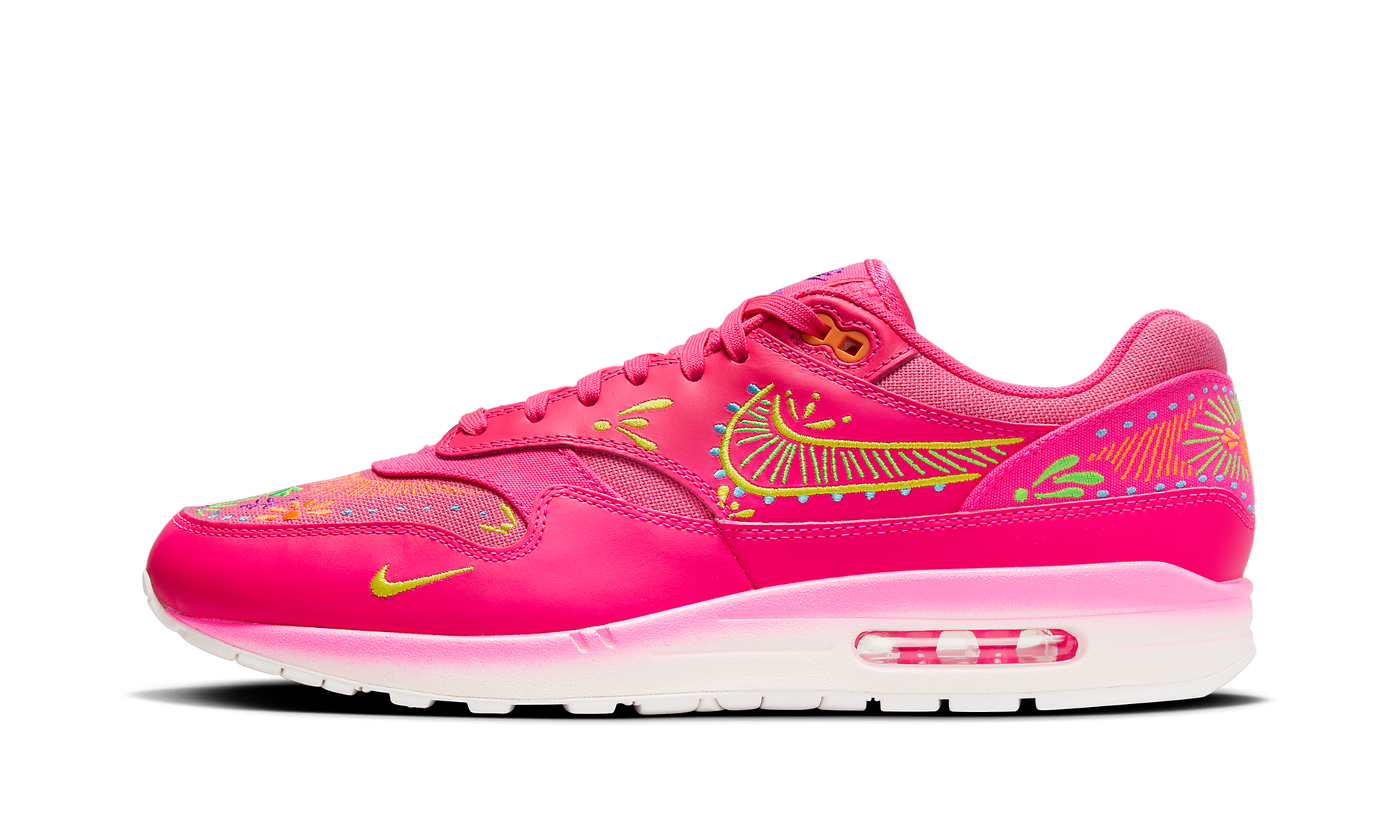 The Nike Air Max 1 "Dia de Muertos" is a colorway of the retro running shoe inspired by the traditional Mexican holiday otherwise known as the Day of the Dead. An eye-grabbing Air Max 1, the “Dia de Muertos” is from a collection of Nike sneakers designed in colors commonly found in traditional floral ofrendas (also known as altars) that are displayed during the holiday to commemorate the lives of those who have transitioned. The upper features a pink textile construction with tonal leather and canvas overlays. An ornate yellow Swoosh appears on the side while sun and floral patterns are seen on the toe and heel. “Familia” branding is found on the insole of the left shoe and “Air Max” detailing is located on the tongue tag. The midsole features a pink-to-white color fade and a visible Air cushioning unit in the heel. Release date: October 21, 2023 Dia De Muertos