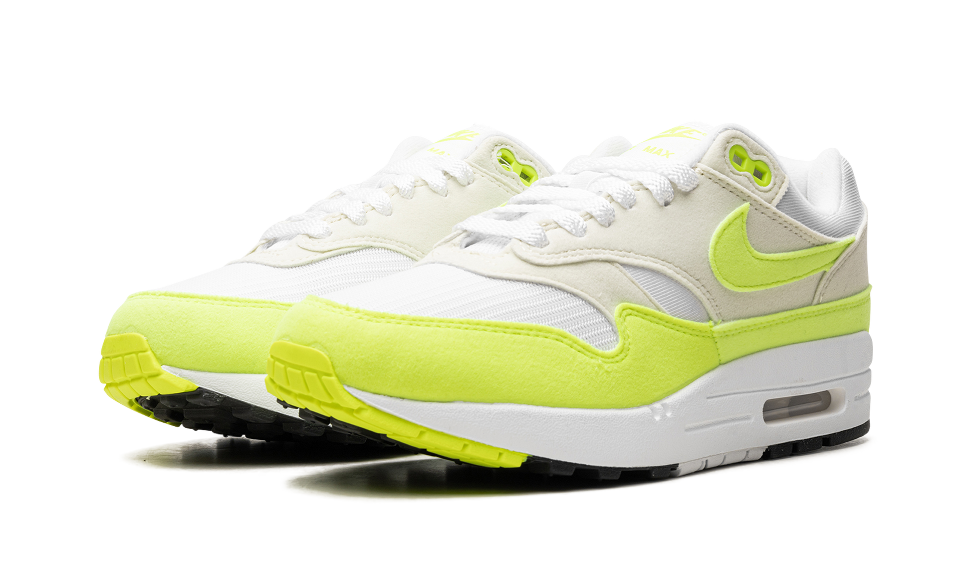 The Women’s Nike Air Max 1 "Volt" is a women’s-exclusive colorway of the retro running shoe with eye-catching neon green accenting. The shoe is complete with a white mesh base that’s contrasted with Volt on the Swoosh and mudguard in a slightly fuzzy felt material. Additional Volt accenting can be found on the top eyelet holes and on the “Nike Air” branding on the heel and on the “Nike Air Max 1” detailing on the tongue tag. A visible Air unit is found in the heel of the white foam midsole. Release date: August 31, 2023 Volt