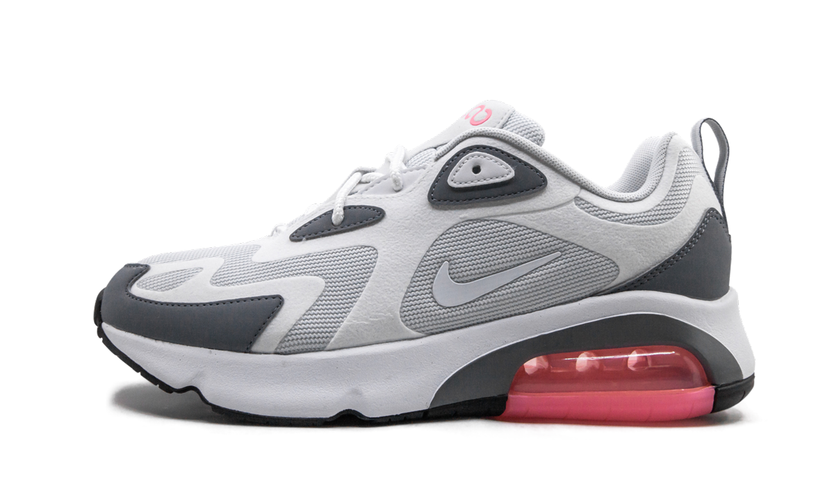 The Nike Air Max 200 is a newer style with design inspiration from energy patterns that radiate from the Earth. The lightweight shoe has a modern mesh frame with TPU material and synthetic skin that creates a sporty aesthetic. The sole unit below the foot provides remarkable cushioning with Cushlon foam and 200% more Air. The colorway is sleek and streamlined with low-key neutrals of white and light grey, while a beautiful touch of pink graces the branding on the tongue, Air bubble unit, and portion of the sole.