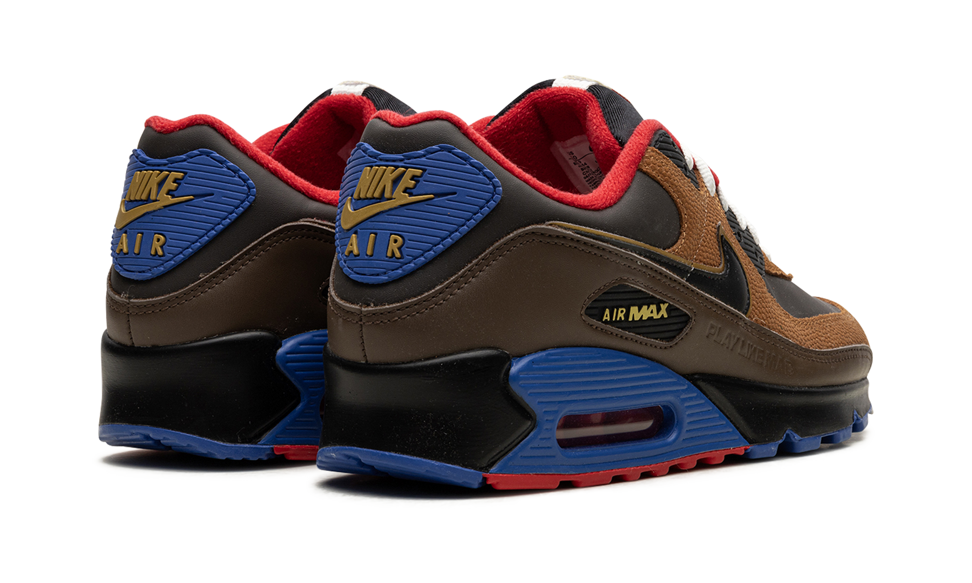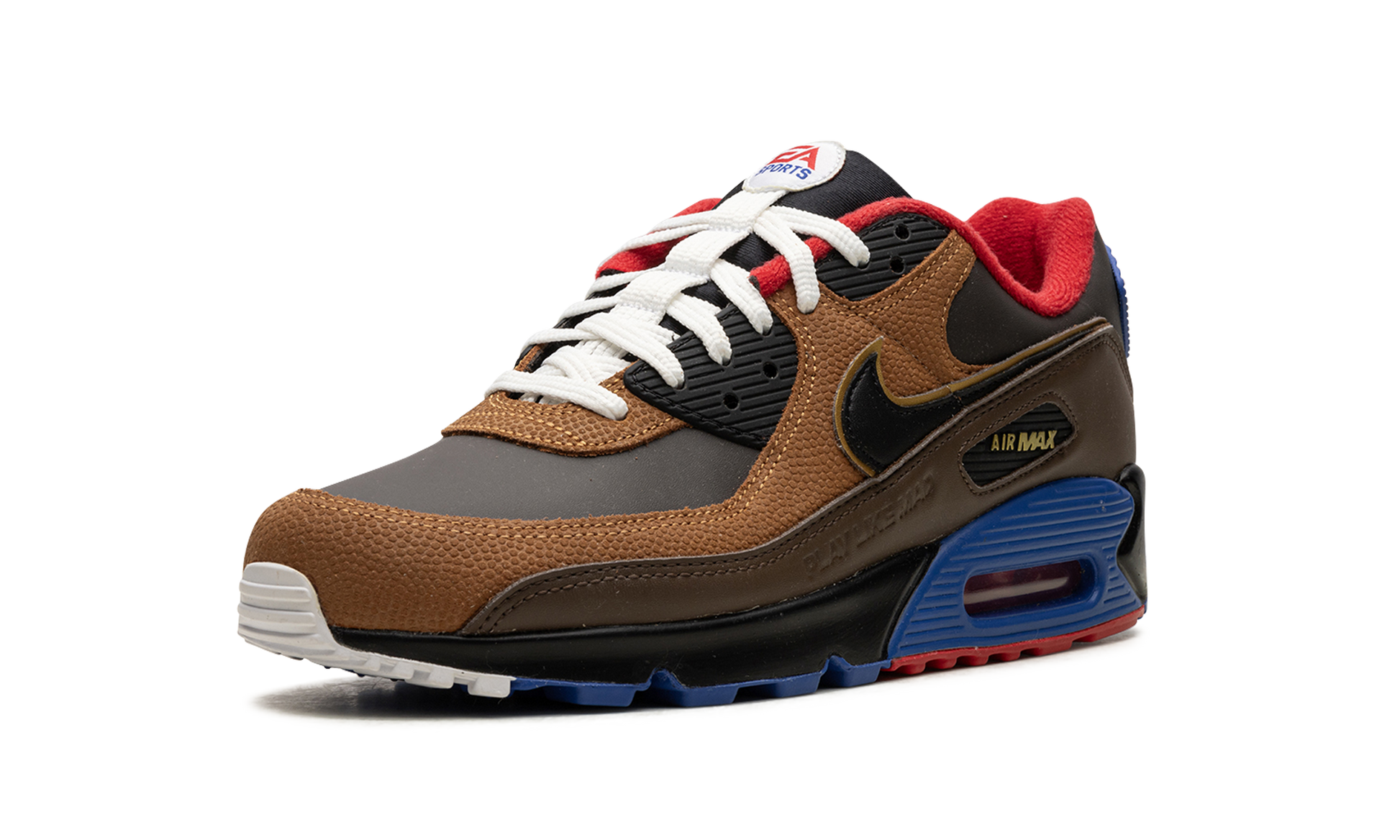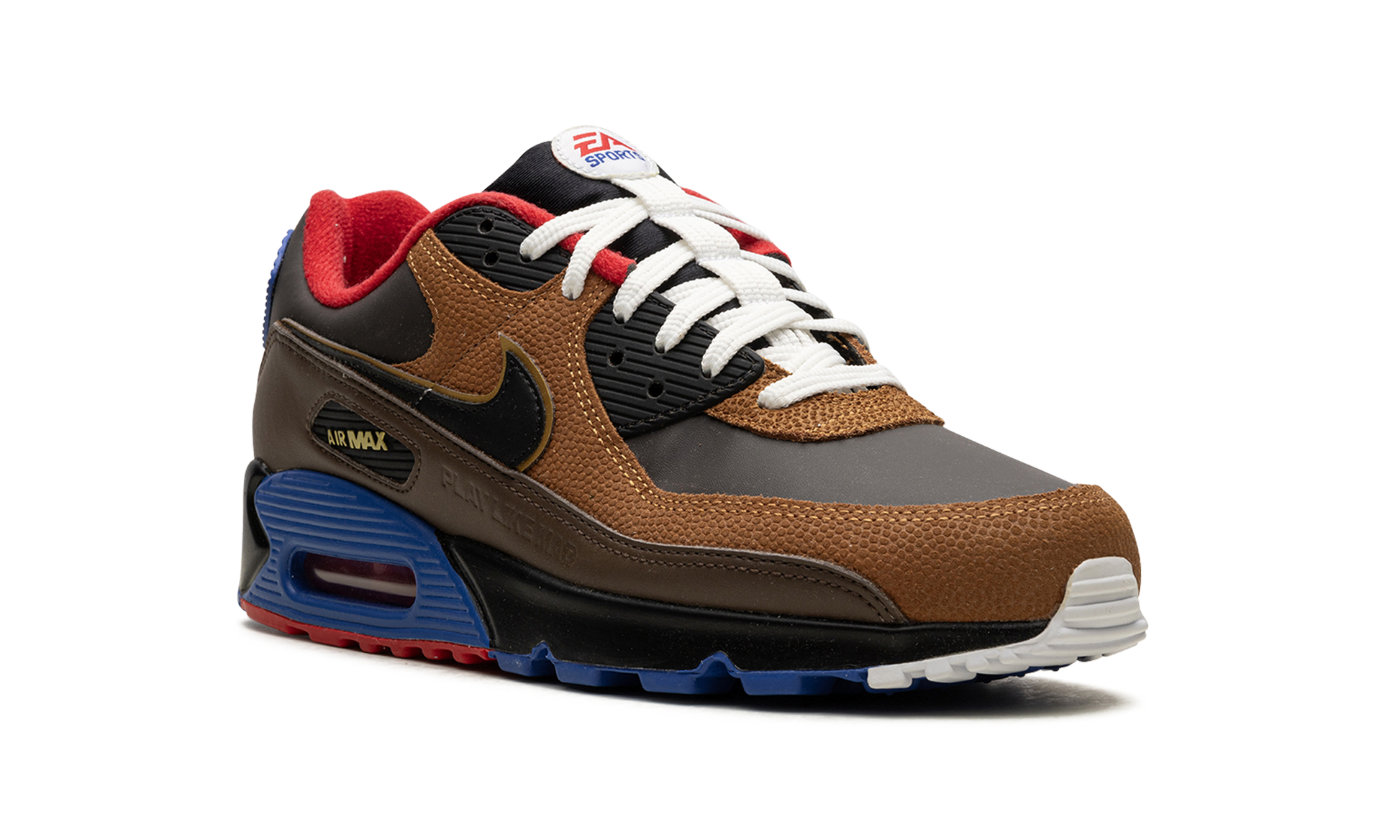 The EA Sports x Nike Air Max 90 "Play Like Mad" is a collaboration by the video game franchise and Nike on a colorway of the retro running shoe inspired Madden NFL 2024. This special team-up between EA Sports and Nike gives the Air Max 90 a football-inspired look with a brown textured leather upper that mimics the dimples of a pigskin football. A dark brown leather base balances out the look. “Play Like Mad,” Madden NFL’s slogan, is debossed on the brown leather mudguard. Classic “Air Max” branding is featured on the lateral side of the heel and on the back of the shoe in gold lettering. The royal blue and red accents found throughout the shoe are a nod to the NFL logo and the Buffalo Bills, the team quarterbacked by Josh Allen, who is the cover athlete on Madden NFL 2024. Release date: August 25, 2023 EA Sports - Play Like Mad