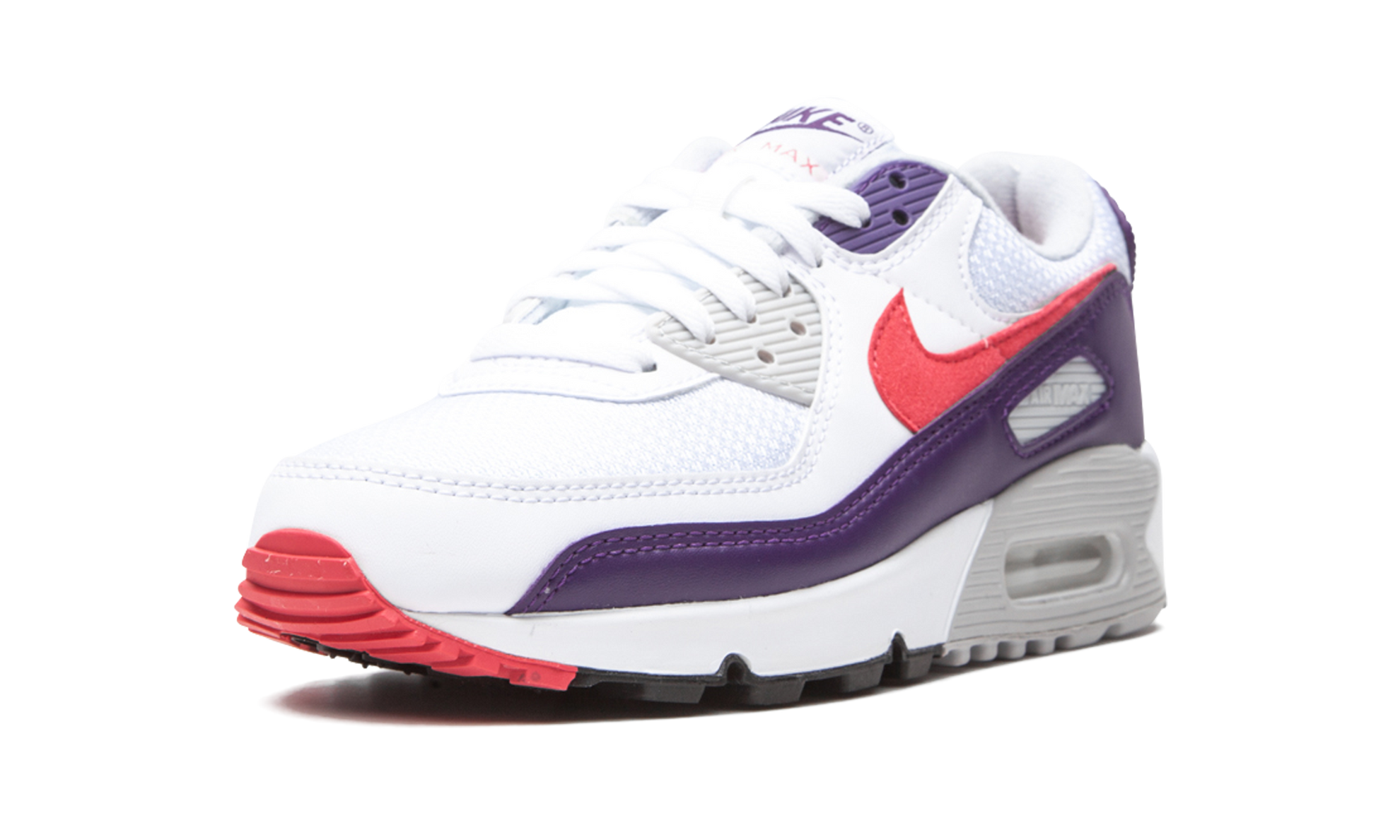 The Women’s Nike Air Max 90 “Eggplant” is the 2020 retro of an original women's colorway of the classic runner. The timeless design was one of several launch makeups that were released in 1990. It returns as part of Nike’s rollout of classic Air Max 90 colorways in honor of the shoe’s 30th anniversary in 2020. White mesh appears on the toe, collar, and heel. Tonal synthetic nubuck overlays can be located on the mid-panel, forefoot, and collar. A fiery red felt Swoosh appears on either side. The same hue of red is used on the “Nike Air” logo on the purple heel tab. Additional Eggplant accenting comes into play on the top eyestay and on the mudguard. A subtle shade of grey dubbed “Zen Grey” by Nike is located on the Air Max branding window and on the detailing that surrounds the visible Air unit in the heel. Release date: October 2, 2020. Eggplant