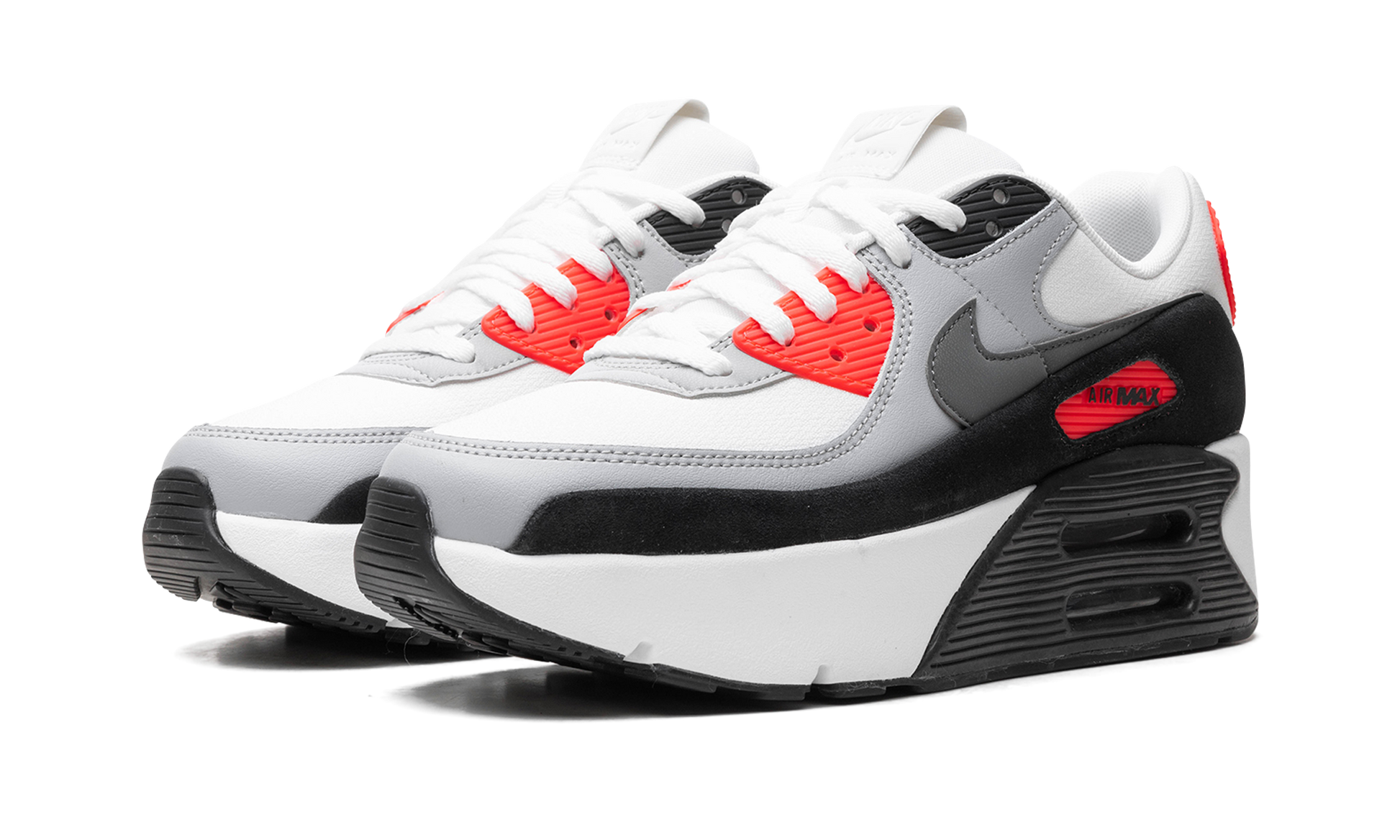The Women’s Nike Air Max 90 Double Stacked "Infrared" is a women’s-exclusive colorway of the retro running shoe with a platform-style sole. The Nike Air Max 90 Double Stacked updates the Air Max 90’s classic design with double-stacked Air units in the heel of the midsole, giving the classic shoe a contemporary look. On the “Infrared” colorway, the shoe features a white textile base and a grey synthetic nubuck mid-panel overlay. An Infrared colored “Air Max” branding window appears on the lateral side of the black leather mudguard, while a smokey Swoosh logo can be seen on both sides of the shoe. A modified “Air” logo appears on the Infrared-colored heel counter, while a debossed “Nike Air” logo can be found on the tongue. As mentioned above, the shoe has stacked Air cushioning units in the heel of the midsole that add a boost in height to the wearer. Infrared
