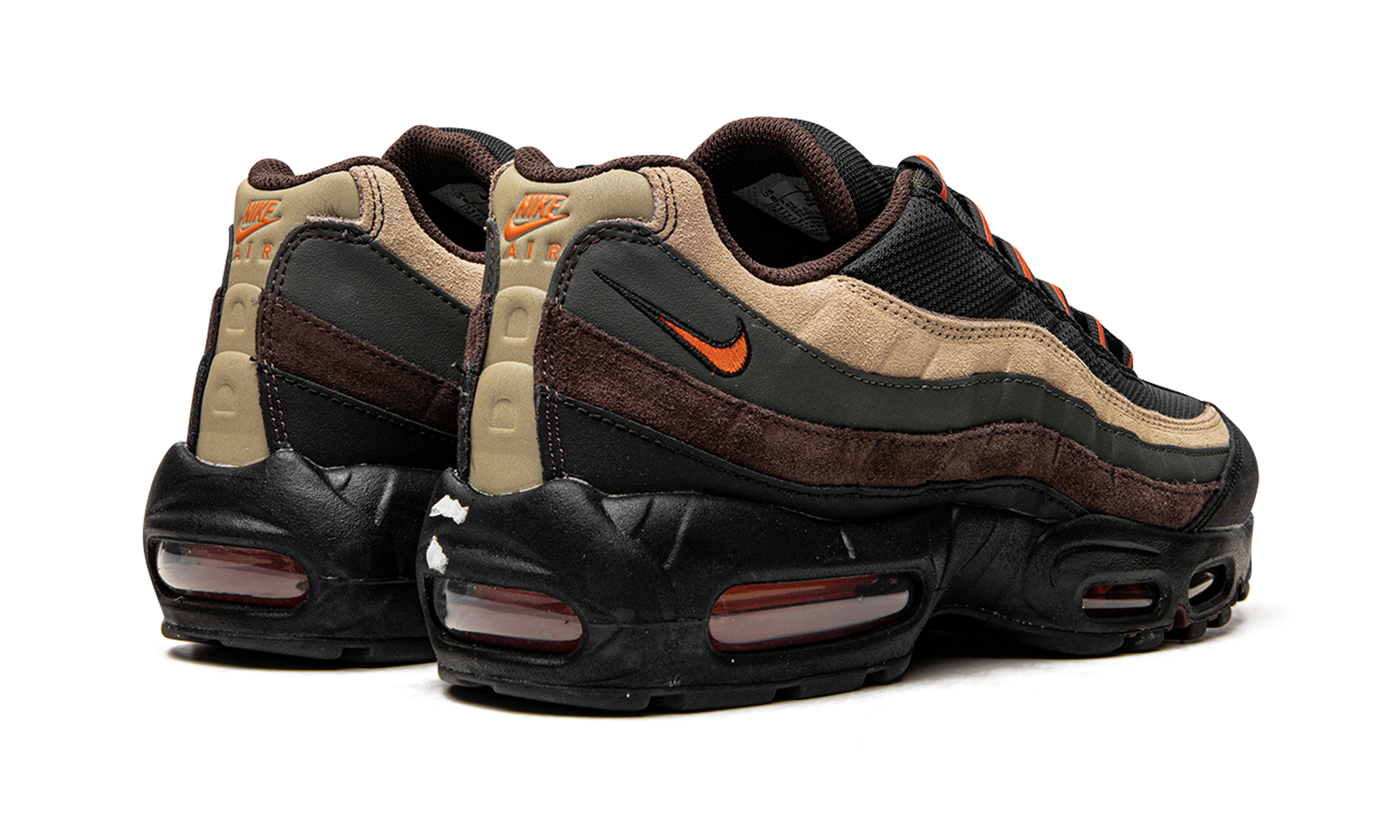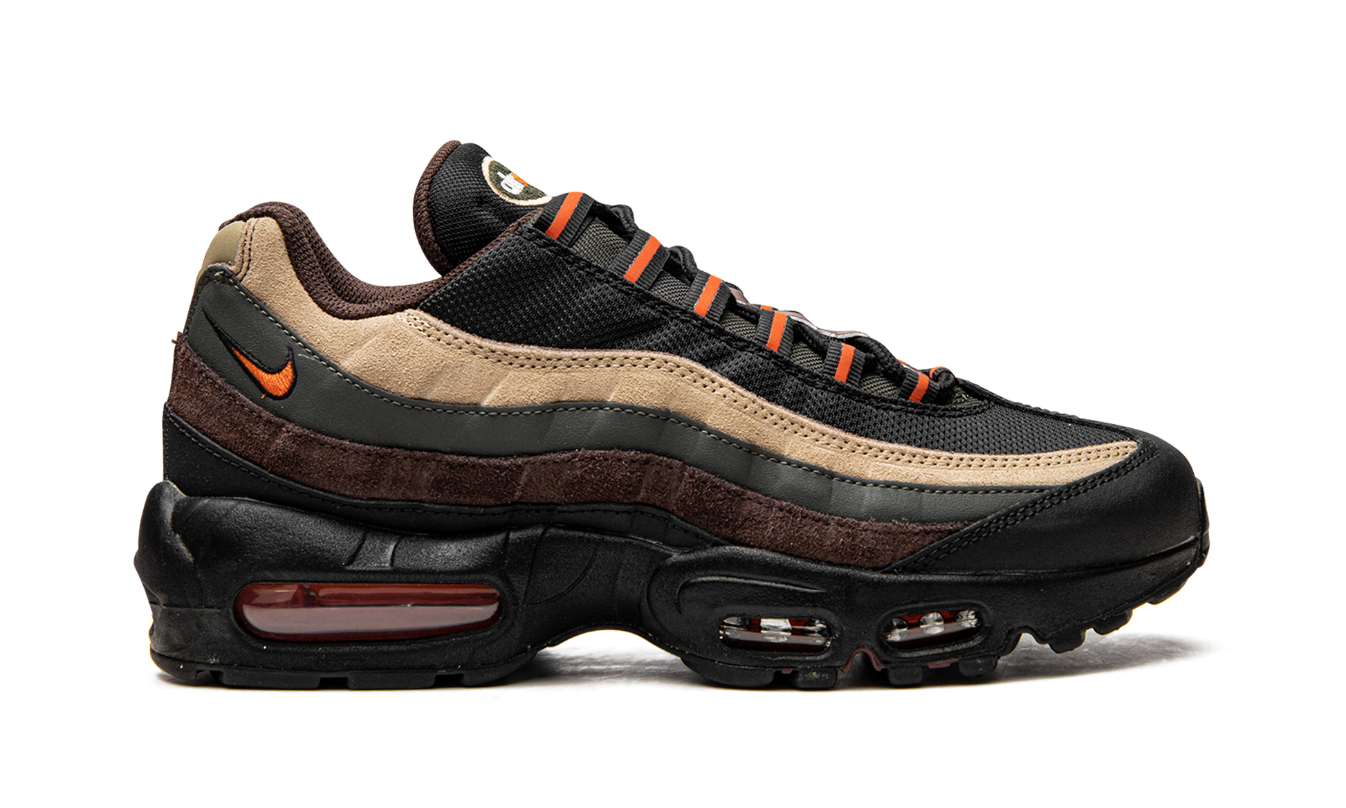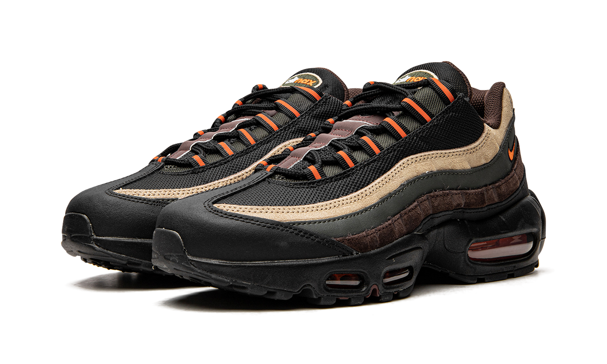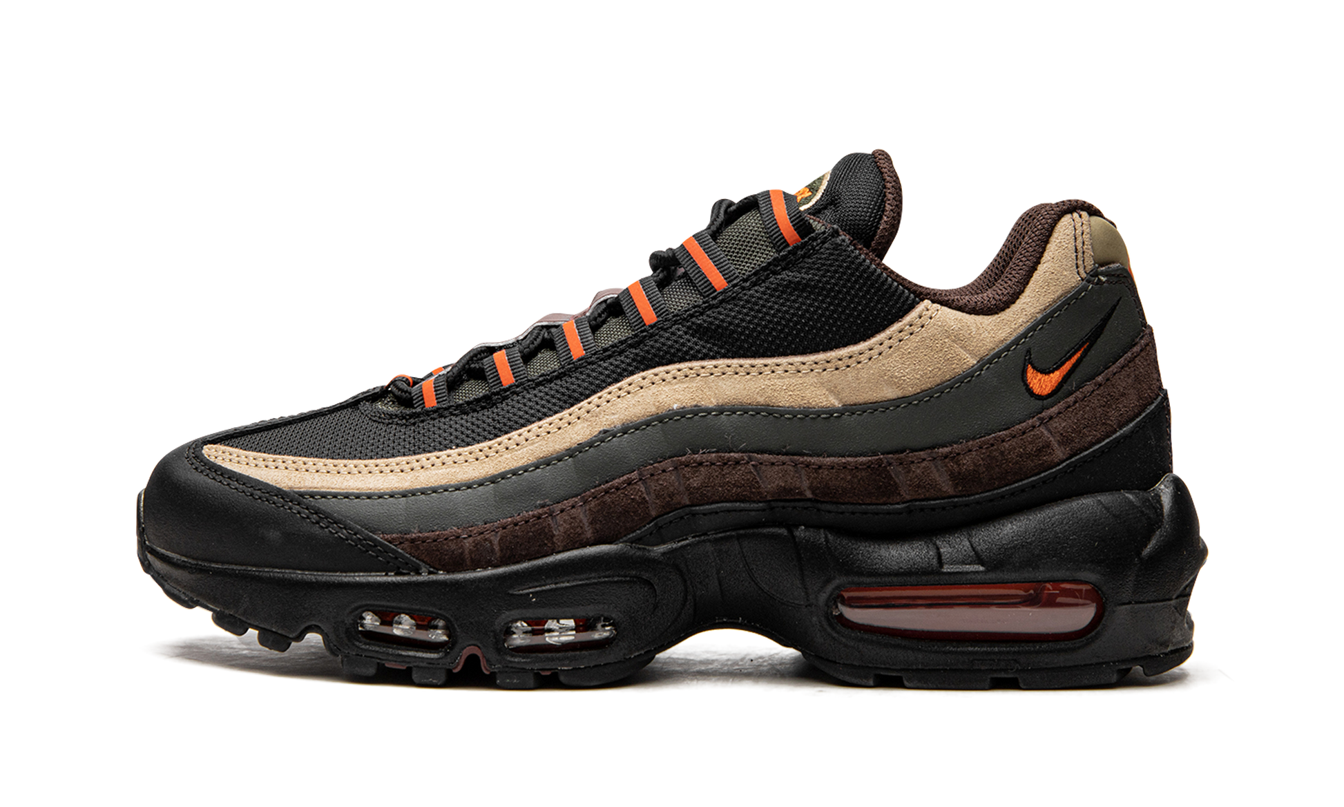 The Nike Air Max 95 “Dark Army” updates the venerable retro running shoe with a rugged, military-inspired vibe. Ideal for wear in the fall and winter, the “Dark Army” version of the Air Max 95 features a variety of earth tone colors across its design. The shoe is complete with a black mesh base that is contrasted with wavy suede and leather panels in tan, olive green, brown, and black. An orange Swoosh logo appears on the lateral side of the collar. Additional orange accenting is found on the black nylon eyelets, giving the shoe an outdoors-inspired design. A black foam midsole with visible Air cushioning in the heel and forefoot completes the look. Release date: February 14, 2022 Dark Army