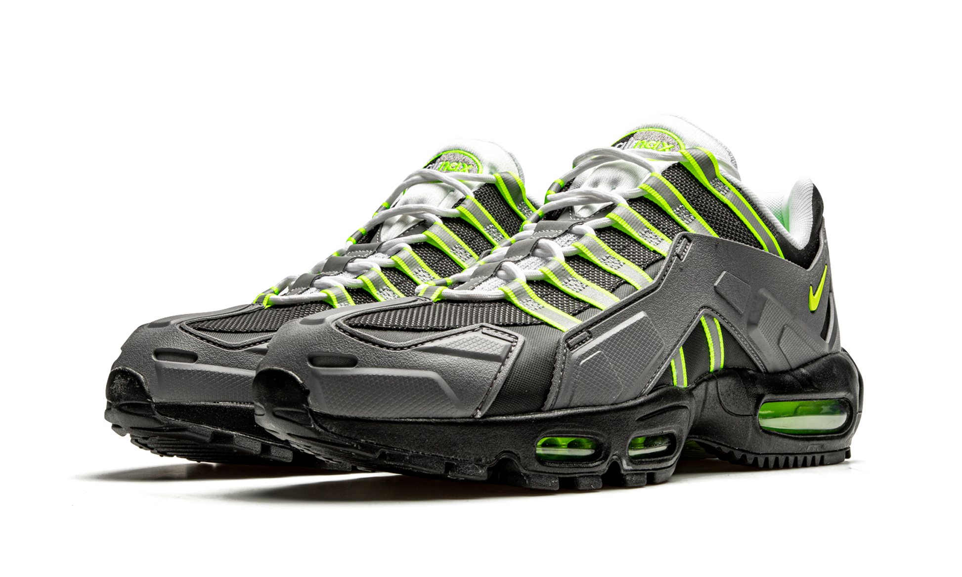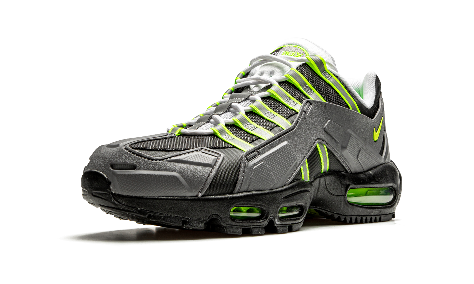 The Nike Air Max 95 NDSTRKT “Neon” is an extra rugged look for the classic performance runner. As its name suggests, the Air Max 95 NDSTRKT (pronounced "Indestruct") updates the low-top silhouette with a durable build that incorporates rubberized overlay panels, reinforced mesh, and leather into one built-to-last design. The rubber overlays come into play along the mid-panel, on the toe, and on the heel. Reflective lace straps assist in supporting the lacing system and extend from the eyelets to the black rubber midsole. A neon green Swoosh appears on the heel and a split Air Max embroidered patch appears on the white tongue. The midsole retains the look of the original "Neon" Air Max 95 with visible neon green tinted Air pods in the forefoot and heel. Release date: January 8, 2021. Neon