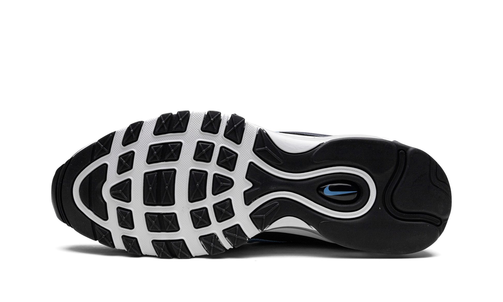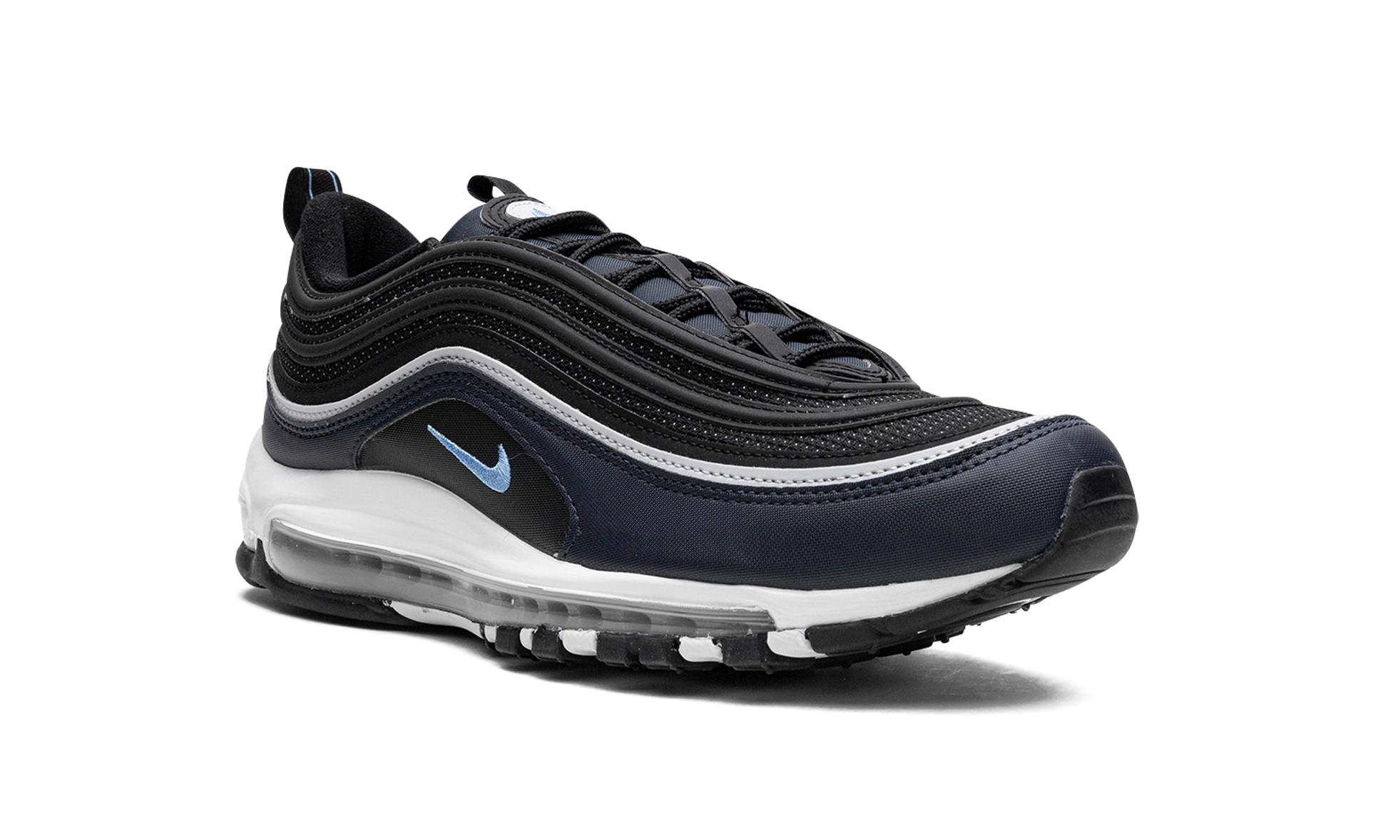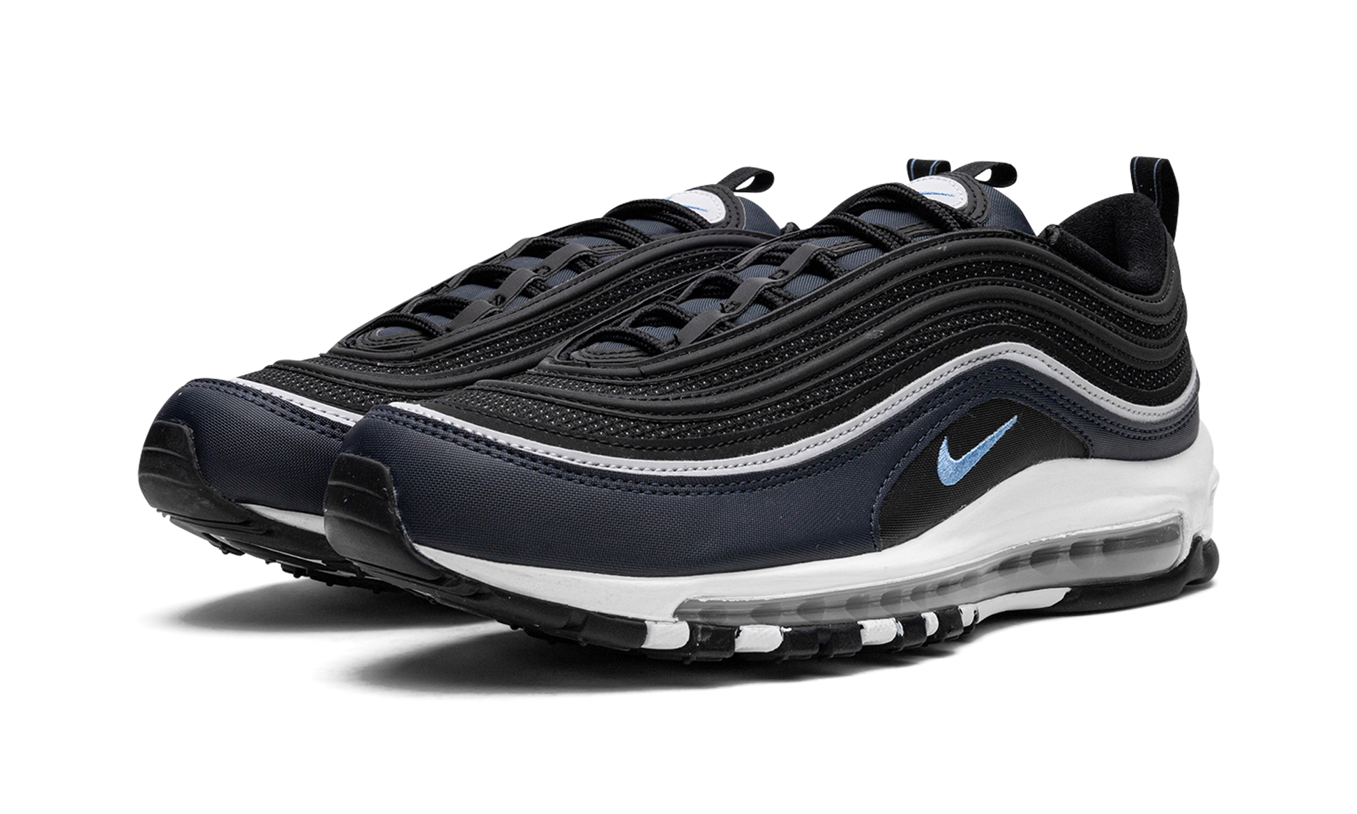 The Nike Air Max 97 “Dark Obsidian” is a colorway of the retro performance running sneaker with dark blue accents. A Spring 2023 release, the “Dark Obsidian” features a black mesh base with Dark Obsidian, or dark navy, on the mudguard. The Air Max 97’s wavy overlays appear in a gradient color scheme that goes from grey to black to blue. A University Blue Swoosh is embroidered on either side. The white foam midsole features a full-length visible Max Air cushioning unit. Dark Obsidian