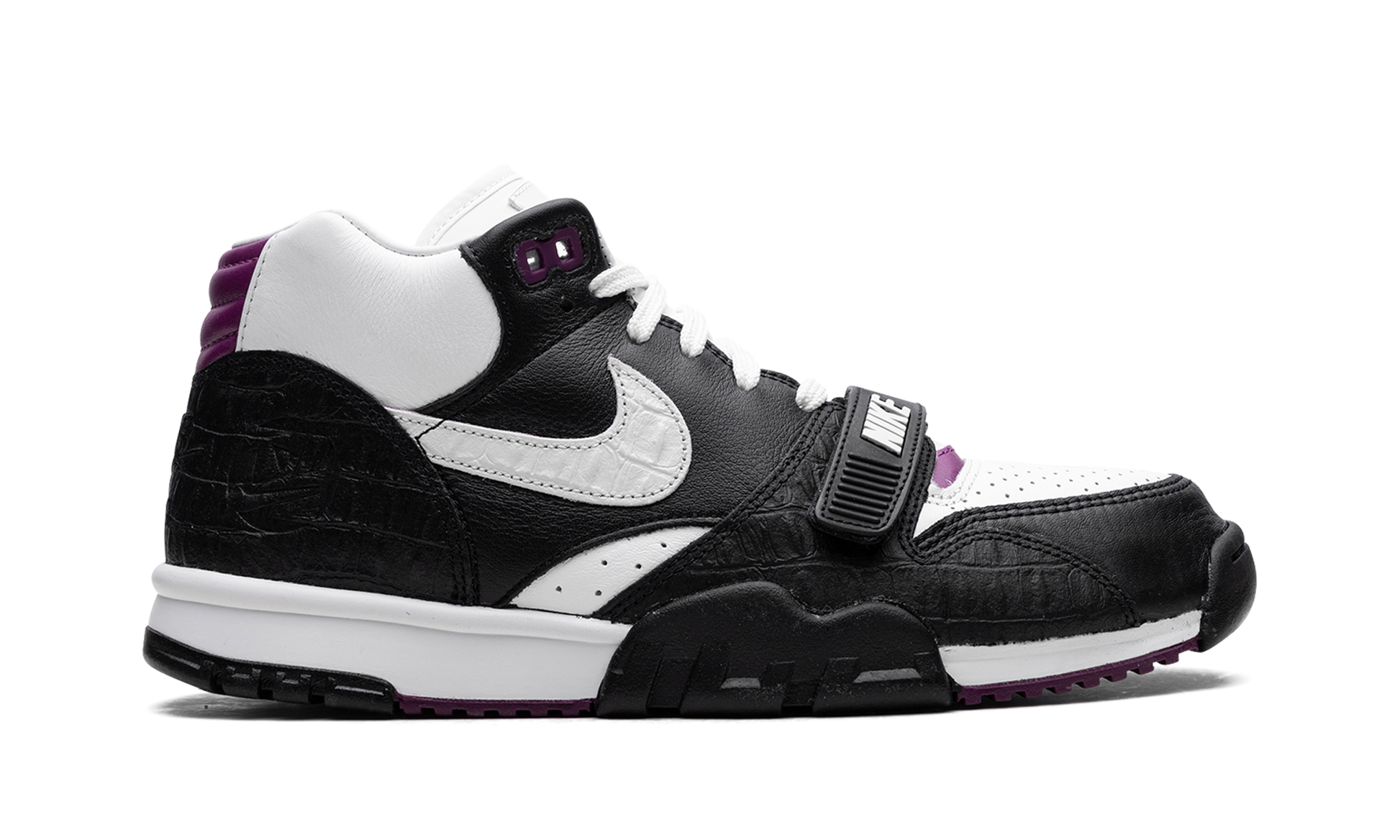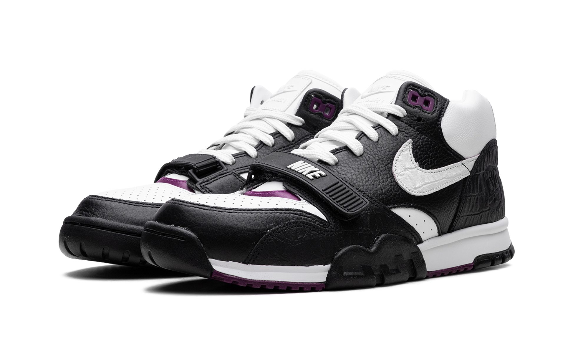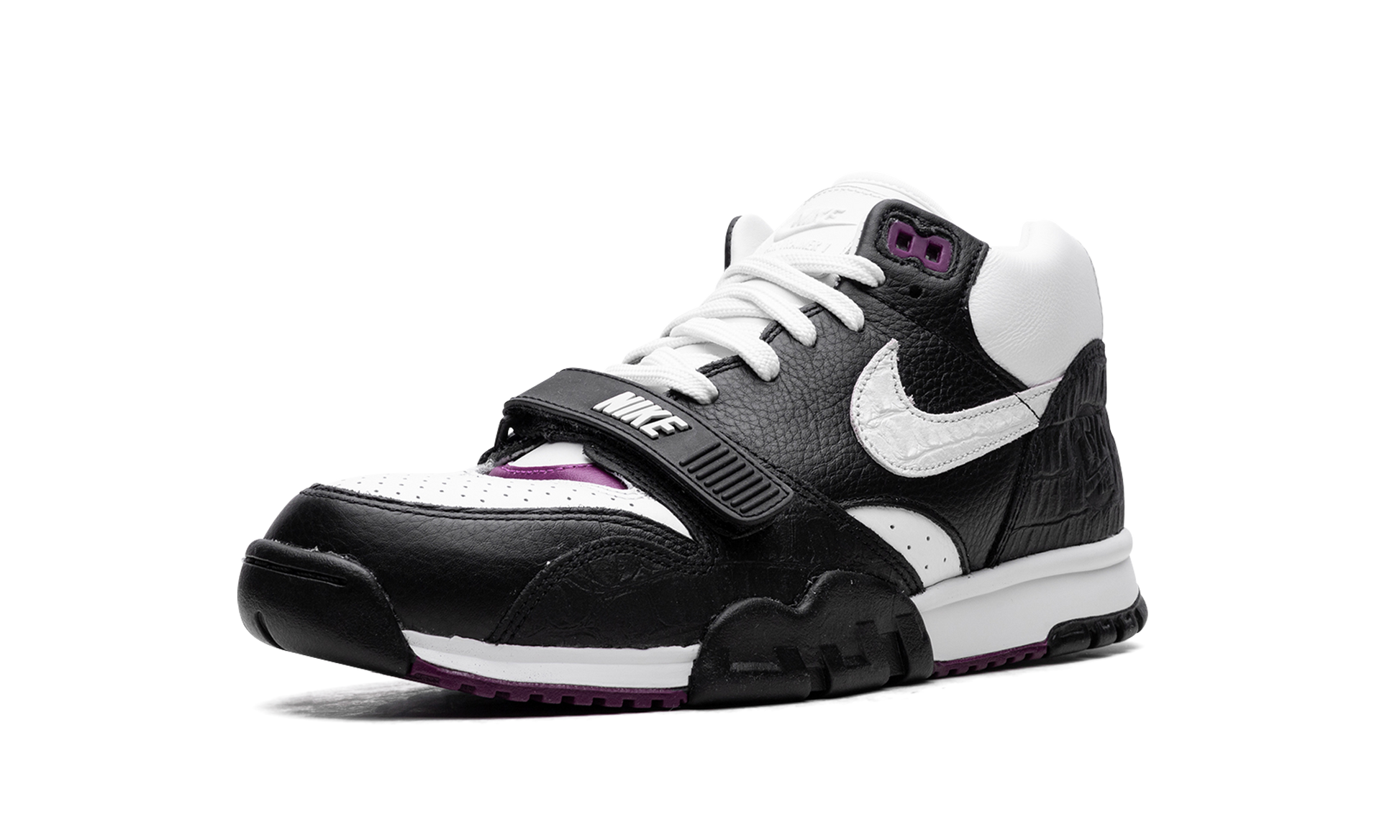 The Nike Air Trainer 1 “Tokyo 2003” is a colorway of the retro cross-training shoe that pays homage to Japanese culture. The “Tokyo 2003” updates the Air Trainer 1 with an easy-on-the-eyes design that is inspired by the vibrancy of Japanese culture. Specifically, the “Tokyo 2003” features a white perforated leather base with contrasting black, reptile-like leather overlays. The white leather Swoosh features an aged aesthetic. Classic “Nike” branding is found on the midfoot strap. Purple accenting appears on the eyelets and on the heel counter. Tokyo 2003