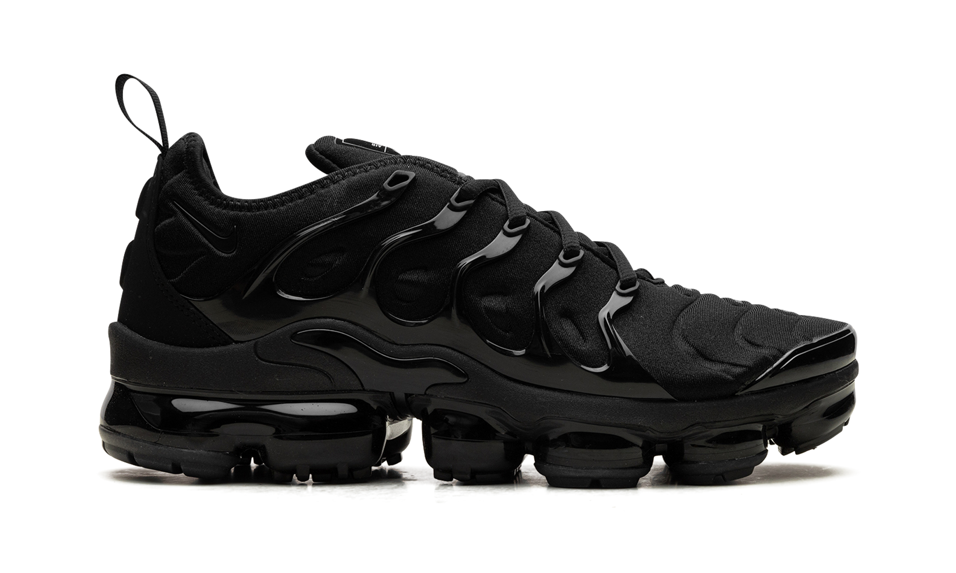 The Nike Air VaporMax Plus "Triple Black" originally released in 2018. It is a fusion model that combine Nike's futuristic VaporMax cushioning system with the design DNA of the popular Nike Air Max Plus. A neoprene upper sporting similar details to the 1998 runner is accented by reflective tabs running up the tongue. A black TPU lacing cage has been added to resemble the represent the overlays on the original Air Max Plus. Special "Vm Air" logos don each heel and insole as a nod to the yellow Tuned Air branding of the OG. Additional branding is kept to a minimum with a small Swoosh stamped on the lateral heel and tonal tongue logo. The Nike Air VaporMax Plus "Triple Black" sits atop a blacked-out VaporMax bubble to complete the stealthy design. Triple Black
