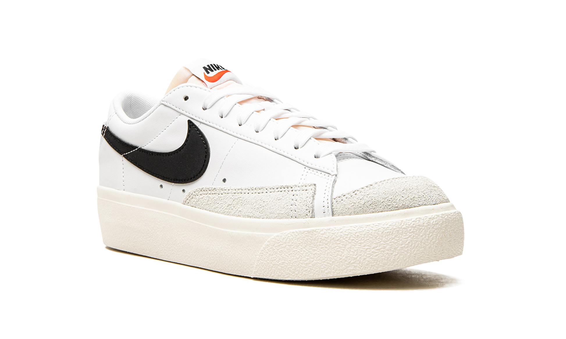 The Women’s Nike Blazer Low Platform “White/Black” is a women’s version of the vintage basketball shoe in a timeless colorway that features a raised platform sole. The casual and versatile Blazer Low Platform is an everyday-wearing style that brings a retro look to an outfit, and adds height to the wearer with its stacked midsole. The upper features a white leather base with contrasting light grey suede overlays on the toe and forefoot. A black leather Swoosh resides on either side and black “Nike” branding is found on the heel. Additional logo detailing includes black “Nike” and orange Swoosh graphics on the tongue. As mentioned, the shoe rides on a platform-style midsole that adds considerable height to the wearer.