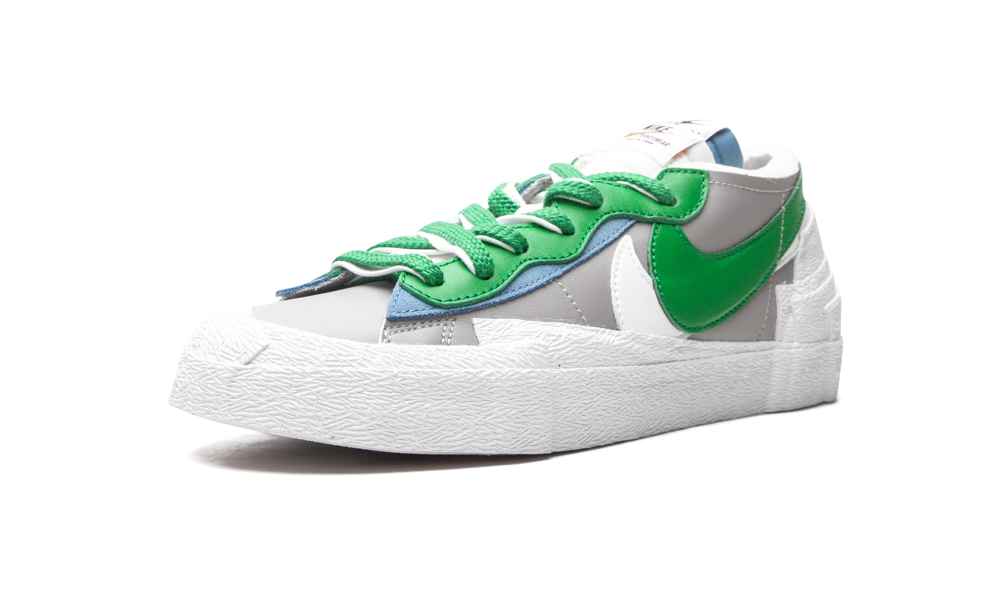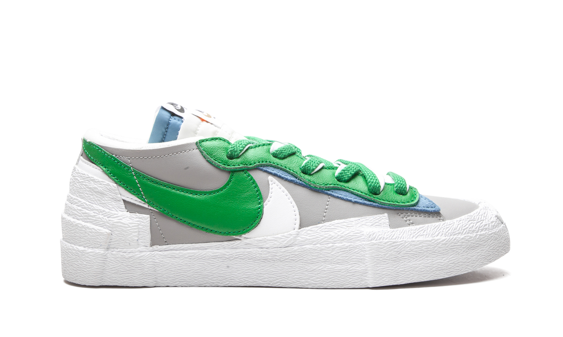 The sacai x Nike Blazer Low “Classic Green” is a Spring 2021 release that follows the high fashion brand’s original collaboration with Nike on the Blazer Mid from 2019. Like all of its partnerships with Nike, sacai’s Blazer Low in the “Classic Green” colorway continues to play with proportions by applying “two” of every design element, including two leather Swooshes in white and Classic Green on both sides of the light grey leather base. Dual laces, one white, one green, can be found layered over a stacked white and light blue nylon tongue with dual “Nike” branded tongue tags. Sacai continues the “two” theme on the eyelets by layering a green leather panel over a light blue leather panel. Four stacked white rubber panels extend from the white vulcanized midsole to cover the lower area of the heel for an abstract look. Release date: Summer 2021 Sacai - Classic Green