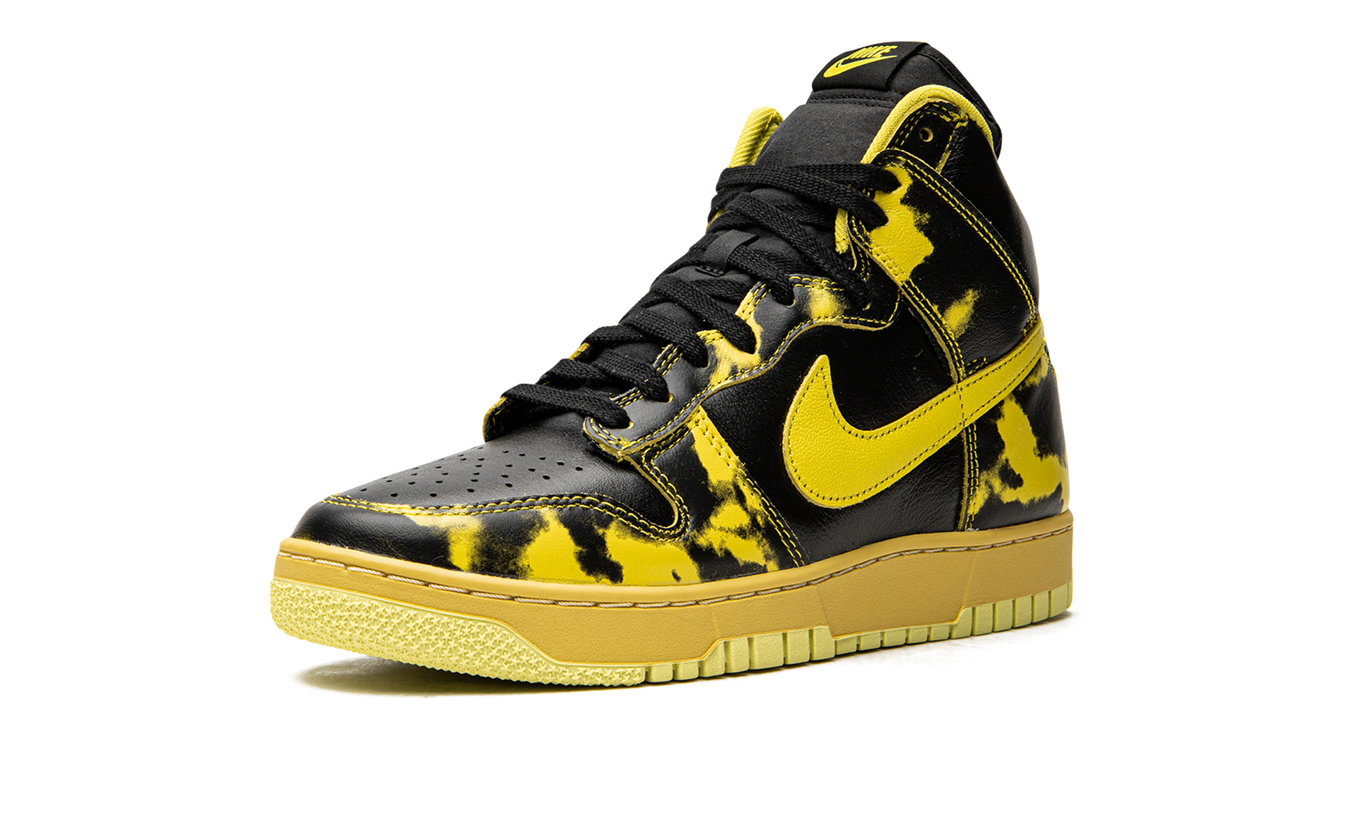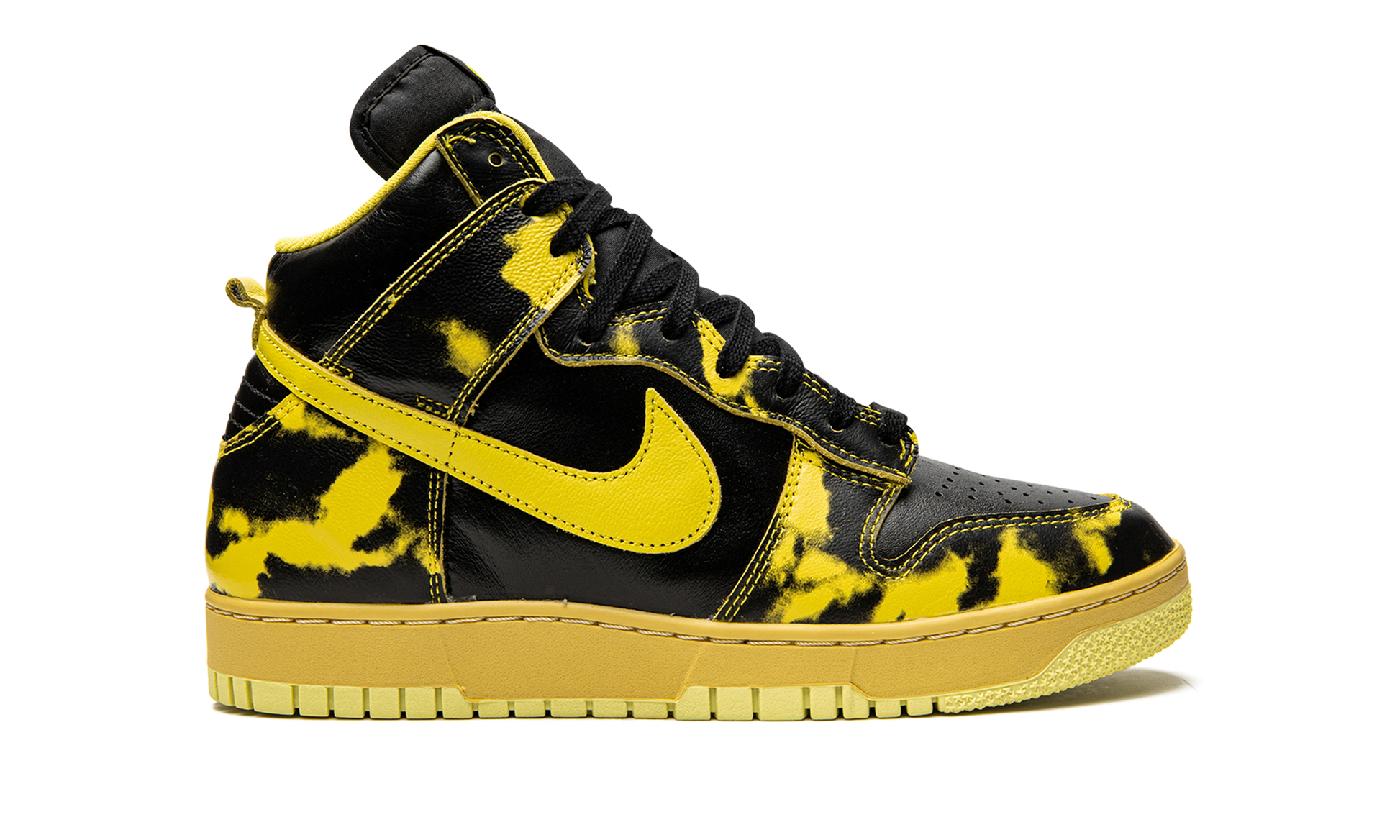 The Nike Dunk High 85 “Yellow Acid Wash” is a modern take on the vintage basketball shoe that replicates the model’s original 1985 shape and look. The “Yellow Acid Wash” is one of several colorways of the Dunk High 85 that have been released since 2021, others being the “Red Acid Wash” and “Orange Acid Wash.” The base, which includes the perforated toe, mid-panel, collar, and heel, is designed in black leather. From there, the panels are displayed in a yellow acid wash. A Varsity Maize leather Swoosh is found on either side of the shoe. The Dunk High 85’s tongue is noticeably taller than the tongue found on more recent editions of the shoe. An old school “Nike” logo with a yellow Swoosh is found on the tongue tag. The rubber midsole is painted yellow to replicate the look of oxidation. Release date: February 23, 2022 Yellow Acid Wash