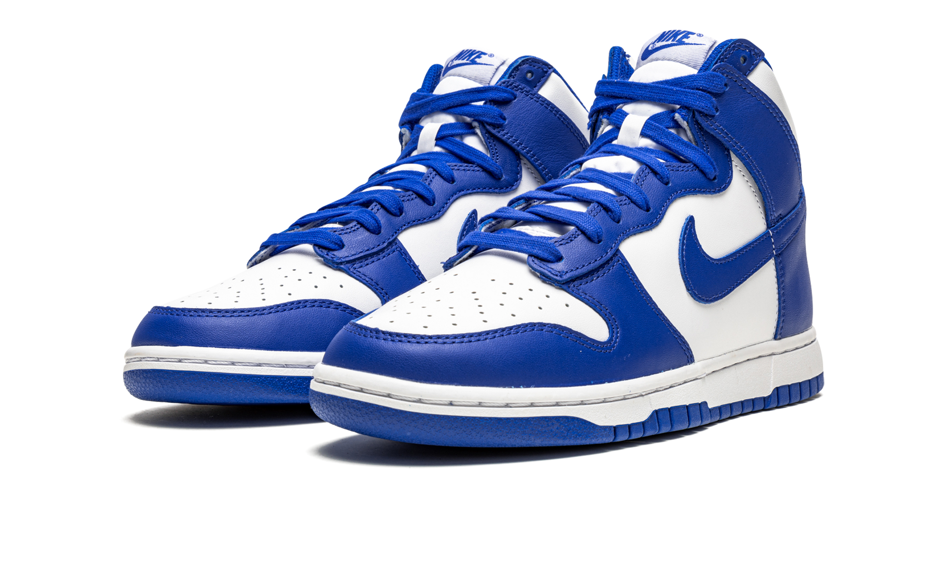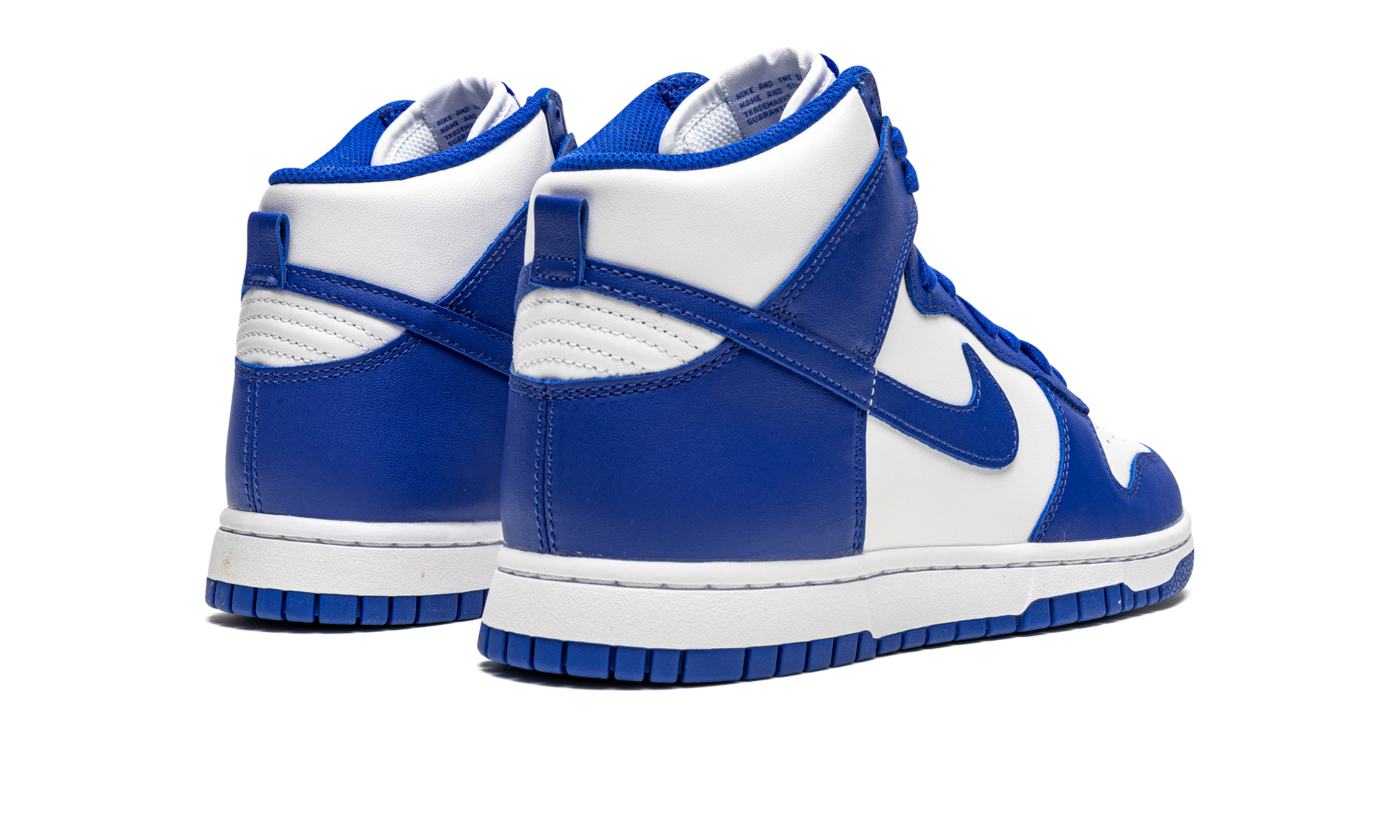 White/blue leather/rubber Dunk High sneakers from NIKE featuring signature Swoosh logo detail, contrasting panel detail, round toe, perforated detailing, front lace-up fastening, ankle-length, branded insole and rubber sole. These styles are supplied by a premium sneaker marketplace. Stocking only the most sought-after footwear, they source and curate some of the most hard to find sneakers from around the world.. Game Royal