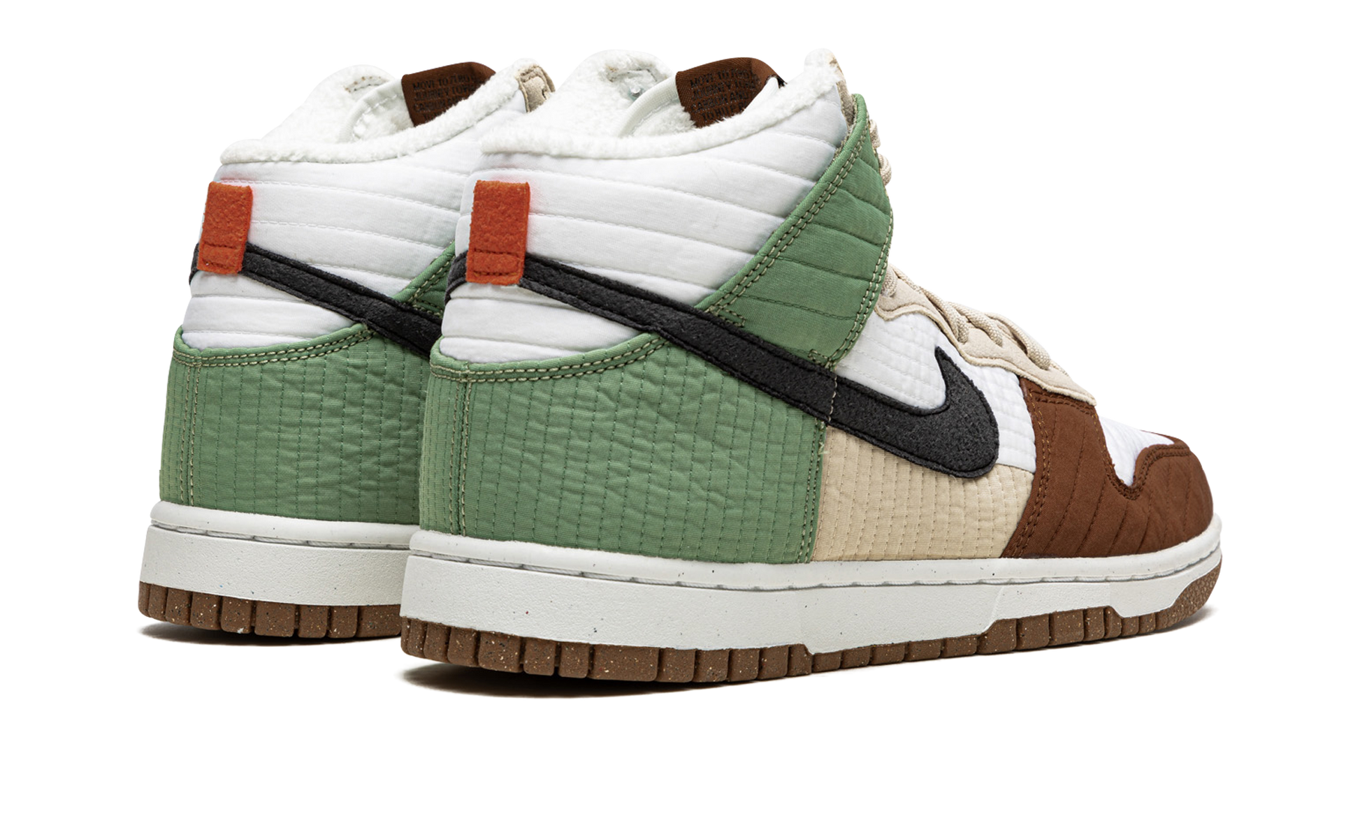 The Women’s Nike Dunk High LX “Toasty” is a winter-ready colorway of the women’s version of the retro basketball shoe that features a modified, eco-friendly construction. Designed to be worn in cold weather, the “Toasty,” as its name implies, is complete with several design updates made specifically for winter. Constructed from 20% recycled content by weight, the shoe displays a quilted textile upper that mimics the look of winter outerwear. Mismatched panels in brown, green, and tan contrast the look of the white and tan base. A black synthetic leather Swoosh appears on both sides of the shoe. The pinwheel graphic printed on the brown tongue tag references the shoe’s sustainable design. A fun-loving “Toasty” graphic appears on the insole as a nod to the warm fleece inner lining. Release date: November 3, 2021 Toasty