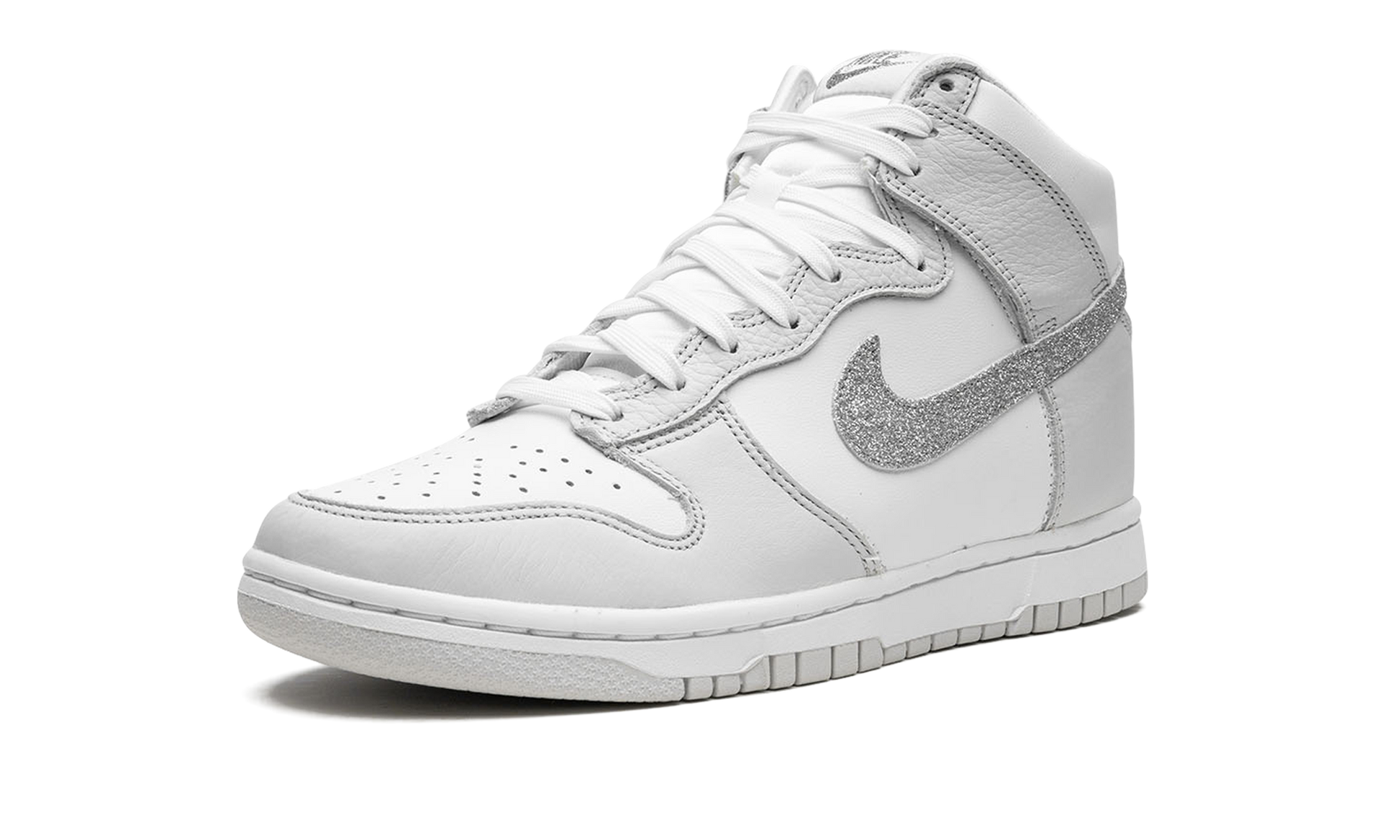 The Women’s Nike Dunk High “Silver Swoosh” is a women’s-exclusive colorway of the vintage basketball sneaker with a bold Swoosh logo. Great for casual, everyday wear, the Dunk High’s “Silver Swoosh” colorway features a low contrast color scheme with white leather on the base and light grey on the overlays. A glittery metallic silver Swoosh logo can be found on the sides of the sneaker. Classic “Nike” detailing appears on the tongue. Underfoot, the shoe is complete with a white rubber midsole and grey outsole. Silver Swoosh