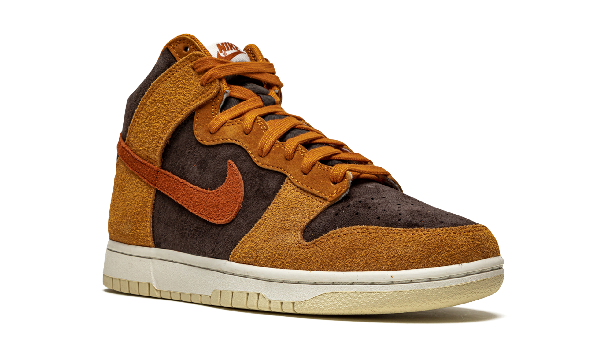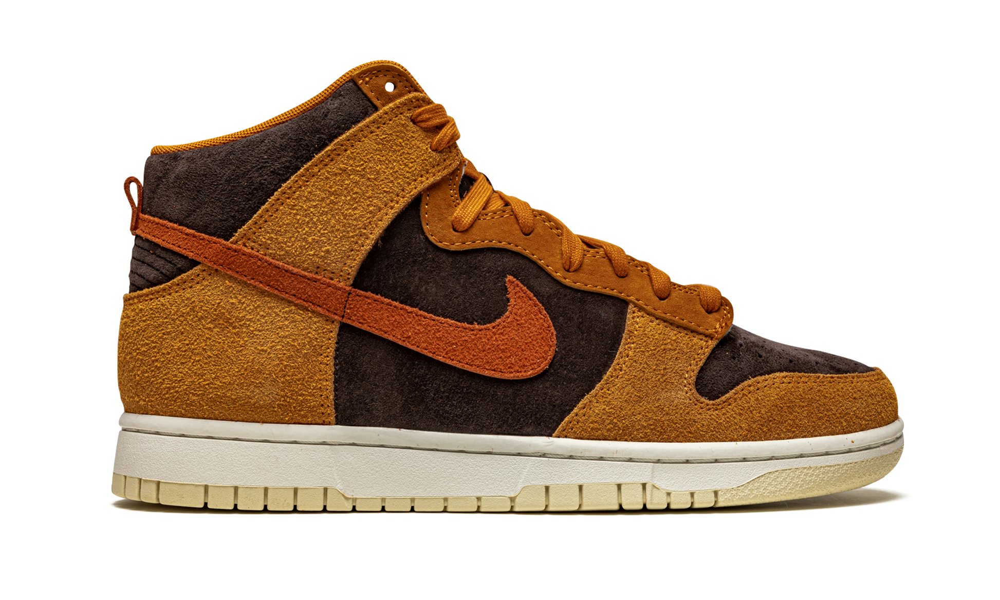 The Nike Dunk High “Dark Curry” puts an appealing lifestyle look on the timeless high-top shoe. The “Dark Curry” was released in March 2021 and exemplifies Nike’s efforts of expanding the Dunk’s footprint in sneakers. A year earlier, in 2020, the Nike Dunk re-emerged from relative obscurity to once again capture the attention of sneaker collectors due to an impressive amount of limited edition collaborations and returning retro colorways. As for the design of the “Dark Curry,” hairy orange-brown suede overlays on the model’s forefoot, eyelets, collar, and heel contrast the black brushed suede base. A darker shade of brown suede can be found on the Swoosh branding on either side and on the small pull tab on the heel. Nike layers brown laces over the black mesh tongue and adds a midsole for a timeless look. Underfoot, a tan outsole finishes off the look of the “Dark Curry.” Release date: March 5, 2021. Dark Curry