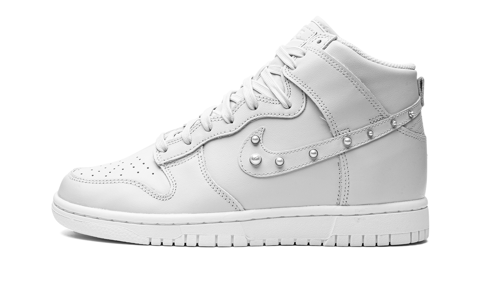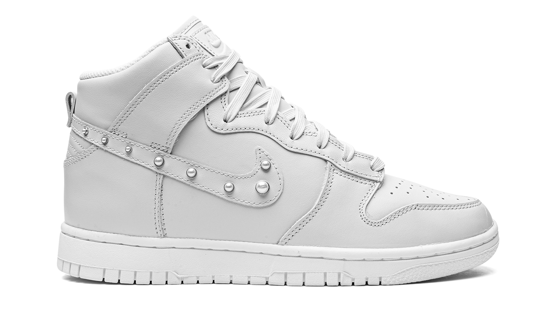 Nike adds a feminine touch to the Dunk collection with the Women’s Nike Dunk High “Pearls.” This unique edition of the Dunk features an entirely monochromatic upper with a soft grey tone. The leather exterior, soft interior and even the lacing is all unified with this shade, while a solid white sole further adds to the clean, neutral vibe. Pearl studs appear along the entire length of the Swoosh logo on each lateral side. Dons Pearls