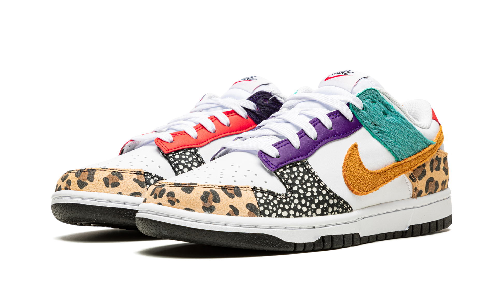 The Women’s Nike Dunk Low “Animal” is a women’s release of the popular sneaker in a colorway that combines multiple animal patterns and textures on its design. From Nike’s Spring 2022 release cycle, the “Animal” Dunk Low is one of the most eclectic looks of the shoe to release yet. The toe cap and heel are designed in cheetah print while a panel near the collar above the side Swoosh is detailed in faux-pony-hair in teal on the left shoe and purple on the right. Nike’s classic Safari pattern is found near each toe. The wild design also features mismatched burnt orange and teal suede Swooshes on each side of the left and right shoe. Two different colored heel tabs with “Nike” branding continue the bold look. Safari Mix