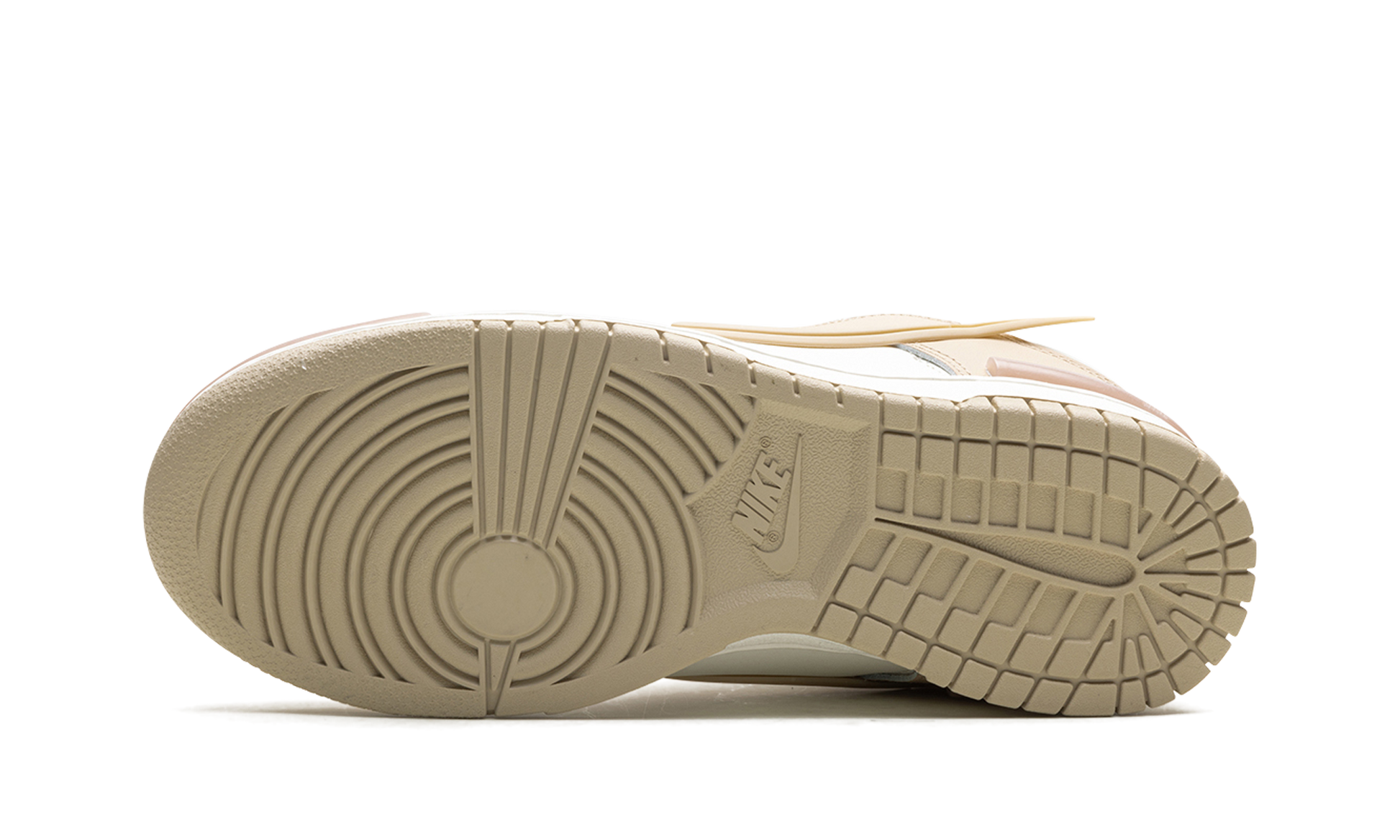 The Women’s Nike Dunk Low Twist "Sanddrift" is a women’s-exclusive colorway of the retro sneaker with a contemporary spin. The Dunk Low Twist modifies the Dunk’s design with unique details, including bumpers on the toe and heel and a partially detached Swoosh. On the “Sanddrift,” the shoe has a white leather base with Sanddrift, or tan, leather overlay panels. Two plastic “bumpers” are found on the front and back of the shoe above the rubber midsole. A puffy Nike logo is found on the tongue. Sanddrift