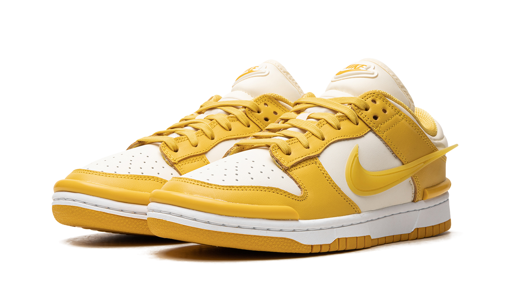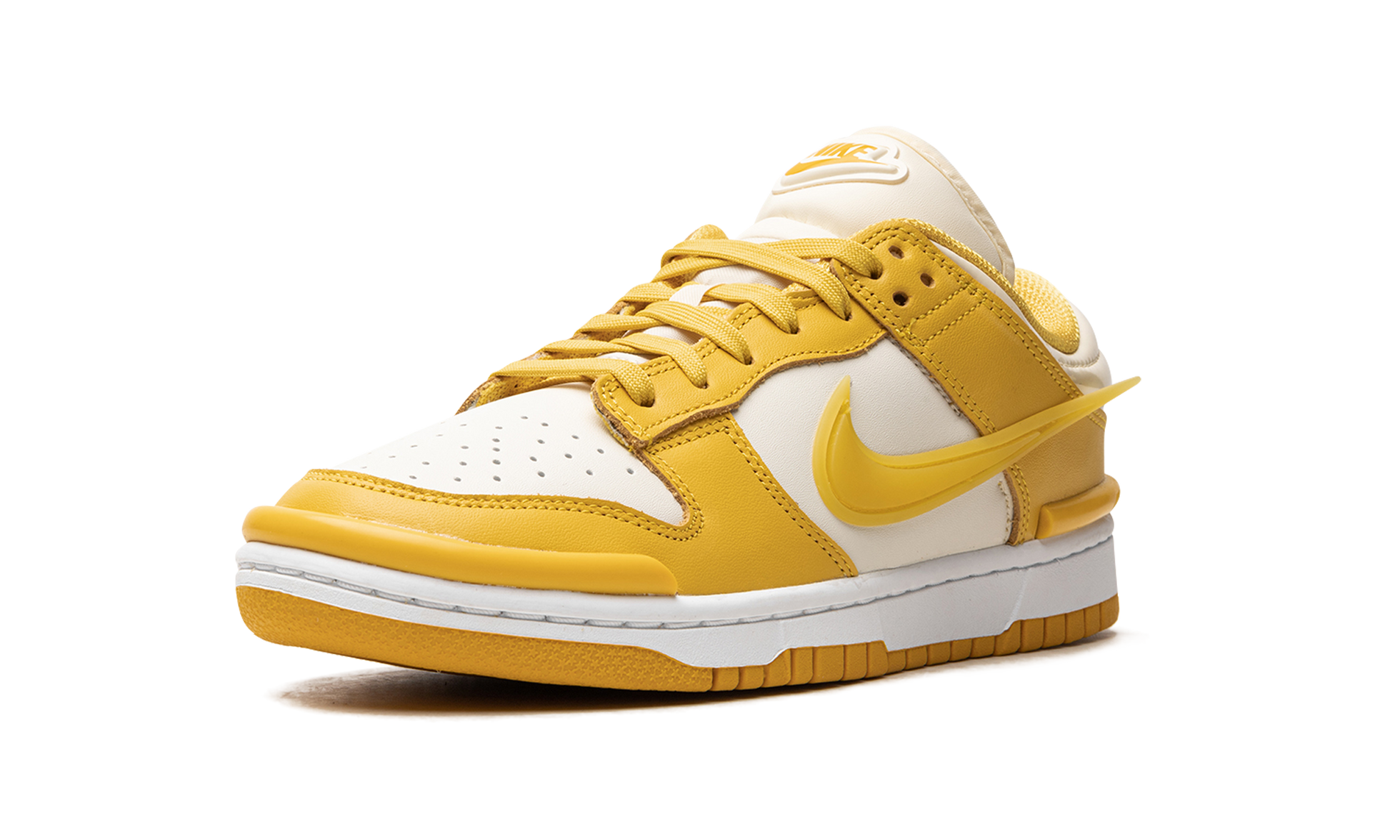 The Women’s Nike Dunk Low Twist "Vivid Sulfur" is a women’s-exclusive colorway of the retro basketball sneaker with a modified design. The Dunk Low Twist updates the classic shoe’s look with unique features that include bumpers on the toe and heel, and detached Swooshes on the sides. A Coconut Milk-colored leather base is paired with Vivid Sulfur leather overlays. A raised “Nike” logo is seen on the tongue. A white rubber midsole and orange rubber outsole complete this eye-catching Dunk. Vivid Sulfur