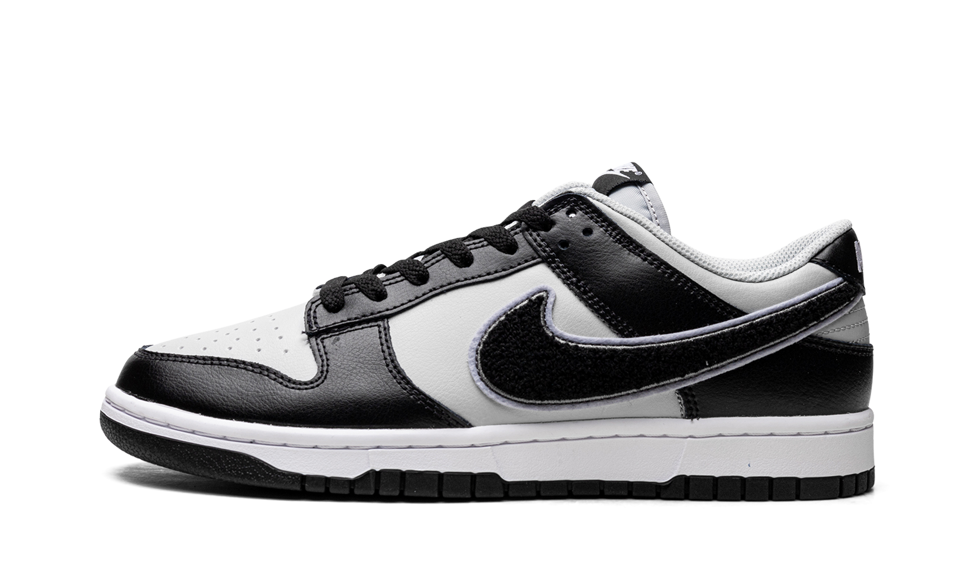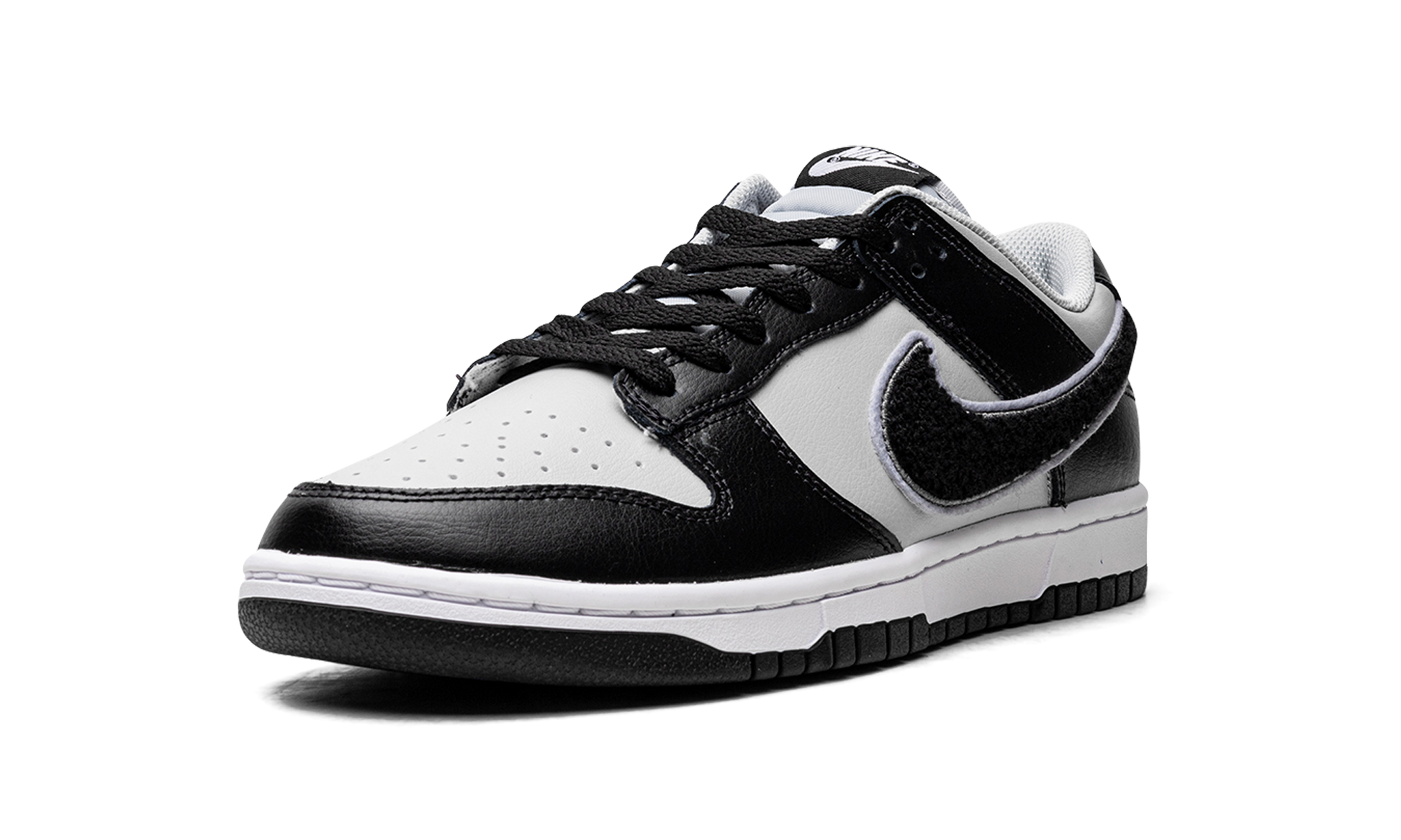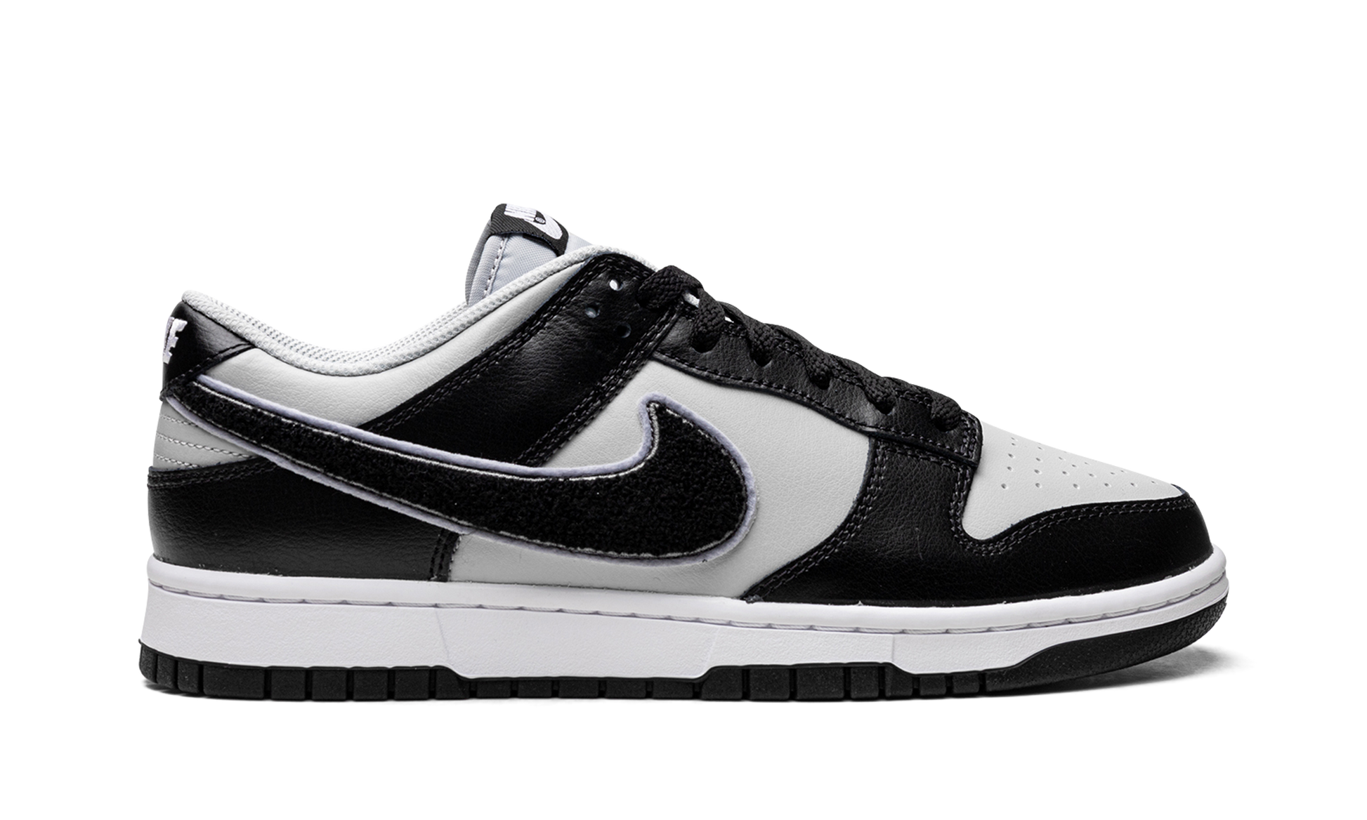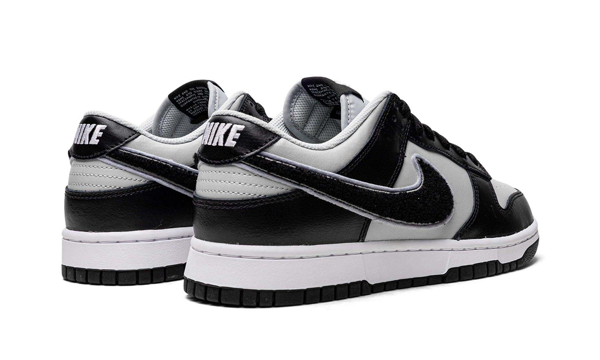 The Nike Dunk Low “Chenille Swoosh - Black/Grey” is a modified version of the retro basketball shoe with a unique chenille Swoosh logo on its design. A versatile look for the Dunk, the “Chenille Swoosh - Black/Grey” features grey leather on its perforated toe, mid-panel, collar, and heel with contrasting black leather overlays. A black chenille Swoosh appears on both sides of the shoe. Grey “Nike” branding is embroidered on the heel and grey “Nike” and Swoosh logos appear on the tongue tag. The white midsole is paired with a black rubber outsole. Release date: October 27, 2022 Chenille Swoosh Black Grey