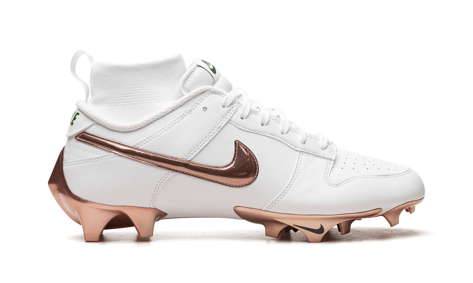 The Nike Dunk Low Cleats "Kyler Murray" is a cleated version of the retro basketball shoe made for NFL quarterback Kyler Murray. Appearing as a stylized version of the Nike Vapor Edge Pro 360 2, the Dunk Low Cleats feature Murray’s signature branding on the sockliner. A white leather base allows for a bronze Swoosh to garner attention on the side. Green “Nike” detailing appears on both the heel and tongue. Murray’s signature Nike branding can be found on the medial heel. Underfoot, metallic bronze TPU spikes provide grip on the football field. Release date: November 10, 2023 Kyler Murray