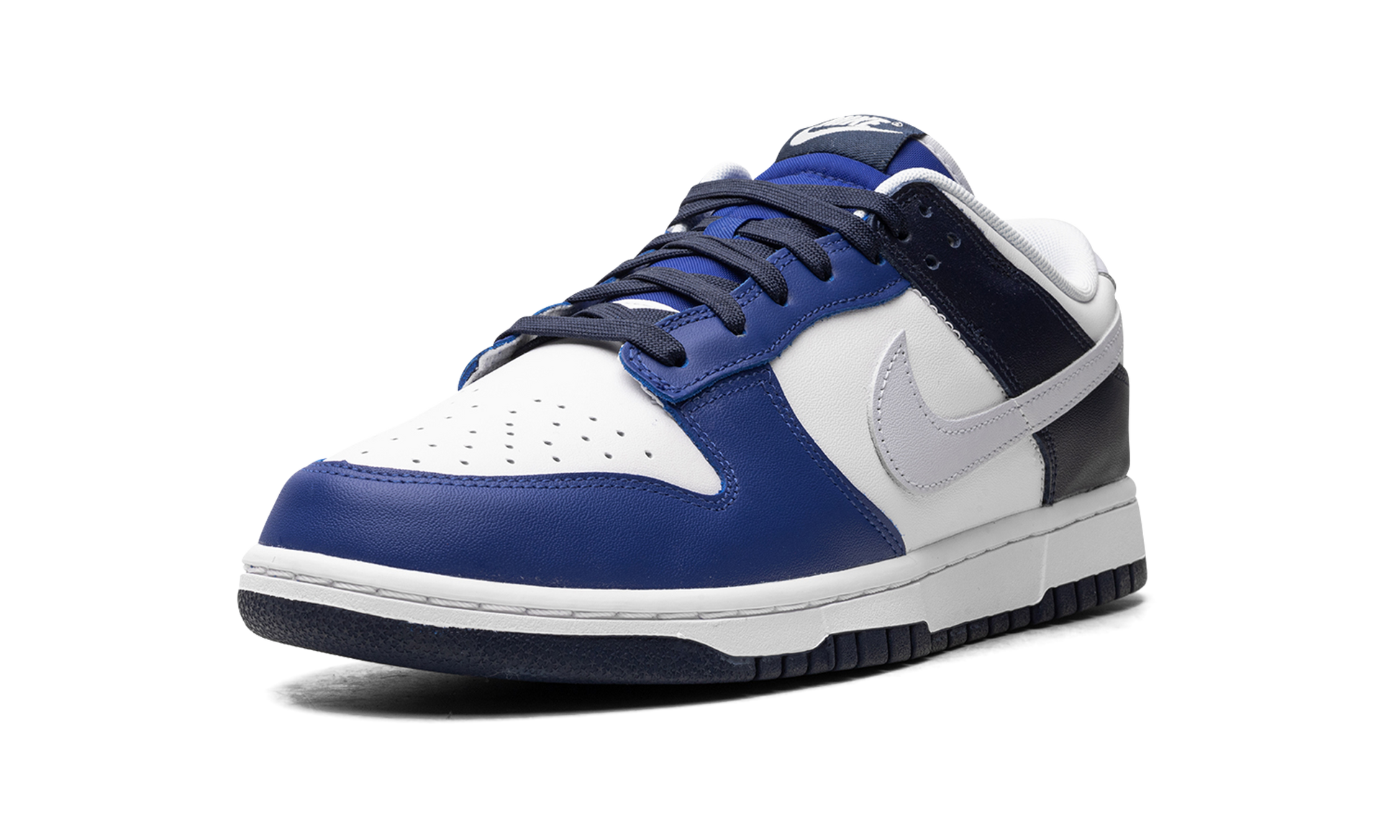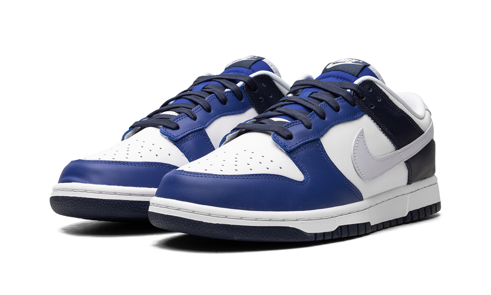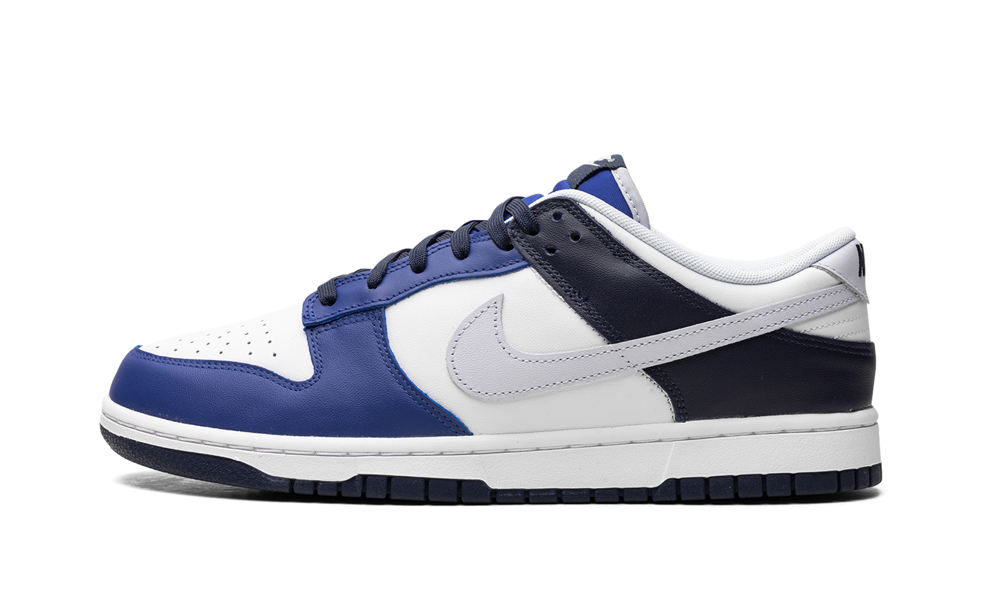 The Nike Dunk Low "Game Royal/Navy" is a colorway of the retro basketball shoe with different shades of blue on its design. The Dunk Low in “Game Royal” features a white leather base contrasted with Game Royal leather overlays on the toe cap, forefoot, and eyelet panels. Midnight Navy leather overlays appear on the collar and heel. A Football Grey leather Swoosh logo is seen on both sides. “Nike” branding is embroidered on the heel and printed on the tongue tag. Underfoot, a white midsole and navy outsole complete the look. Release date: November 3, 2023 Game Royal Navy