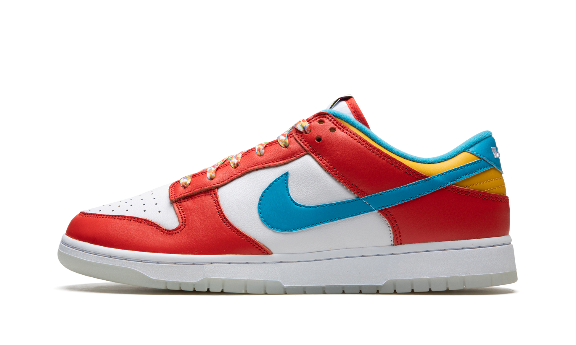The LeBron James x Nike Dunk Low “Fruity Pebbles” is a collaboration between LeBron James and Nike on a colorway of the retro basketball shoe inspired by his favorite cereal, Magic Fruity Pebbles. As imagined, the “Fruity Pebbles” Dunk Low by LeBron and Nike is as colorful as the tasty Fruity Pebbles cereal. The shoe features red leather overlays and a white leather base. A blue leather Swoosh appears on both sides and yellow leather is found on the collar and heel. Fruity Pebbles logo detailing appears on the laces and on the tongue tag, and LeBron’s signature branding dots the blue leather heel tab. Release date: September 1, 2022 LeBron James - Fruity Pebbles