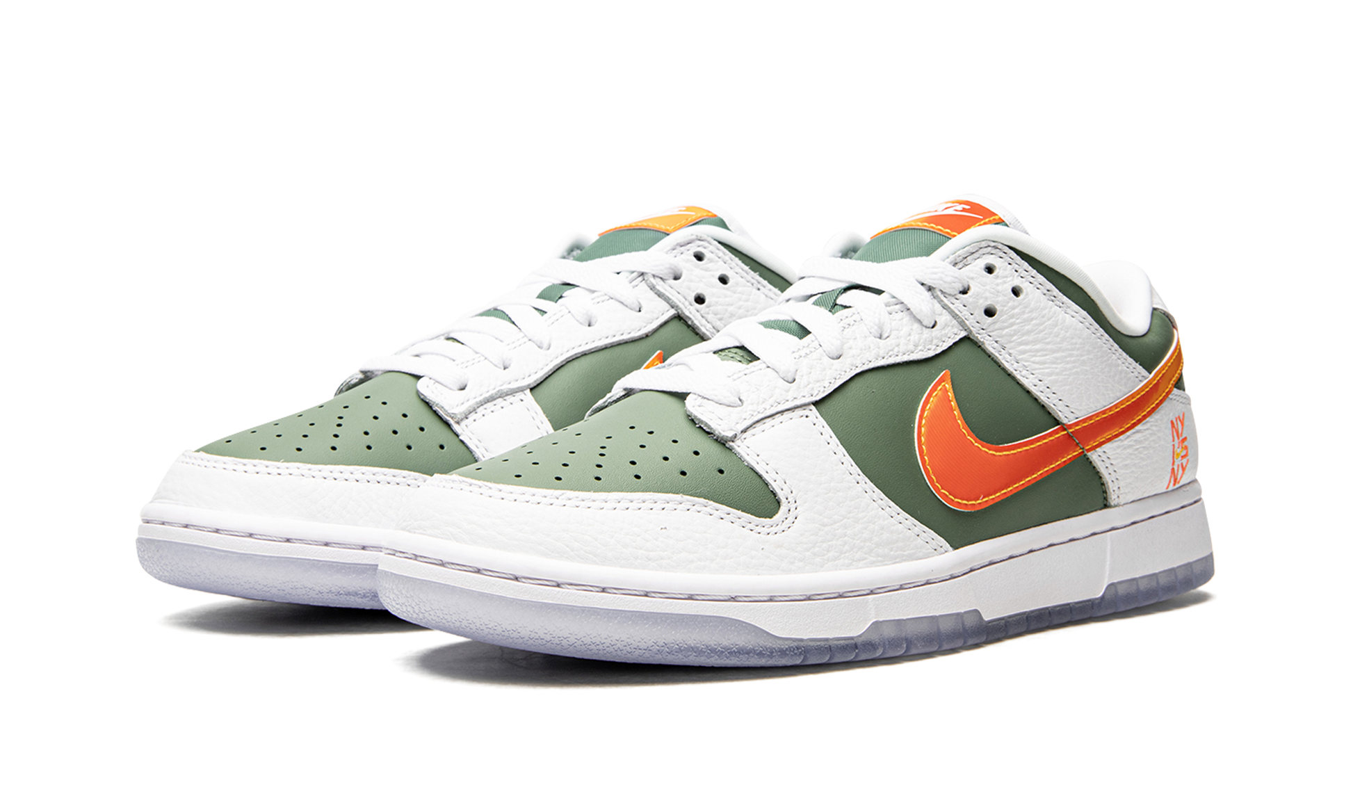 The Nike Dunk Low “NY vs NY” is a special New York City edition for the retro basketball shoe that gives a nod to the city’s legendary streetball scene. A Summer 2021 release by Nike, the “NY vs NY” is a mostly two-tone, white-and-green makeup of the popular silhouette that features unique detailing specific to various New York City streetball parks. White tumbled leather can be found on the forefoot, eyelets, collar, and heel. Contrasting green leather appears on the base of the shoe, specifically on the perforated toe, mid-panel, collar, and heel. Orange “NY vs NY” branding is embroidered on the lateral side of the heel and a gradient red-and-orange leather Swoosh can be found on the mid-panel. Additional branding appears in the form of an orange embroidered “Nike” logo on the heel and yellow and orange “Nike” detailing on the tongue tag of the left and right shoe, respectively. The names of iconic New York City streetball parks like West 4th Street, Dyckman, and Gersch Park appear in graffiti-style text underneath the icy blue translucent outsole. NY vs NY