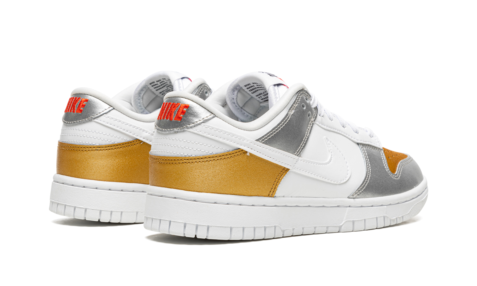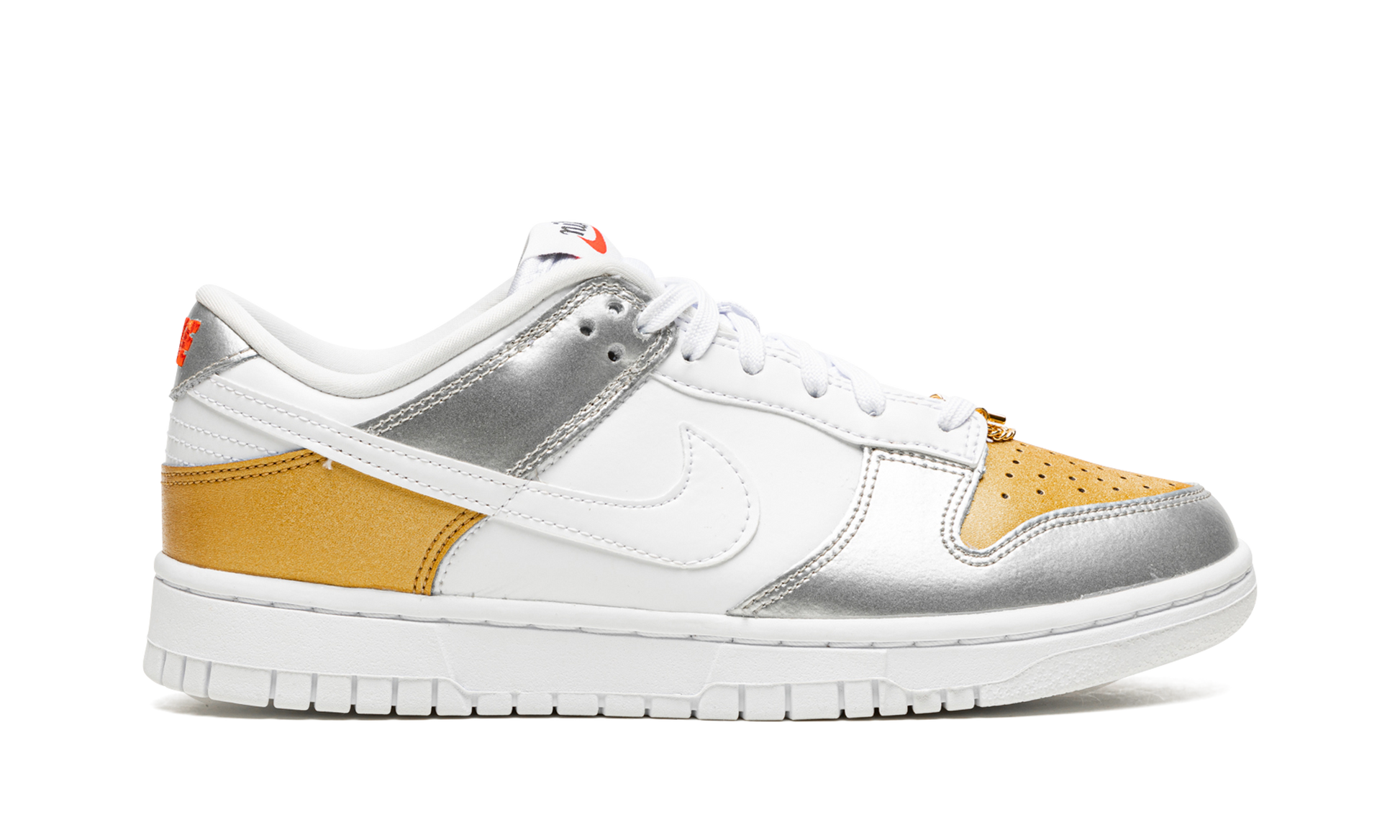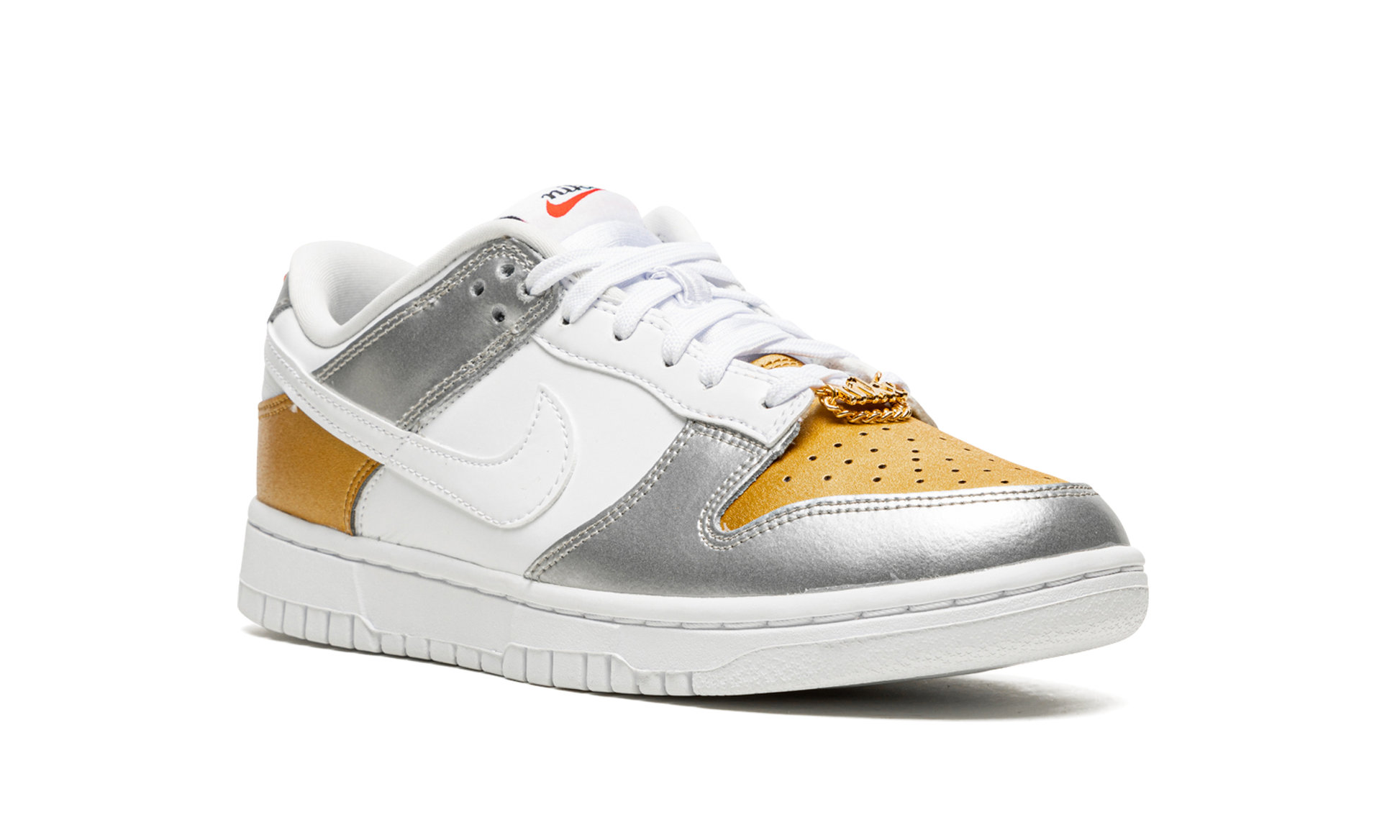 The Women’s Nike Dunk Low “Gold/White/Silver” is a women’s-exclusive colorway of the sneaker that combines flashy metallic gold and silver overlays against a clean white base. Nike released the Dunk in “Gold/White/Silver” in February 2022 as part of its Spring 2022 footwear lineup. The perforated toe and heel overlay are designed in Metallic Gold. The eyelets, mid-panel, and top heel block appear in crisp white tumbled leather. Contrasting Metallic Silver leather is found on the toe cap and forefoot panels, as well as on the collar and heel tab with red “Nike” branding. Classic “Nike” script detailing appears with a black Swoosh on the tongue tag. A luxury-inspired gold chain “Nike” lace dubrae on the vamp completes the look. Release date: February 7, 2022 Gold White Silver