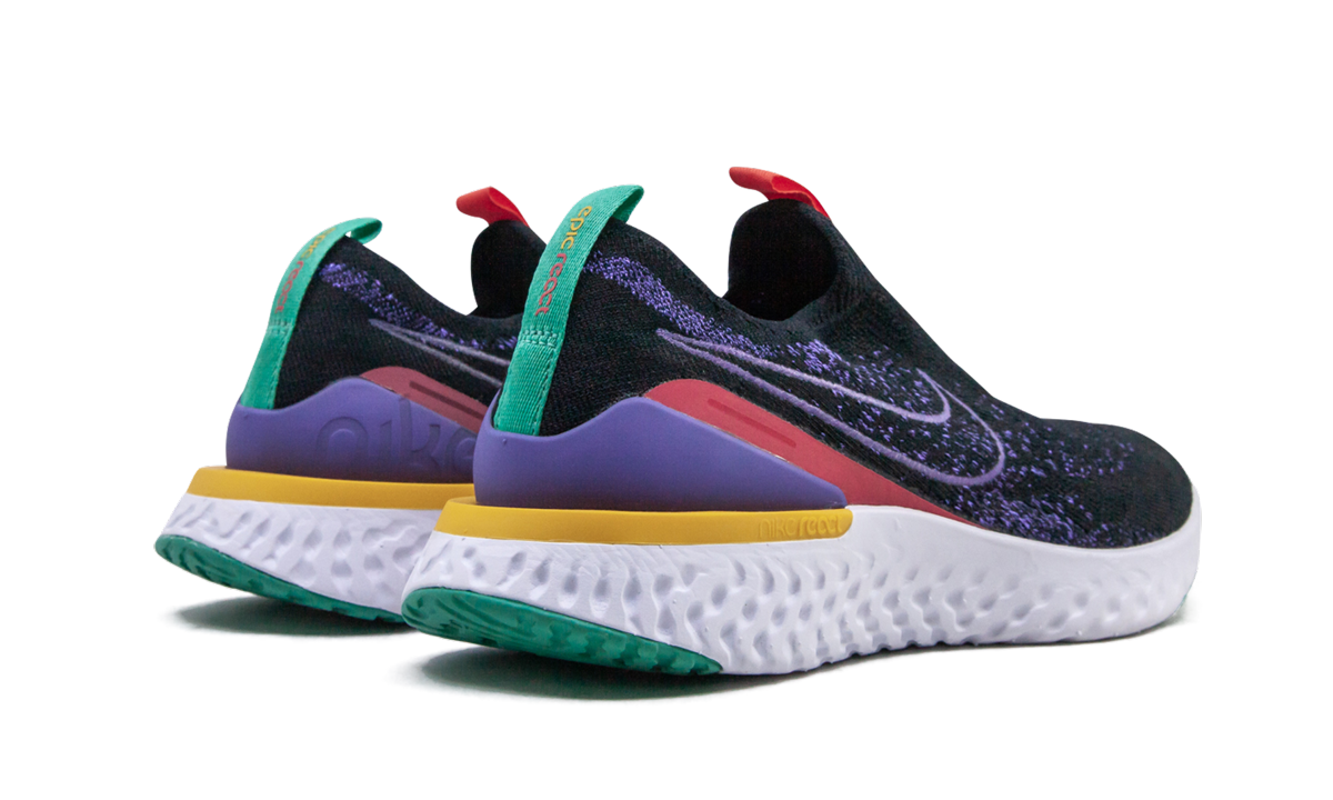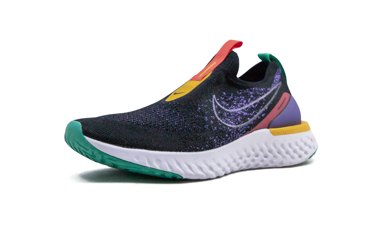 The Women’s Nike Epic Phantom React Flyknit “Psychic Purple” is the women’s sizing of the comfortable lifestyle sneaker that favors a lightweight build and use of premium materials. The upper is constructed with a supportive yet breathable black Flyknit. Hits of Psychic Purple are woven into the forefoot and mid-panel. A contrast white outlined Swoosh on the mid-panel and two-toned yellow-and-red Nike branding on the collar provides additional detailing. Colorful accenting on the heel cup finishes off the look of the upper. Nike’s revolutionary React foam midsole offers unparalleled all-day comfort, making the Epic Phantom React Flyknit one of the most popular lifestyle models on the market today.