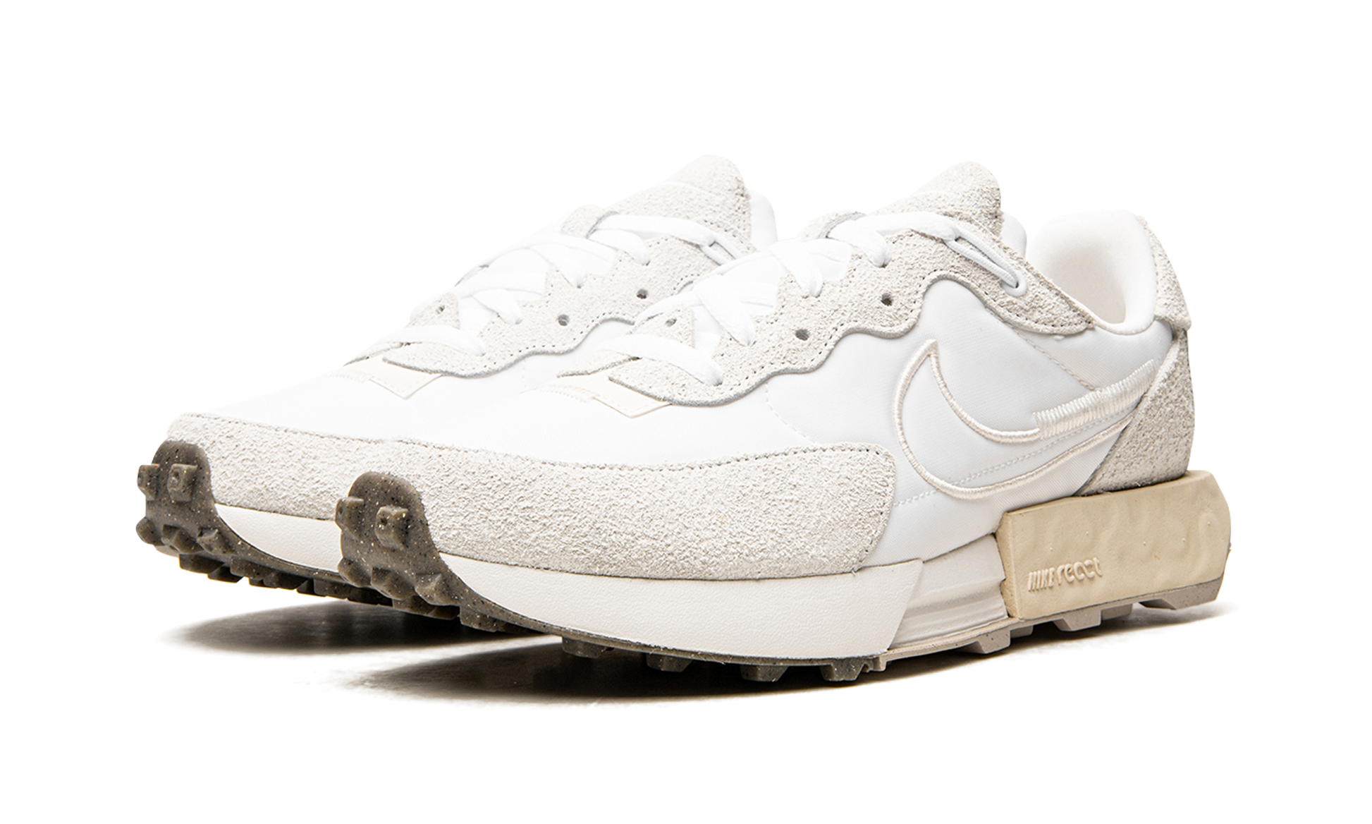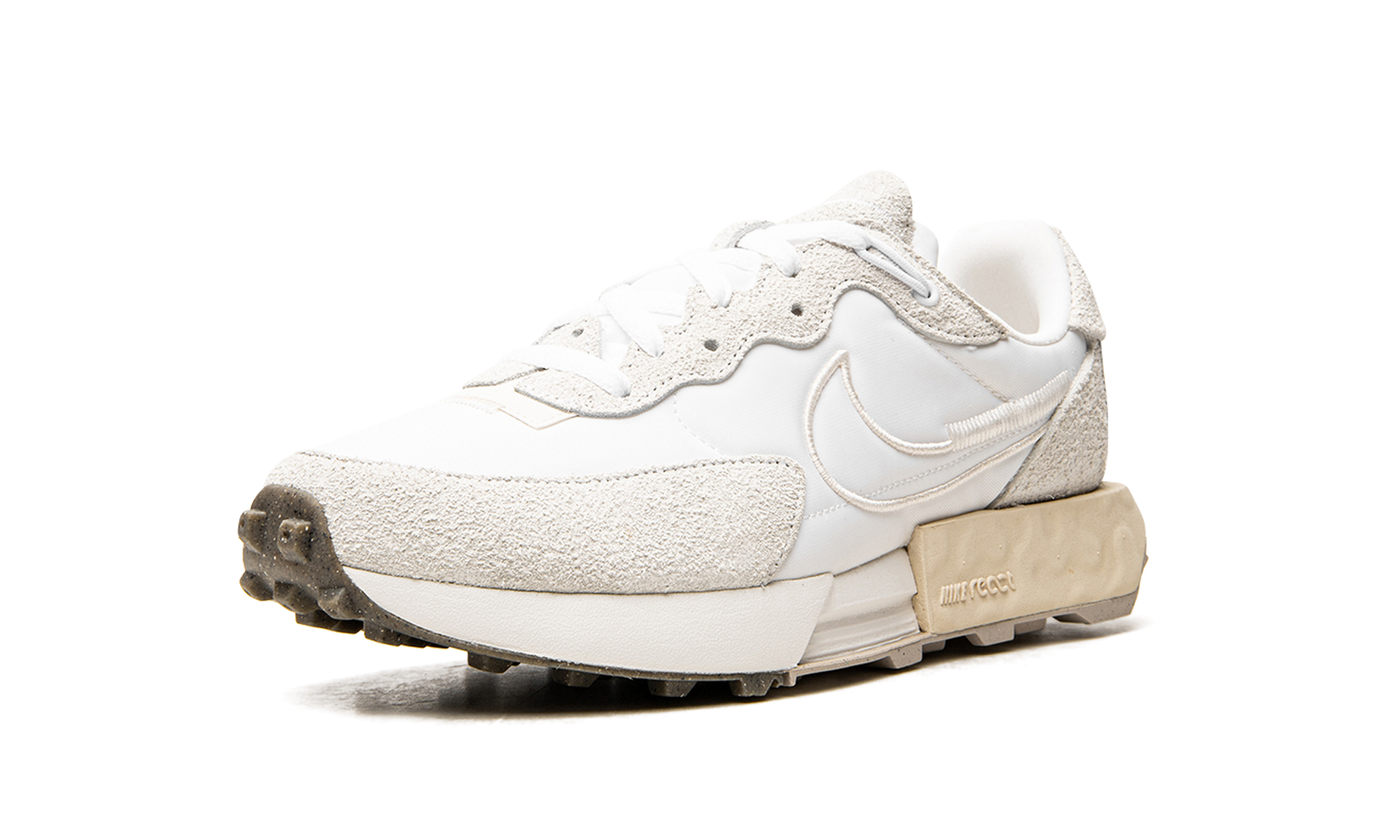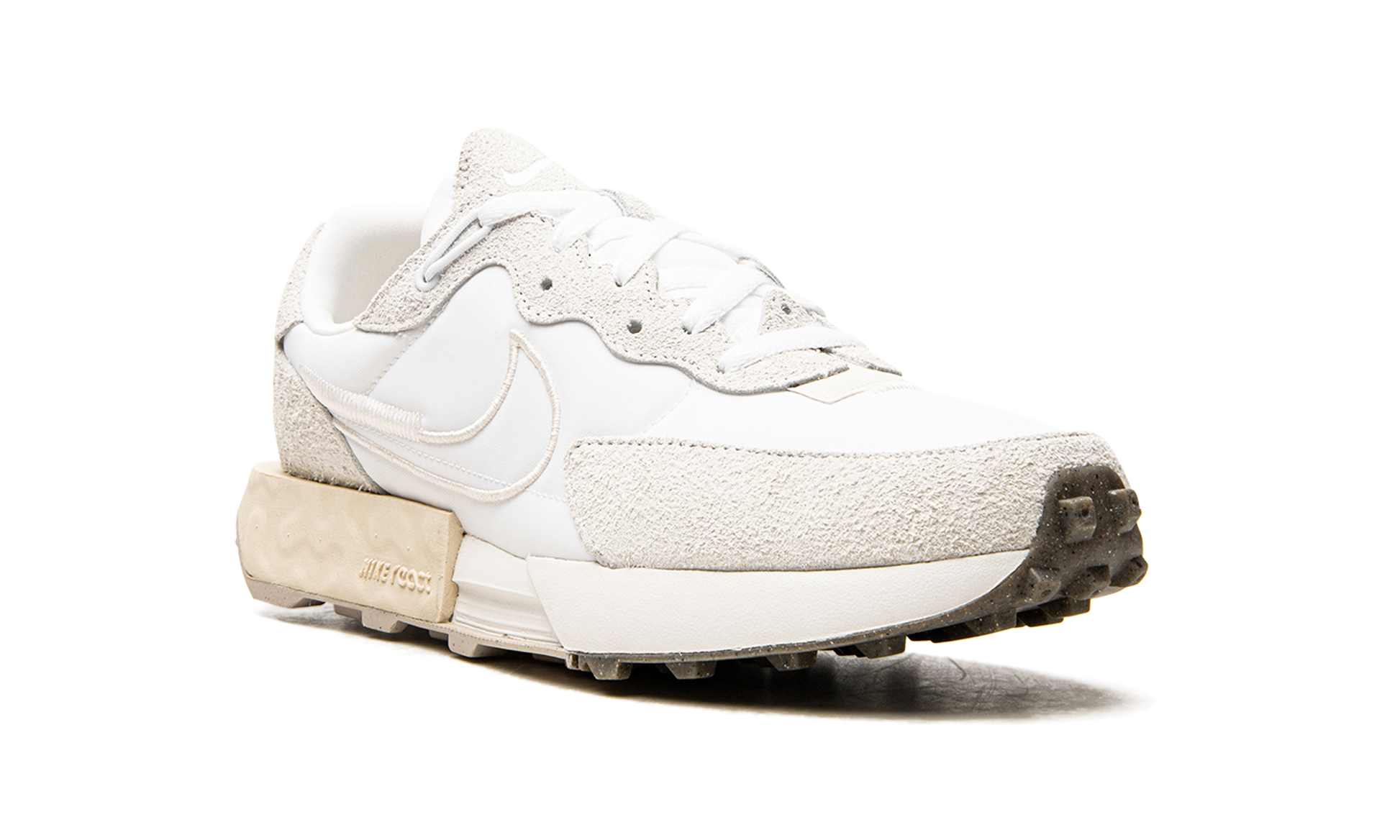 The Nike Fontanka Waffle is sleek, modern, and it's got a great story, too. Inspired by the underground rave scene in St. Petersburg, Russia, the Nike lifestyle shoe celebrates the bold life of activists who fought for a better, more inclusive world. Sporting a monochromatic, neutral look, the all-white layered upper is made of soft suede and nylon with deco-stitching and a floating heel tab. The plush midsole is ultra comfortable and features a cassette-shaped block of Nike React foam. White
