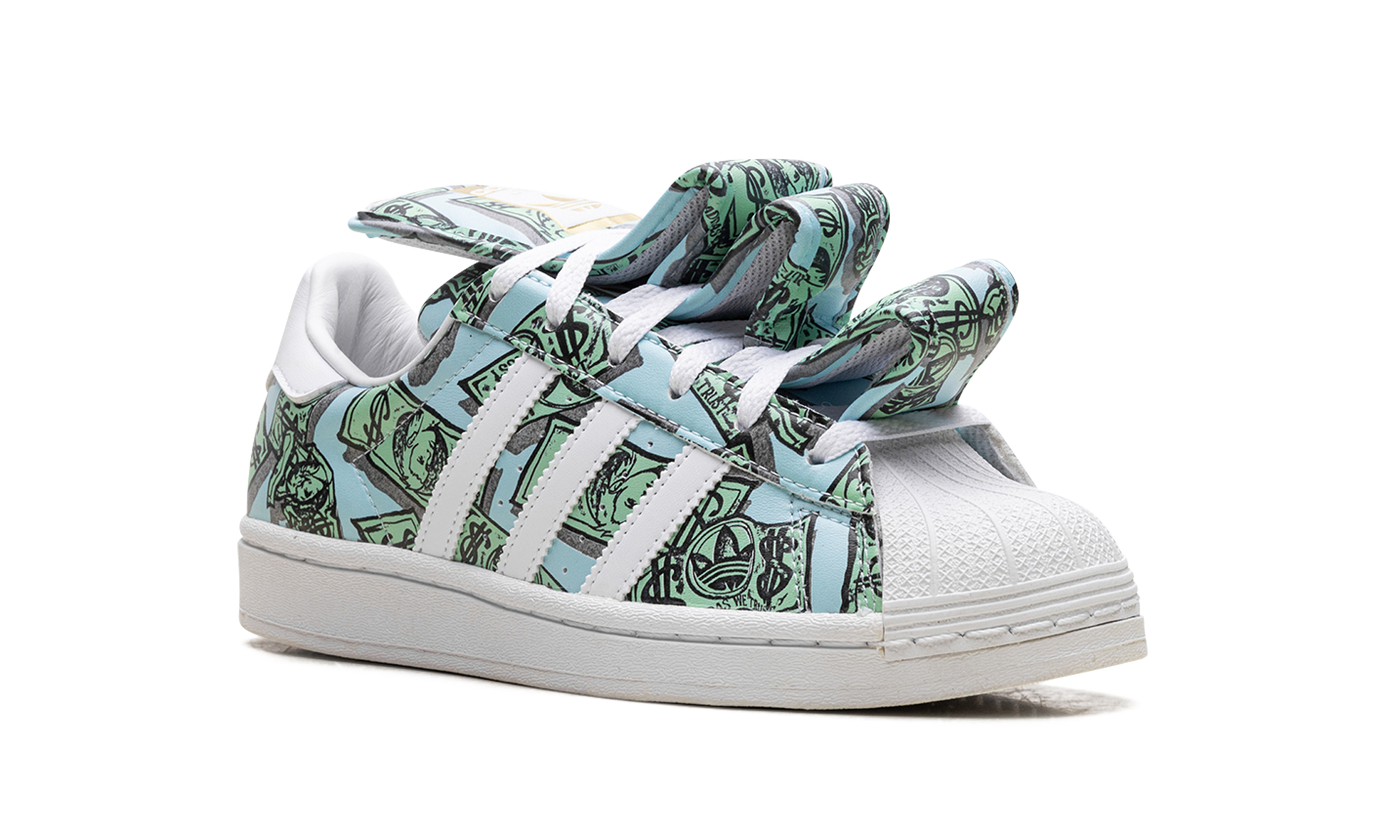 The JEREMY SCOTT - JS MONEY Superstar 'Money' shoe features a unique design with dollar bill graphics, combining classic Adidas Superstar style with Jeremy Scott's iconic bold aesthetic. Money