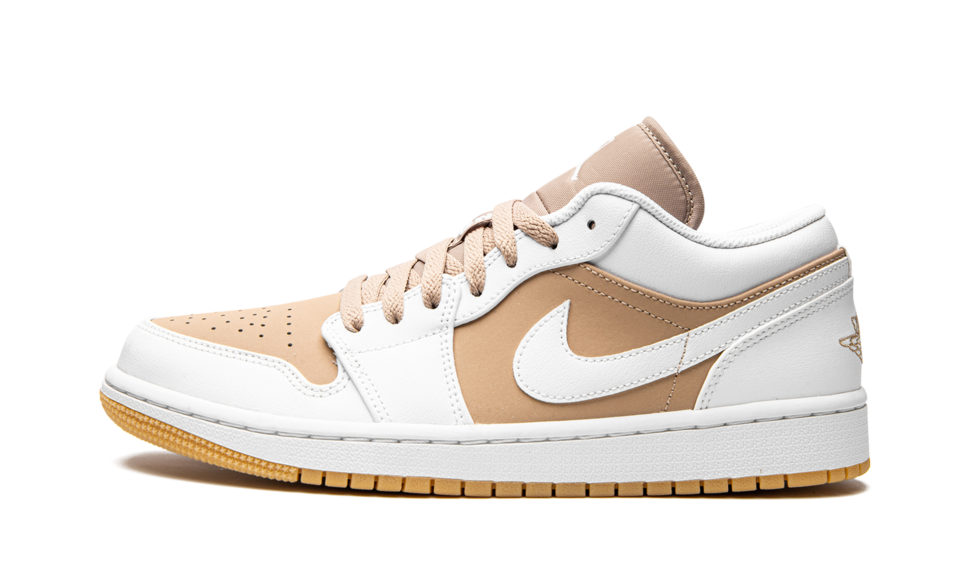 The Air Jordan 1 Low “Hemp/White” brings a clean, neutral look to the popular silhouette. This sneaker features a light brown, or “Hemp,” with a leather base, coupled with white leather panels at the eyelets, toe box, and heel. A Jordan Jumpman logo is found embroidered on the heel. A white midsole and gum rubber outsole complete the shoe. Hemp