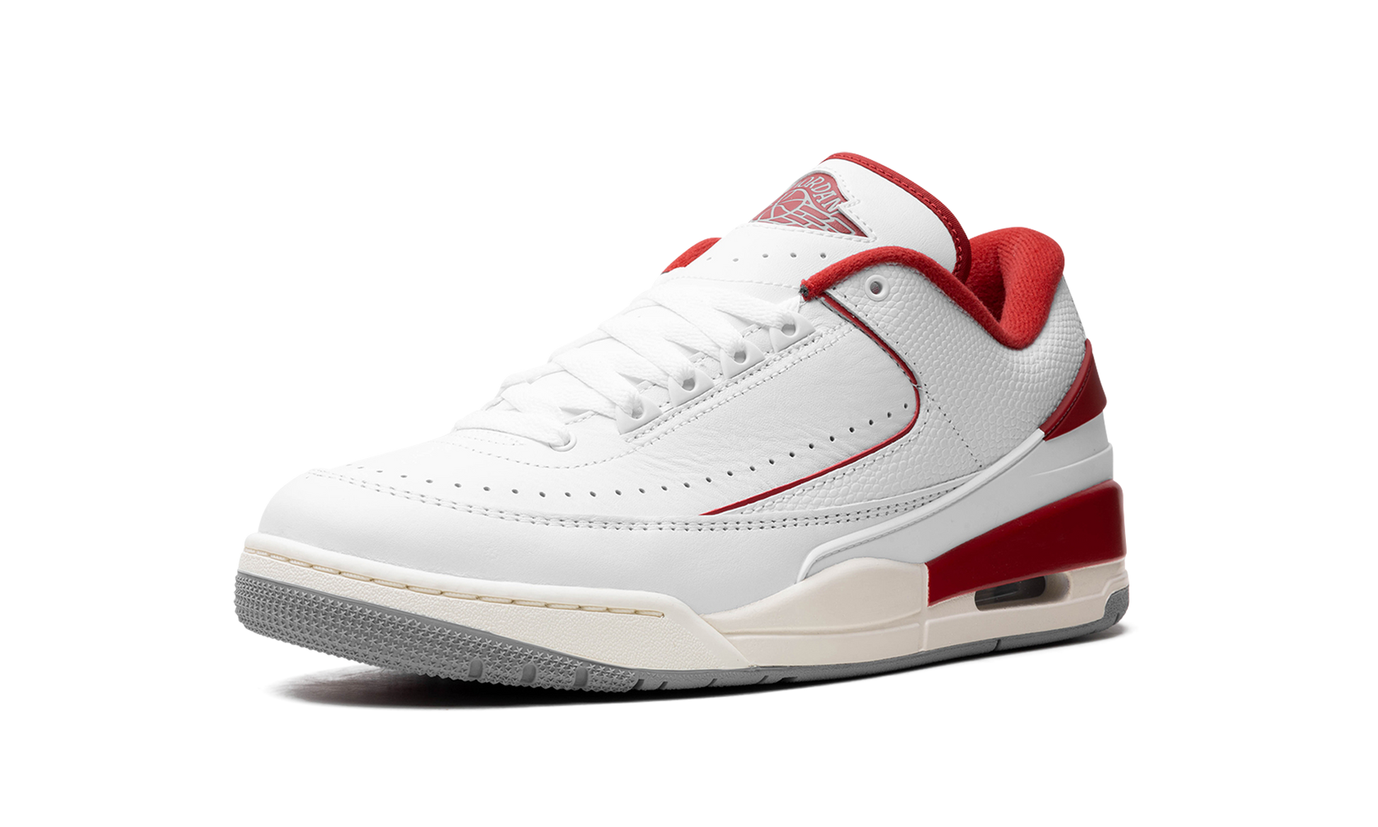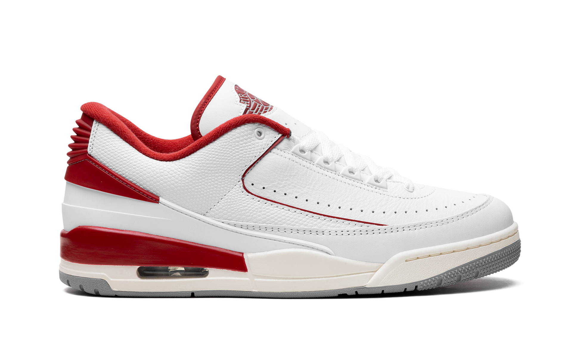 The Jordan 2/3 GS “Varsity Red” is the youth sizing of the Chicago Bulls-inspired colorway of the hybrid sneaker that combines elements of the Air Jordan 2 and Air Jordan 3. The Jordan 2/3 fuses details from the Jordan 2 and Jordan 3, including the sole unit from the Jordan 3 and and the upper construction of the Jordan 2 Low, among other features. On this colorway, the shoe has a white leather construction with contrasting Varsity Red accents on the “Wings” logo on the tongue, on the inner lining, on the heel counter, and mudguard. Perforations around the toe provide ventilation. The Jordan 3-inspired midsole has a slightly aged look and features an Air unit in the heel. Varsity Red