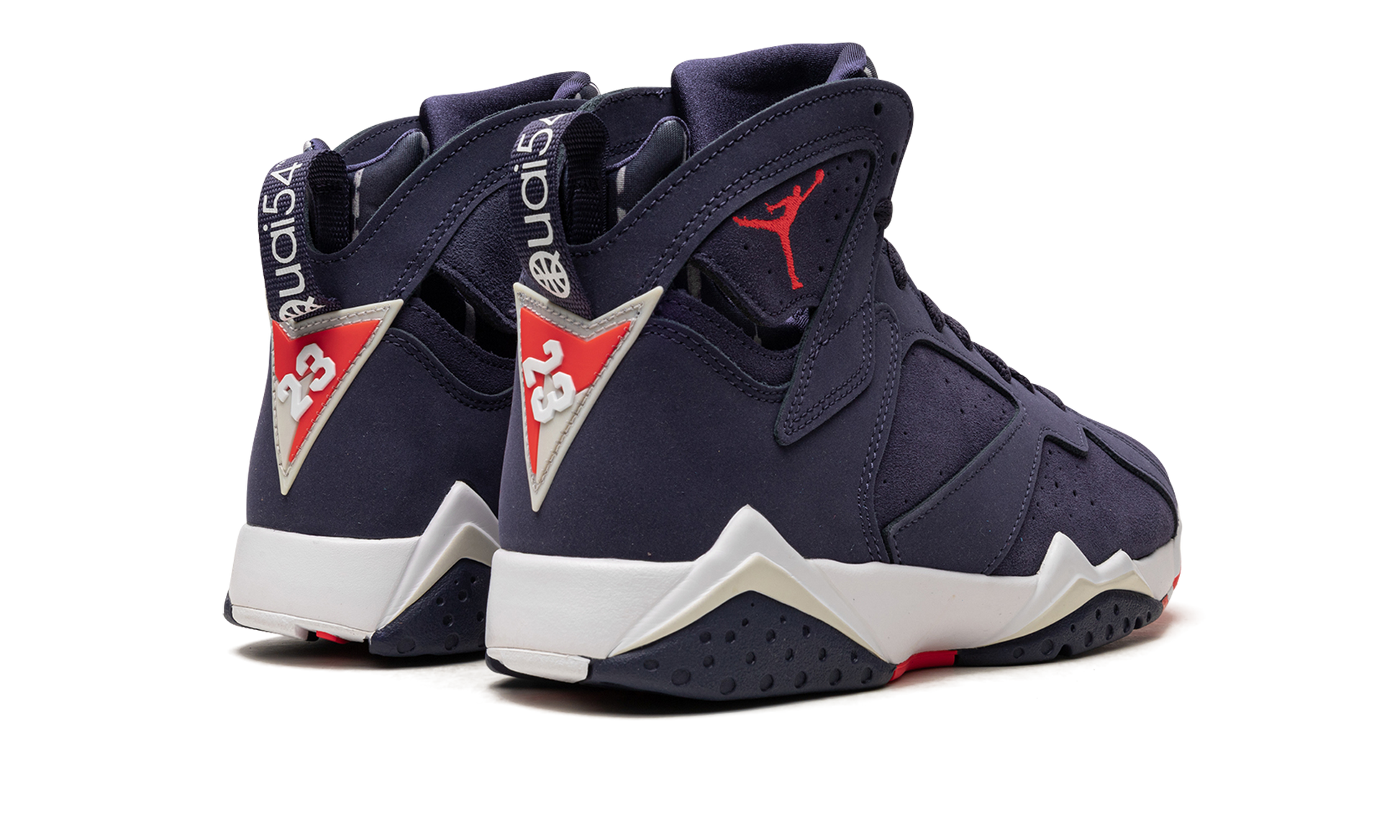 The Air Jordan 7 “Quai 54 2022” is a special colorway of Michael Jordan’s seventh signature shoe that celebrates the Jordan Brand-hosted streetball tournament that takes place in Paris every summer. The “Quai 54” features a navy suede base with tonal synthetic nubuck overlays. A red Jumpman logo is embroidered on the lateral side of the collar while “Jordan” branding is found on the striped neoprene tongue. “Quai 54” detailing is located on the heel. The special edition Jordan 7 is complete with a white polyurethane midsole and red, white, and blue rubber outsole. Release date: July 8, 2022 Quai 54 (2022)