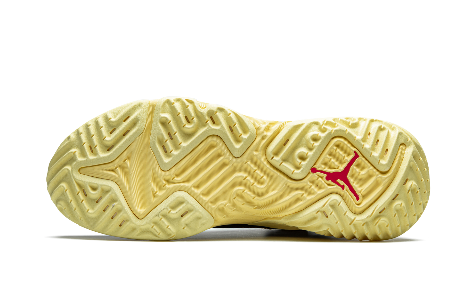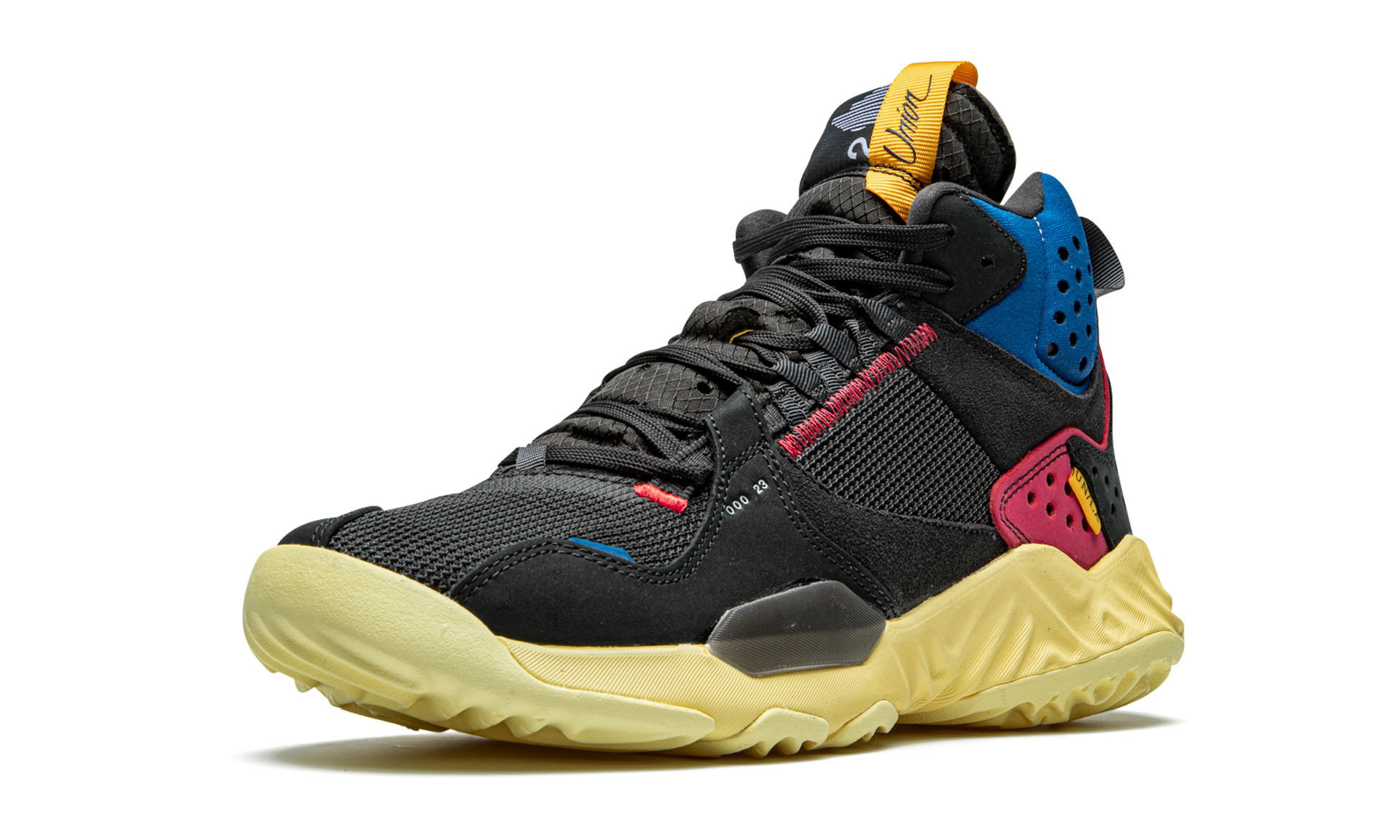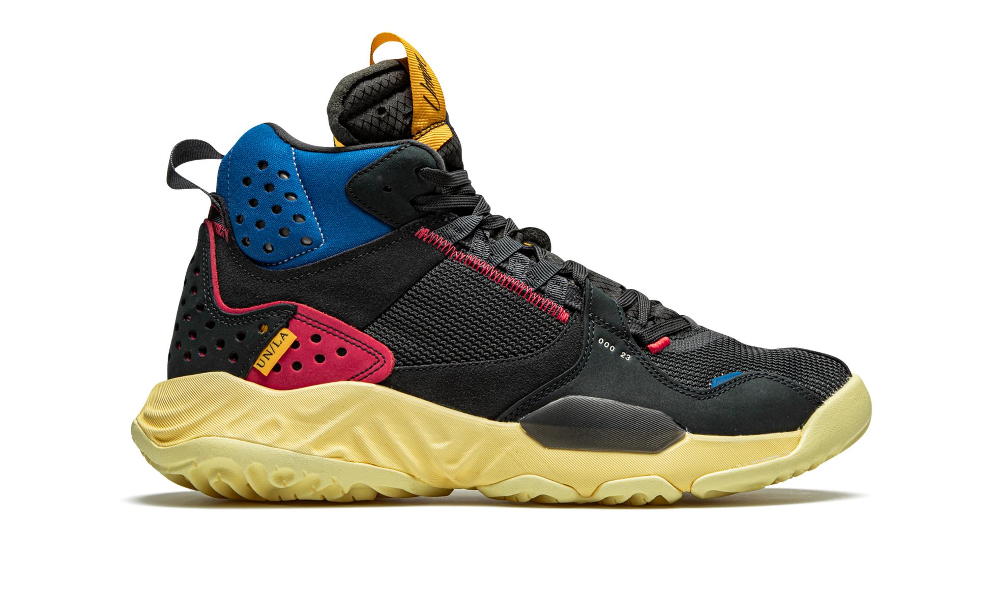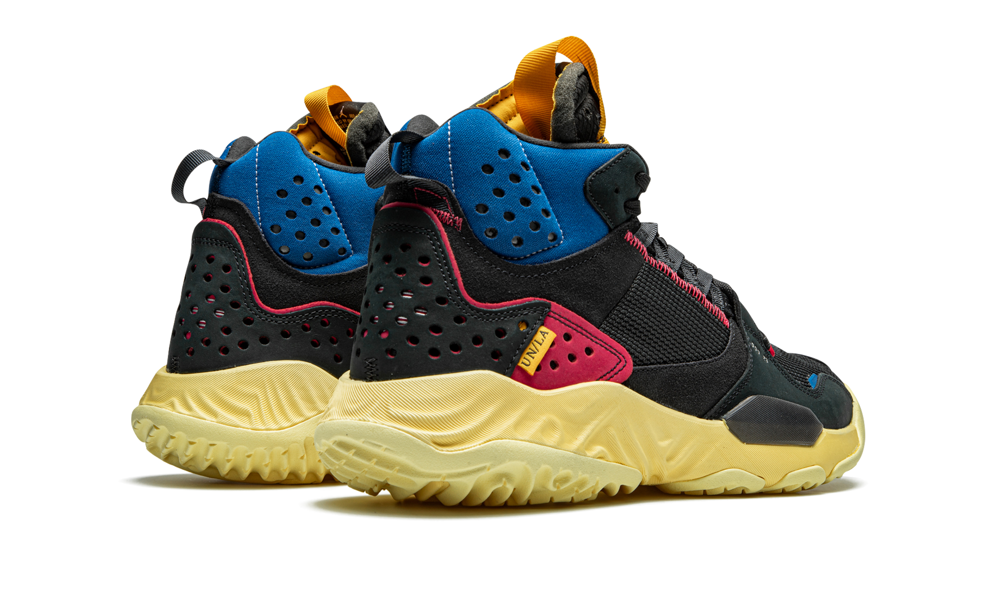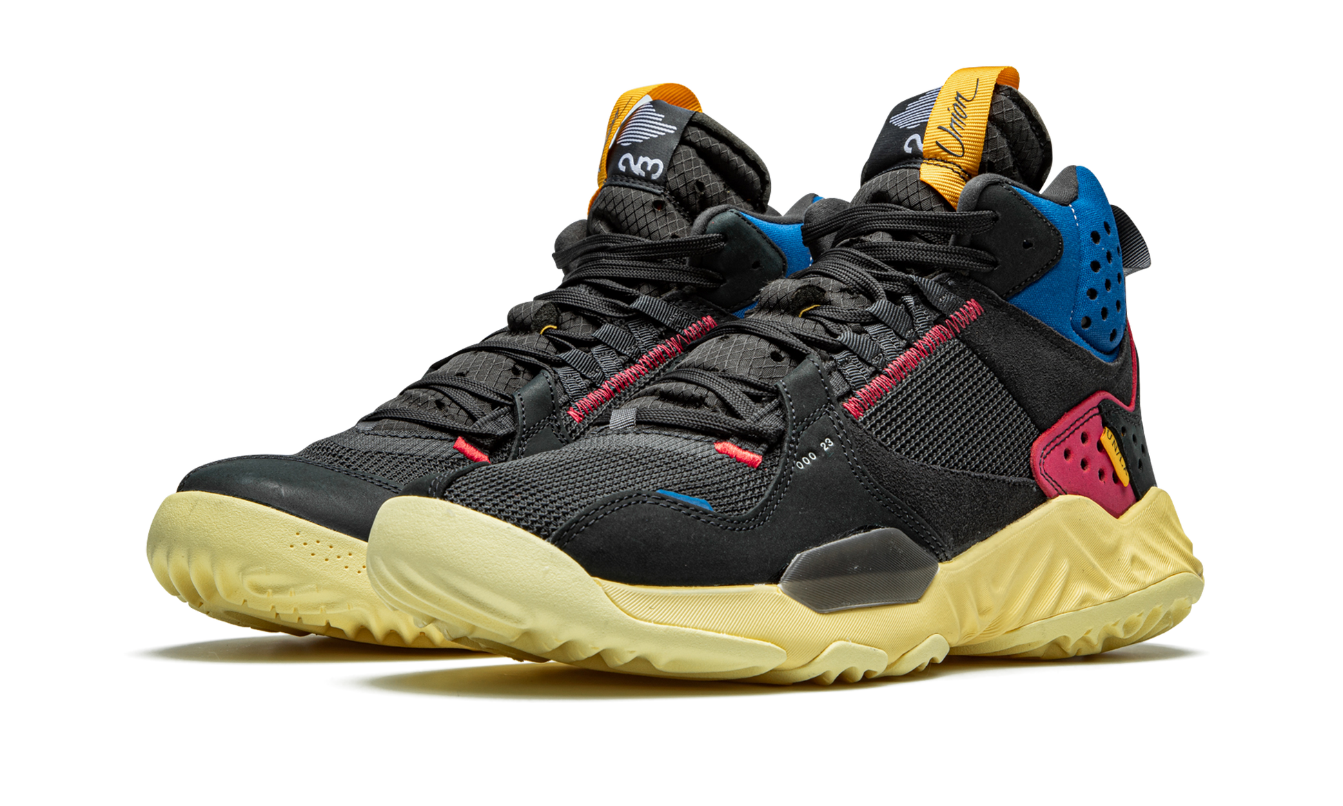 The Union x Jordan Delta Mid SP “Off Noir” is one of several models and colorways included in the high-profile collaboration between the Los Angeles fashion boutique and Jordan Brand. A rare silhouette, the Jordan Delta Mid is finished off in the “Off Noir” design that also appears on Union’s rendition of the Air Jordan 4 from the same “Sophomore Album Collection.” Like that shoe, the mid-top seen here features a mixture of materials and colors. Panels of Off Noir suede appear on the mid-panel and collar. Black mesh detailing dots either side of the upper, as well as the toe. Exposed red contrast stitching is located beneath the eyelets. Additional red detailing appears on the perforated overlay on the quarter panel. Union incorporates blue perforated suede on the collar and adds an orange “Union” nylon tag to the tongue. The yellow ribbed midsole brings a vintage inspired element to the look of the shoe, a design feature that many of Union’s Jordan collaborations have displayed since 2018. Release date: September 30, 2020. Union LA - Off Noir