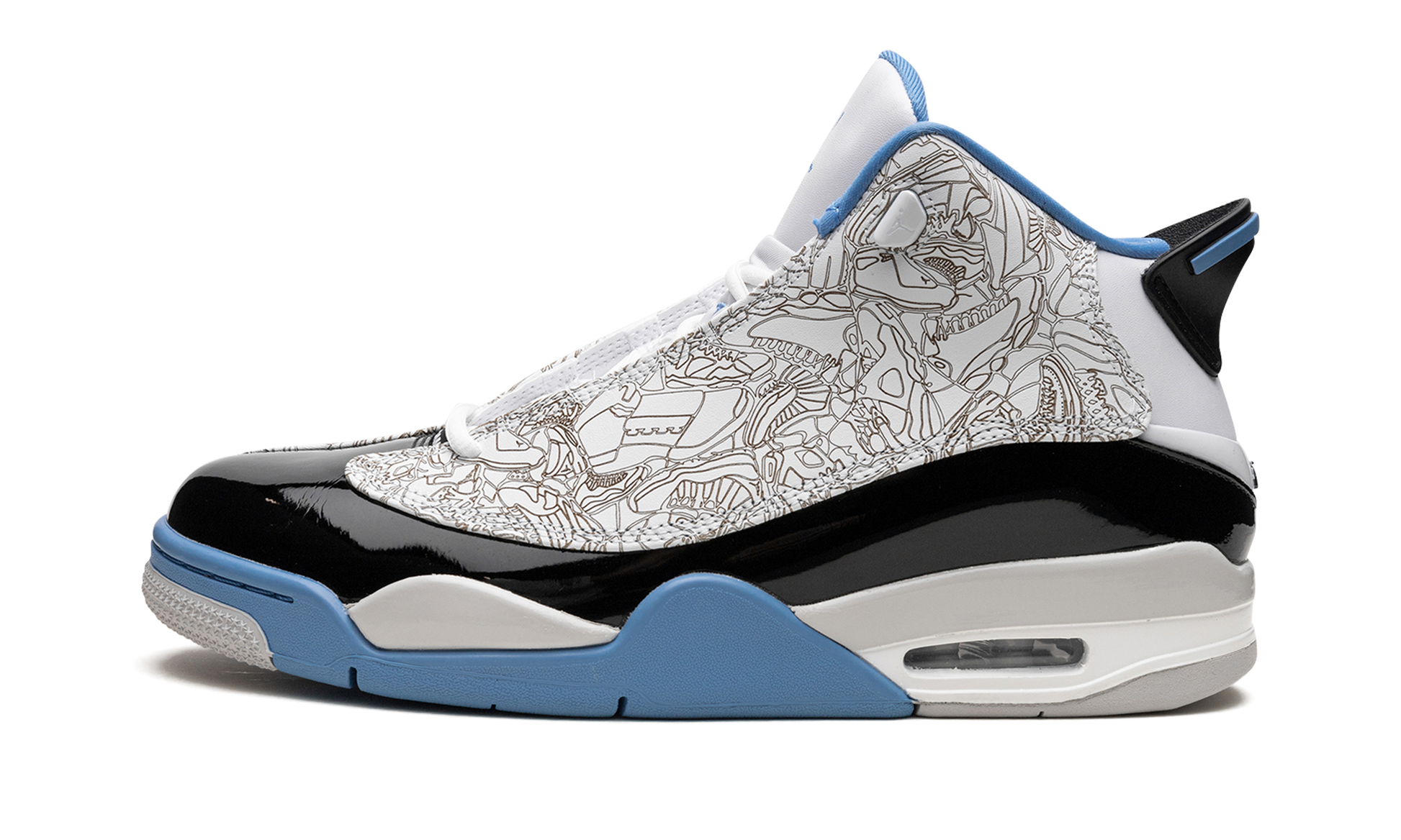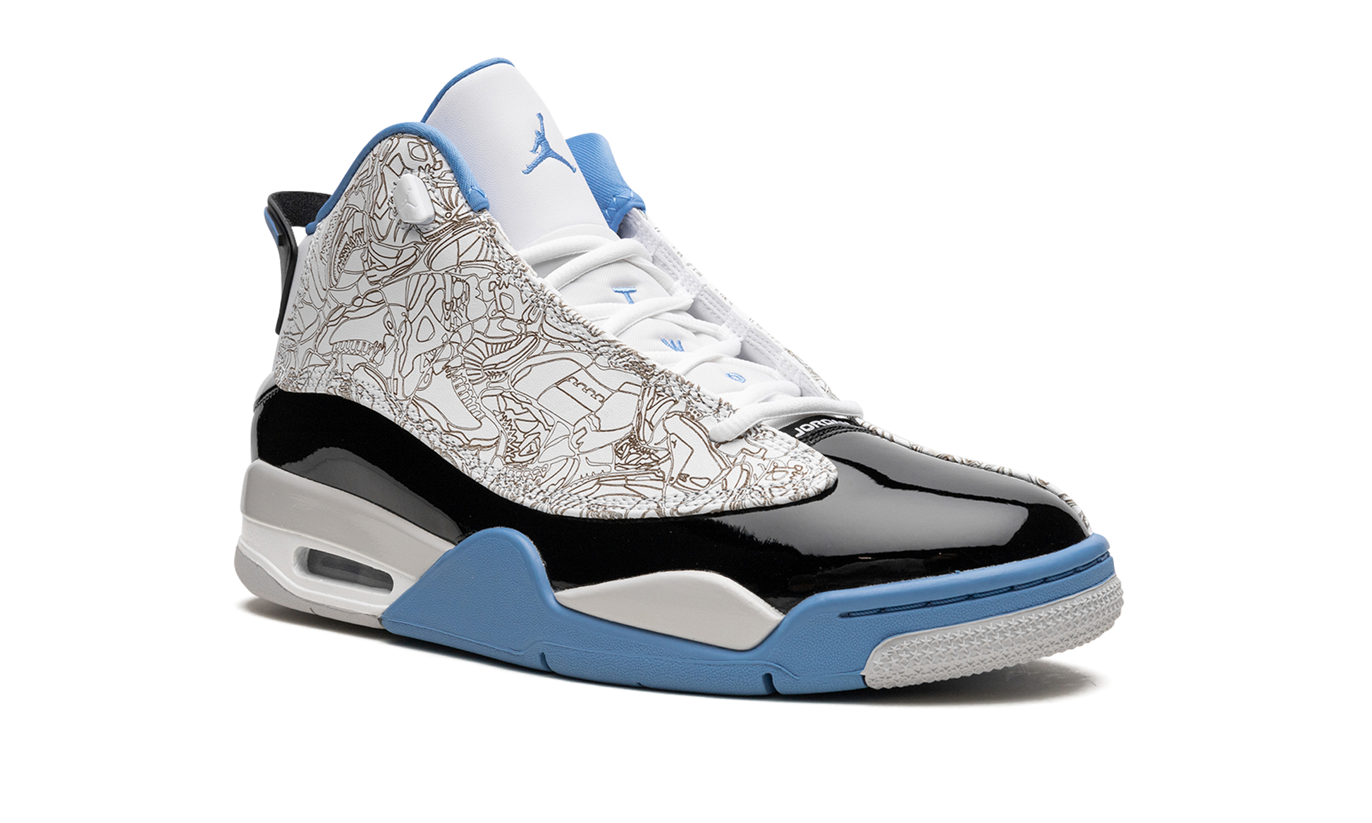 The Jordan Dub Zero “Legend Blue” is a “UNC” inspired colorway of the shoe that combines elements of several classic Air Jordan models. The Jordan Dub Zero features design cues from a long list of iconic Jordans, including the Air Jordan 4, Air Jordan 6, Air Jordan 11, Air Jordan 12, Air Jordan 13, Air Jordan 15, Air Jordan 17, and Air Jordan 20. The shoe has a white leather upper with laser print on the side panels. A black patent leather mudguard contrasts the look. Legend Blue accenting appears on the Jordan-6-inspired rear spoiler, on the 4-inspired outsole, and on the Jumpman and “Two 3” branding. Release date: October 1, 2022 Legend Blue