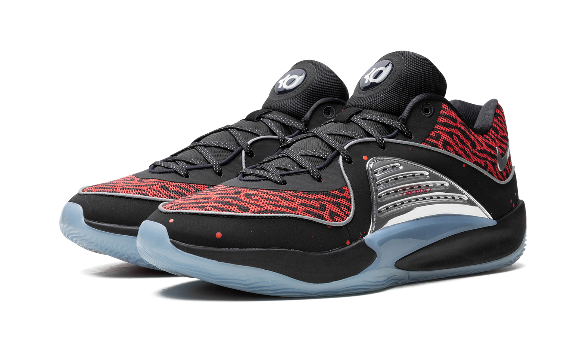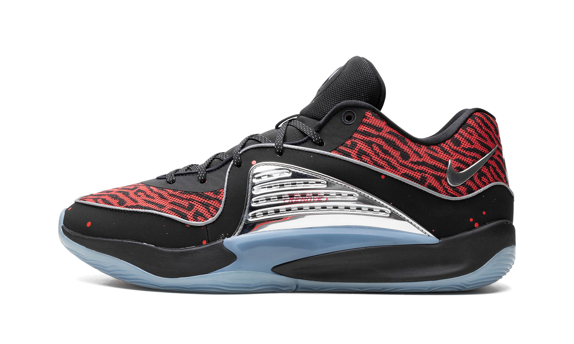 The Nike KD 16 "Slim Reaper" is a colorway of Kevin Durant’s sixteenth signature shoe with Nike Basketball inspired by his nickname. Known as one of the greatest basketball players of all time, Kevin Durant is also known for his many nicknames, including the “Easy Money Sniper” and “Slim Reaper.” On the Nike KD 16 “Slim Reaper,” the performance basketball shoe features details inspired by the NBA star’s nickname that draws on his tall, slender frame that reminds some fans of the Grim Reaper. The upper features blood-like splatters on a black textile material. Metallic Silver accenting appears on the “Nike” and “KD” logos, as well as on the TPU overlays. A “Grim Reaper” graphic can be found on the heel. Underfoot, the shoe is finished off with a black midsole and an icy semi-translucent outsole. Slim Reaper