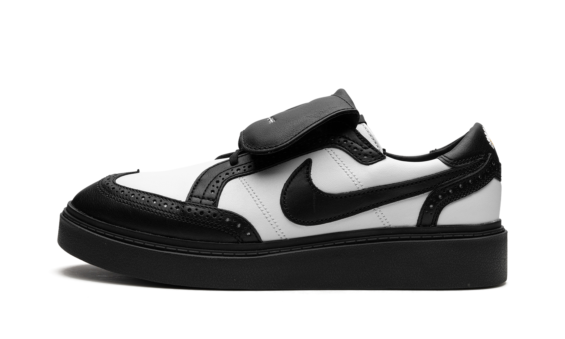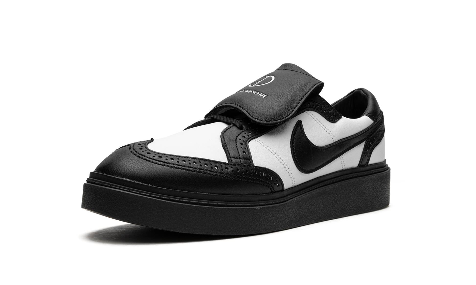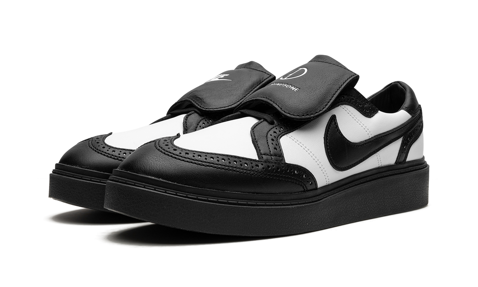 The G-Dragon x Nike Kwondo 1 “Panda” is a collaboration by the South Korean hip-hop artist and Nike on the brogue-style shoe that debuted in December 2021. The Nike Kwondo 1 is named after the Korean martial art of taekwondo, and its design is inspired by several footwear styles, most notably brogue-style dress shoes, Stefan Janoski’s Nike SB Janoski line, and ‘90s-era football cleats. This is evident from the perforations found along each panel, the overall shape of the shoe, and the overlapping tongues. As for the rest of the design, the shoe appears in a “Panda” inspired color block with white leather on the base and black leather on the overlays and on the Swoosh. Dual “Nike” and “Peaceminusone” logos are found on the left and right tongues, respectively. An embroidered daisy detail on the heel is a nod to G-Dragon’s logo. More classic, formal-looking footwear inspires the look of the shoe’s black rubber sole. G-Dragon - Panda