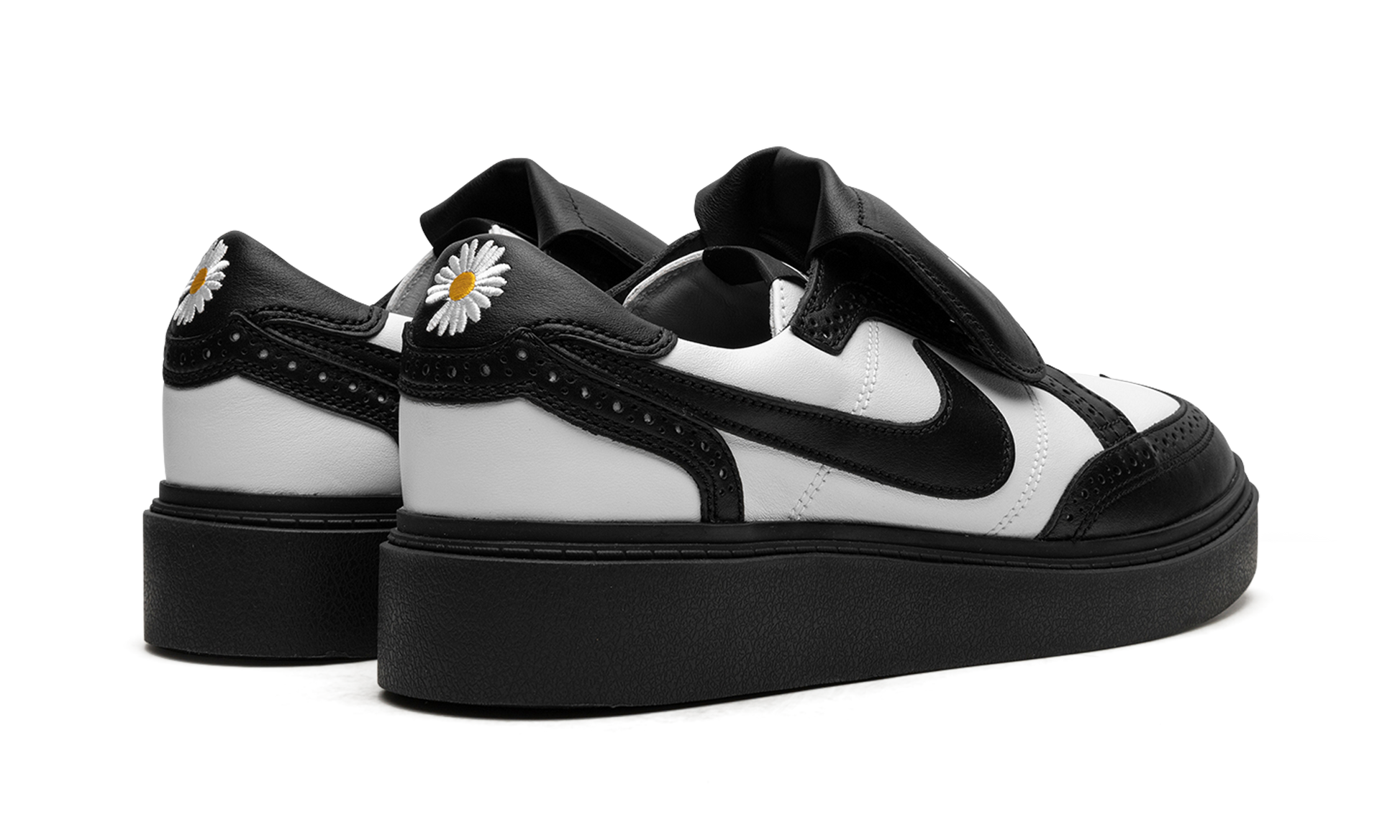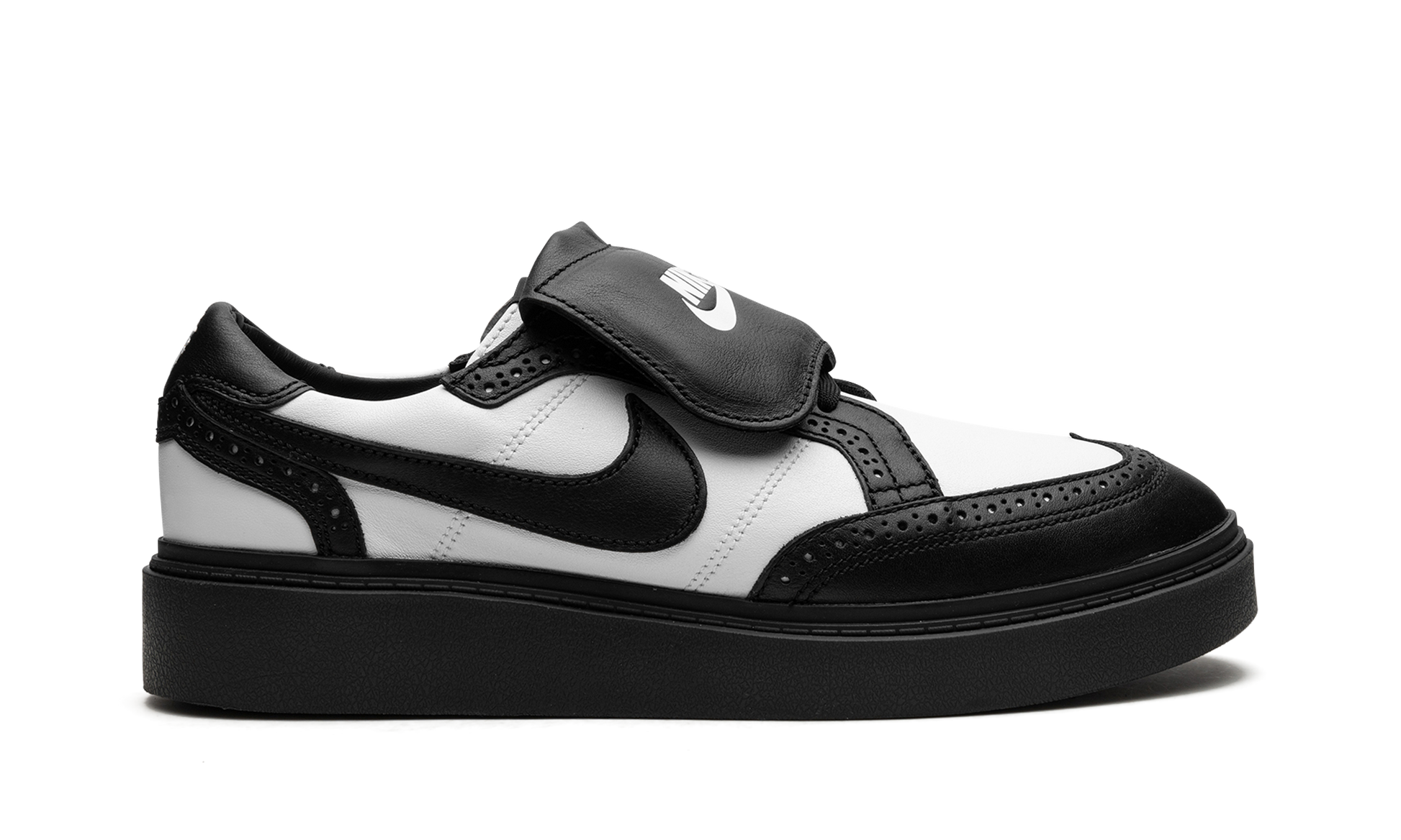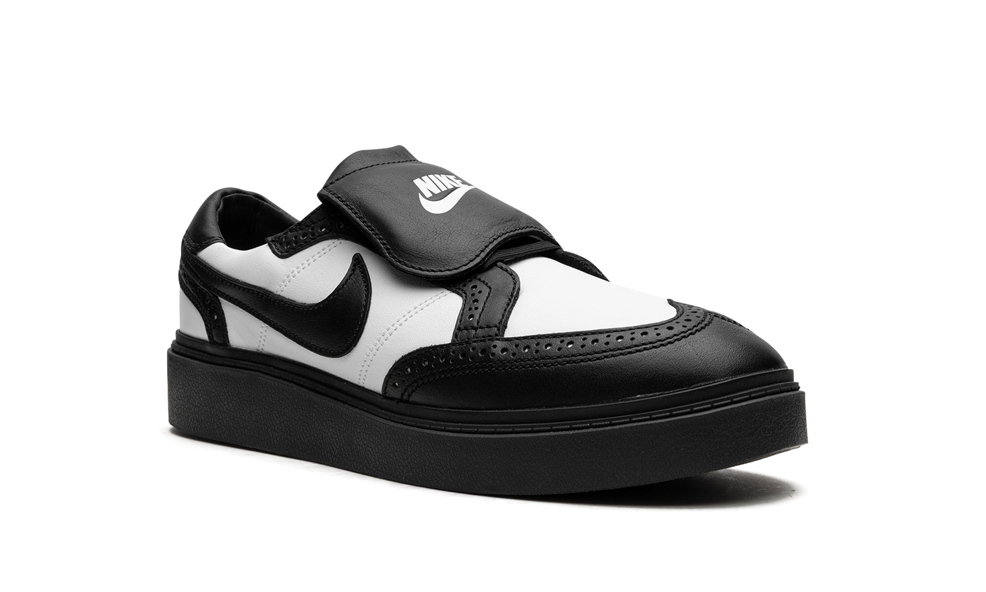 The G-Dragon x Nike Kwondo 1 “Panda” is a collaboration by the South Korean hip-hop artist and Nike on the brogue-style shoe that debuted in December 2021. The Nike Kwondo 1 is named after the Korean martial art of taekwondo, and its design is inspired by several footwear styles, most notably brogue-style dress shoes, Stefan Janoski’s Nike SB Janoski line, and ‘90s-era football cleats. This is evident from the perforations found along each panel, the overall shape of the shoe, and the overlapping tongues. As for the rest of the design, the shoe appears in a “Panda” inspired color block with white leather on the base and black leather on the overlays and on the Swoosh. Dual “Nike” and “Peaceminusone” logos are found on the left and right tongues, respectively. An embroidered daisy detail on the heel is a nod to G-Dragon’s logo. More classic, formal-looking footwear inspires the look of the shoe’s black rubber sole. G-Dragon - Panda