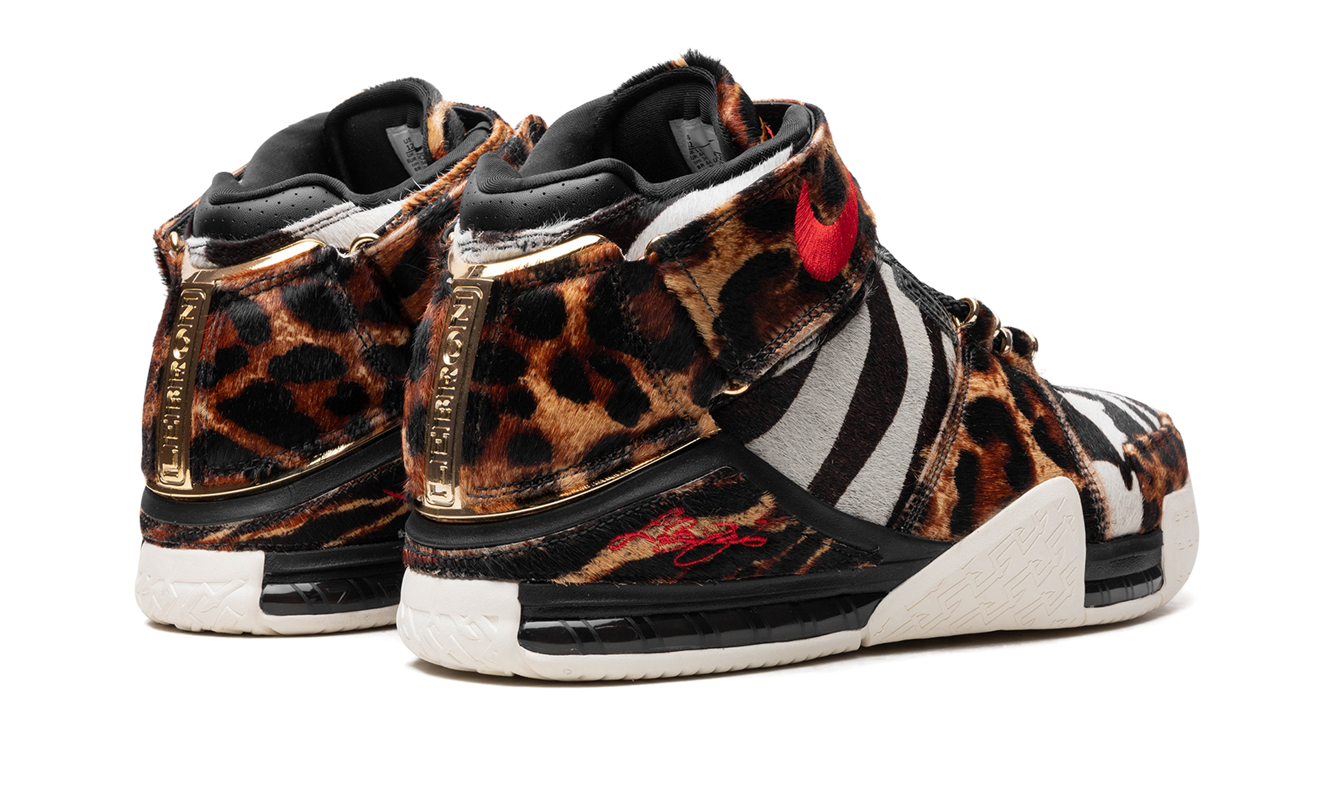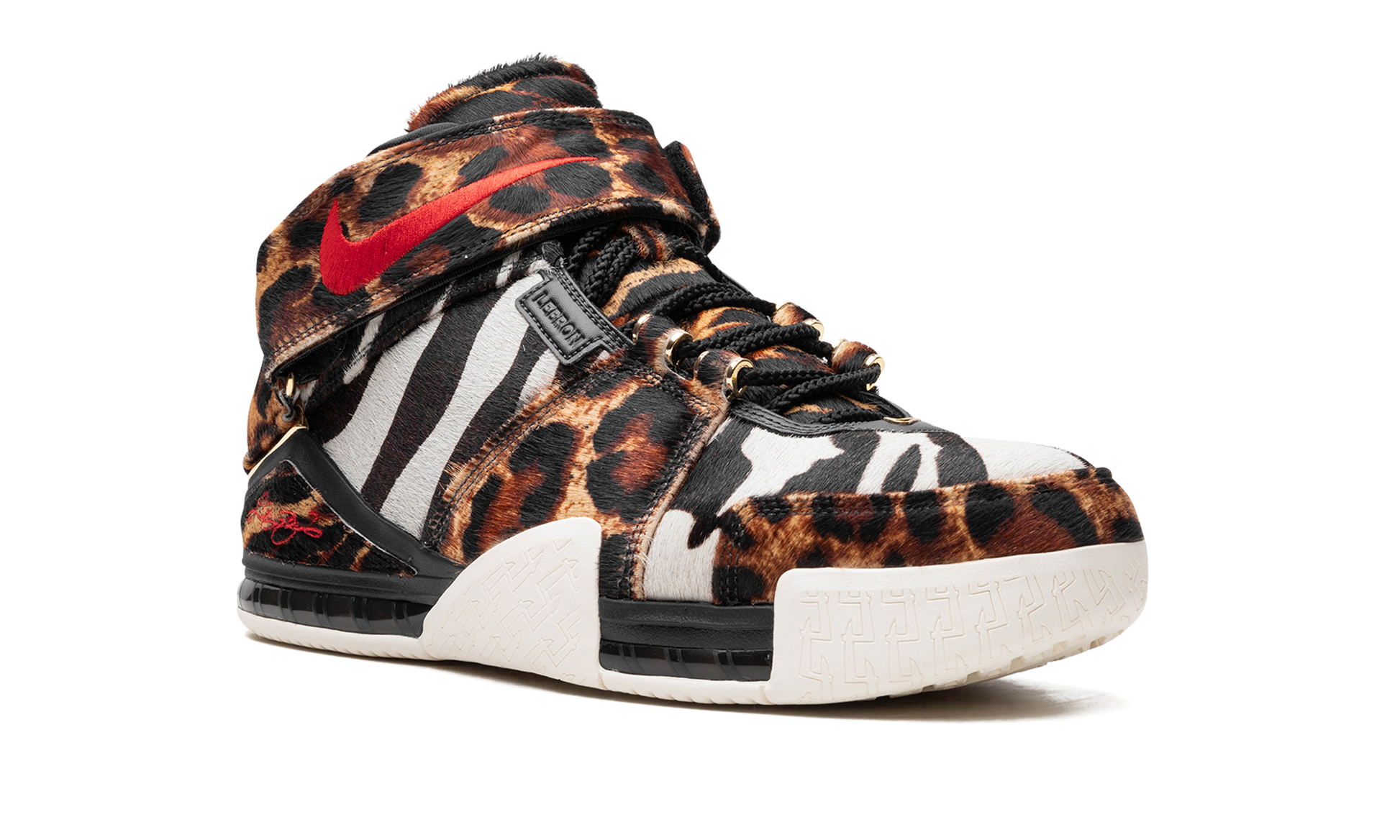 The Nike LeBron 2 "Beast" is a colorway of LeBron James’s second signature shoe that originated as a Player Exclusive version for James in celebration of the model’s 10th anniversary in 2014. In 2023, Nike Basketball finally released the LeBron 2 “Beast” for the first time at retail, much to the appreciation of sneaker collectors. The upper has an undeniably interesting combination of animal-inspired patterns, with zebra print appearing on the base and cheetah print landing on the overlays. An oversized red Swoosh is seen on the strap on the collar. LeBron’s signature branding with Nike appears on various points throughout the shoe. Release date: November 16, 2023 Beast