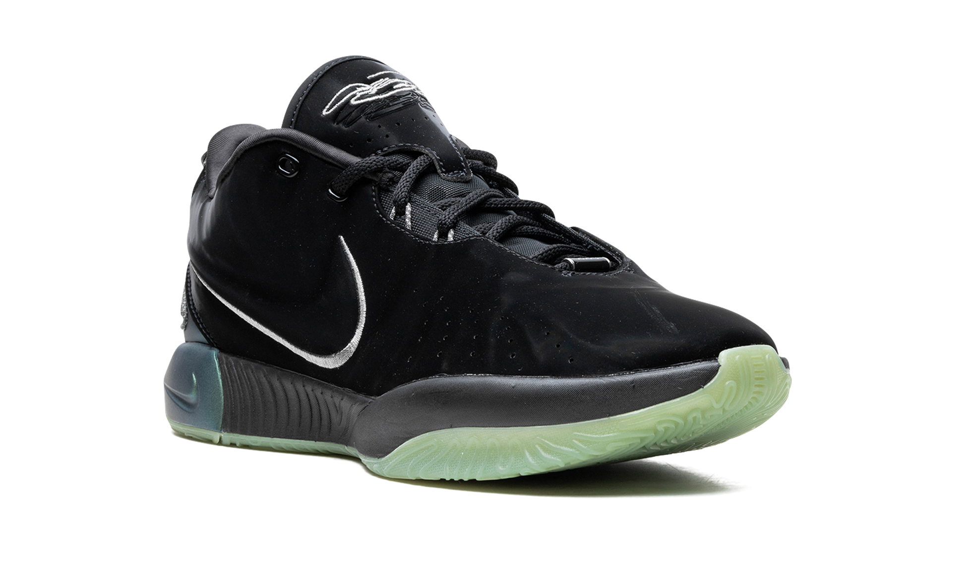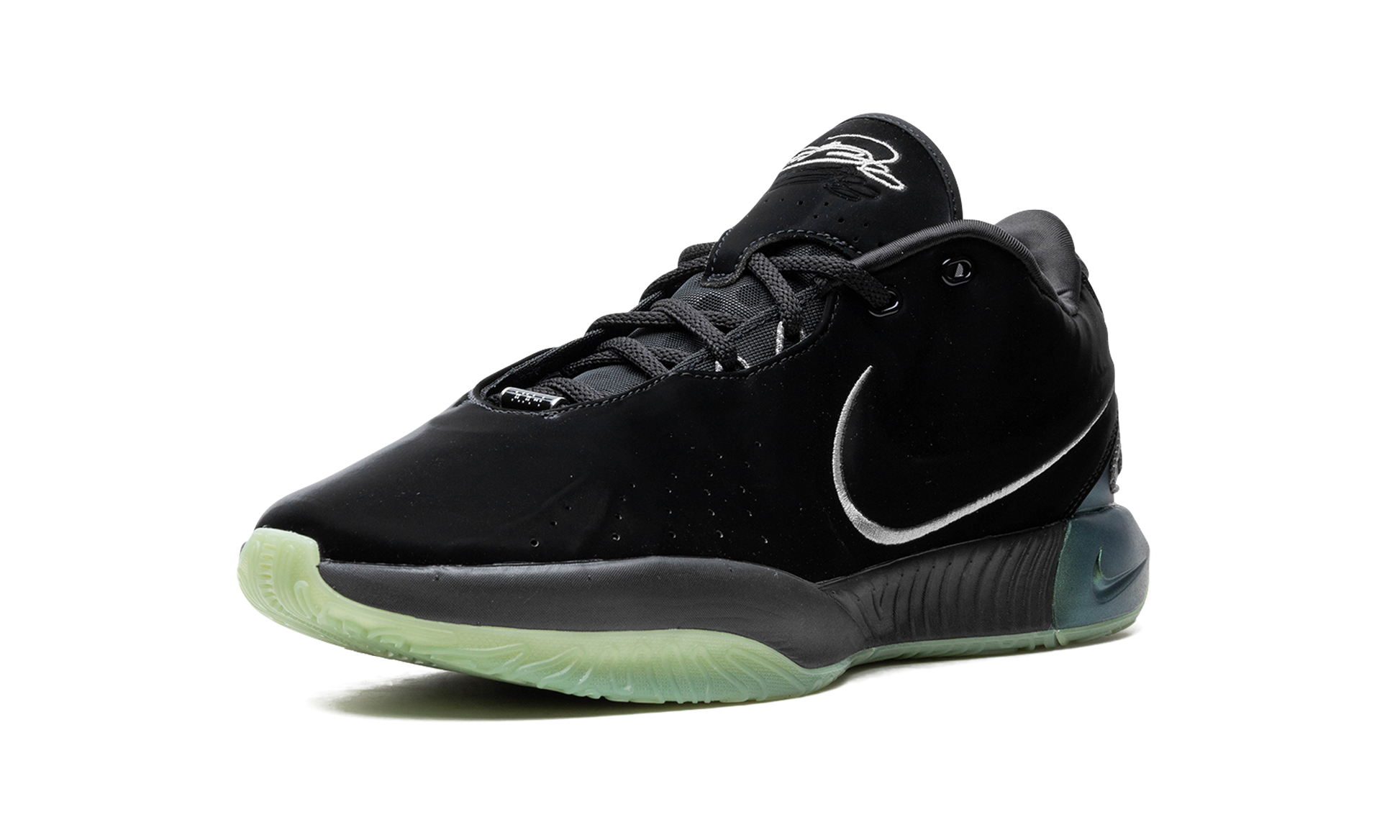 The Nike LeBron 21 "Tahitian" is a colorway of LeBron James’s twenty-first signature shoe with Nike Basketball with iridescent features. The “Tahitian” colorway features iridescent accenting on the heel and midsole that represent the glow of Tahitian pearls. The upper has a black, velvet-like synthetic construction with a shiny finish for a luxe look and feel. Underfoot, a black midsole and semi-translucent green outsole complete the look. Release date: November 3, 2023 Tahitian