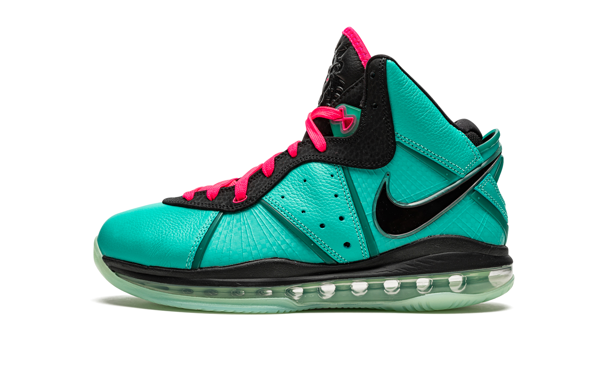 The Nike LeBron 8 “South Beach 2021” is a modern re-release of perhaps the most iconic colorway in LeBron James’ signature shoe collection with Nike Basketball. Launching as a pre-heat colorway prior to LeBron’s tenure with the Miami Heat in 2010, the “South Beach” Nike LeBron 8 played an important role in advancing sneaker culture from what was then a niche hobby into the mainstream. It’s easy to see how based on the shoe’s neck breaking, “Miami Vice” inspired teal-and-pink color block. Arriving in true-to-original fashion, the Spring 2021 release features a Filament Green synthetic leather construction supported by what was Nike’s then-new supportive Flywire technology. Perforations on either side provide airflow to the foot. A glossy black synthetic Swoosh appears on the lateral side of the heel. James’s signature appears in Nike’s decidedly electric Pink Flash hue on the carbon fiber overlay on the back of the shoe. Bright flamingo-style laces sit on the black mesh tongue. LeBron’s signature Nike lion motif is embossed on the top of the black tongue. Underneath, a full-length visible Max Air unit provides a cushioned and responsive ride. Release date: May 2021. South Beach 2021