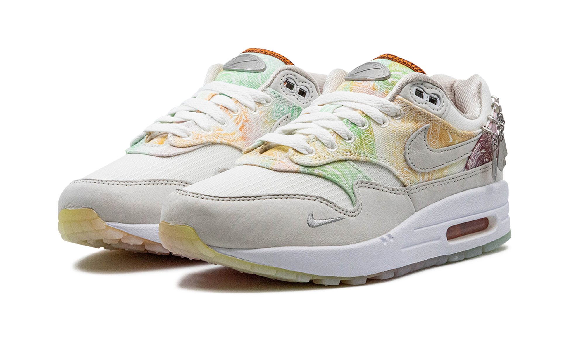 The Women’s Nike Air Max 1 "Metal Charms" is a women’s-exclusive colorway of the retro running shoe with metallic charms on its design. The unique “Metal Charms” edition features a white mesh base with a cream suede mid-panel overlay with a tie-dye-like pattern. A white leather Swoosh appears on the side. “Nike Air” branding is embroidered on the heel and a Metallic Silver Swoosh emblem is seen on the tongue. Metallic charms are found on the heel. Release date: June 17, 2023 White Phantom Mint Foam