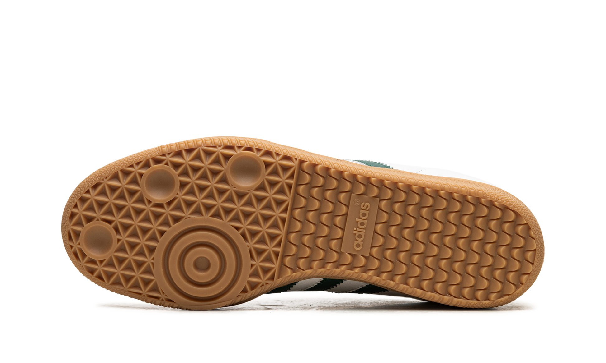 The adidas Samba OG "Collegiate Green" is a colorway of the retro shoe with green accents. The upper features a white leather base contrasted with a grey suede overlay on the toe, and a green leather panel on the heel tab. Collegiate Green leather Three Stripes appear on the sides, while a gold foil “Samba” logo can be seen on the lateral side of the mid-panel. Classic adidas Samba detailing is printed on the tongue. A gum rubber sole completes the look. Collegiate Green