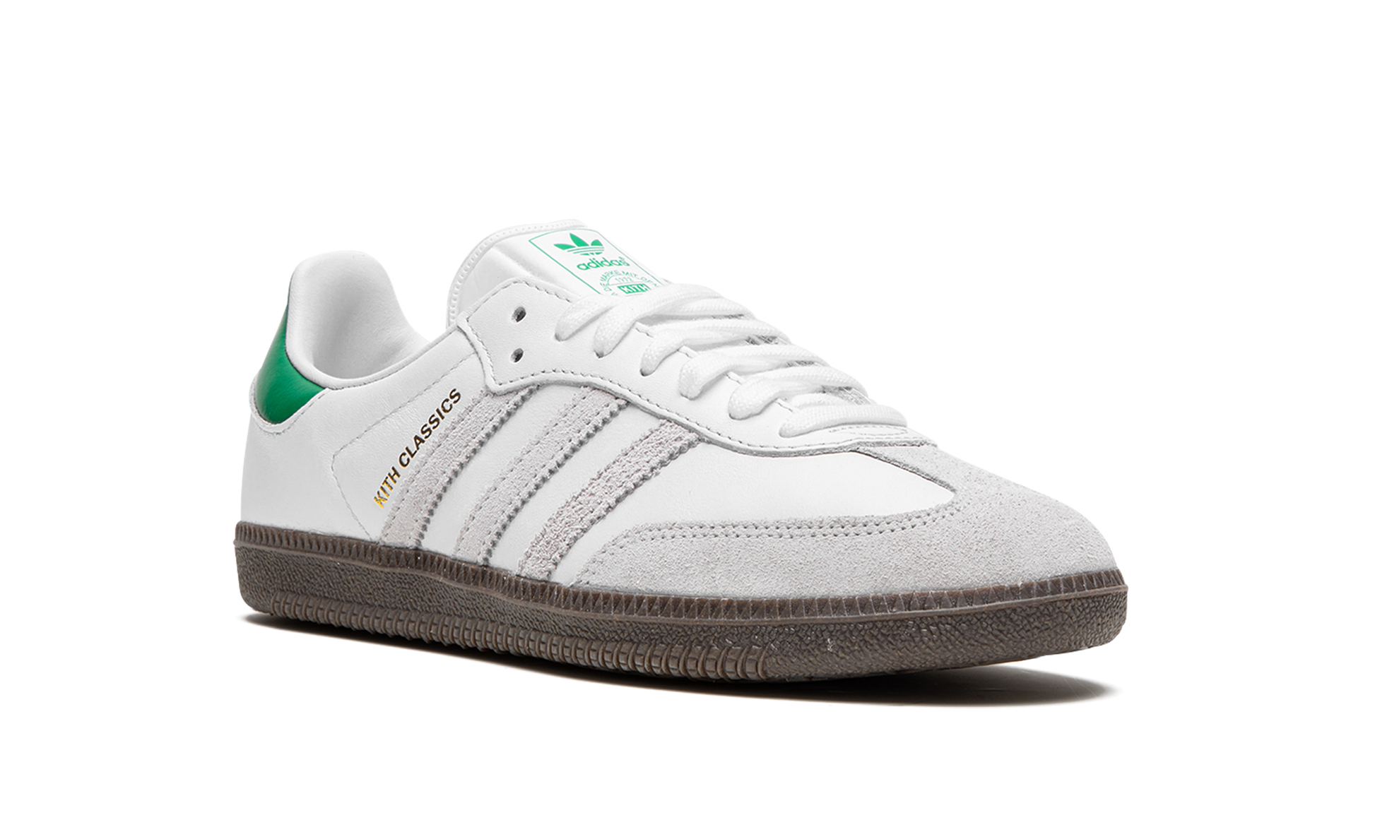 The Kith x adidas Samba OG “Kith Classics Program” is a collaboration between Ronnie Fieg’s sneaker boutique and adidas on a premium colorway of the classic indoor soccer shoe. Keeping the shoe’s timeless appearance mostly intact, Kith’s version of the adidas Samba features a white leather construction with contrasting Three Stripes branding on the sides. Gold “Kith Classics” detailing is found along the side of the branding. Dual “Kith” and adidas insignia are found on the tongue. Green accenting appears on the leather heel tab with adidas’s signature logo. Underfoot, a gum rubber sole completes the look. Kith Classics