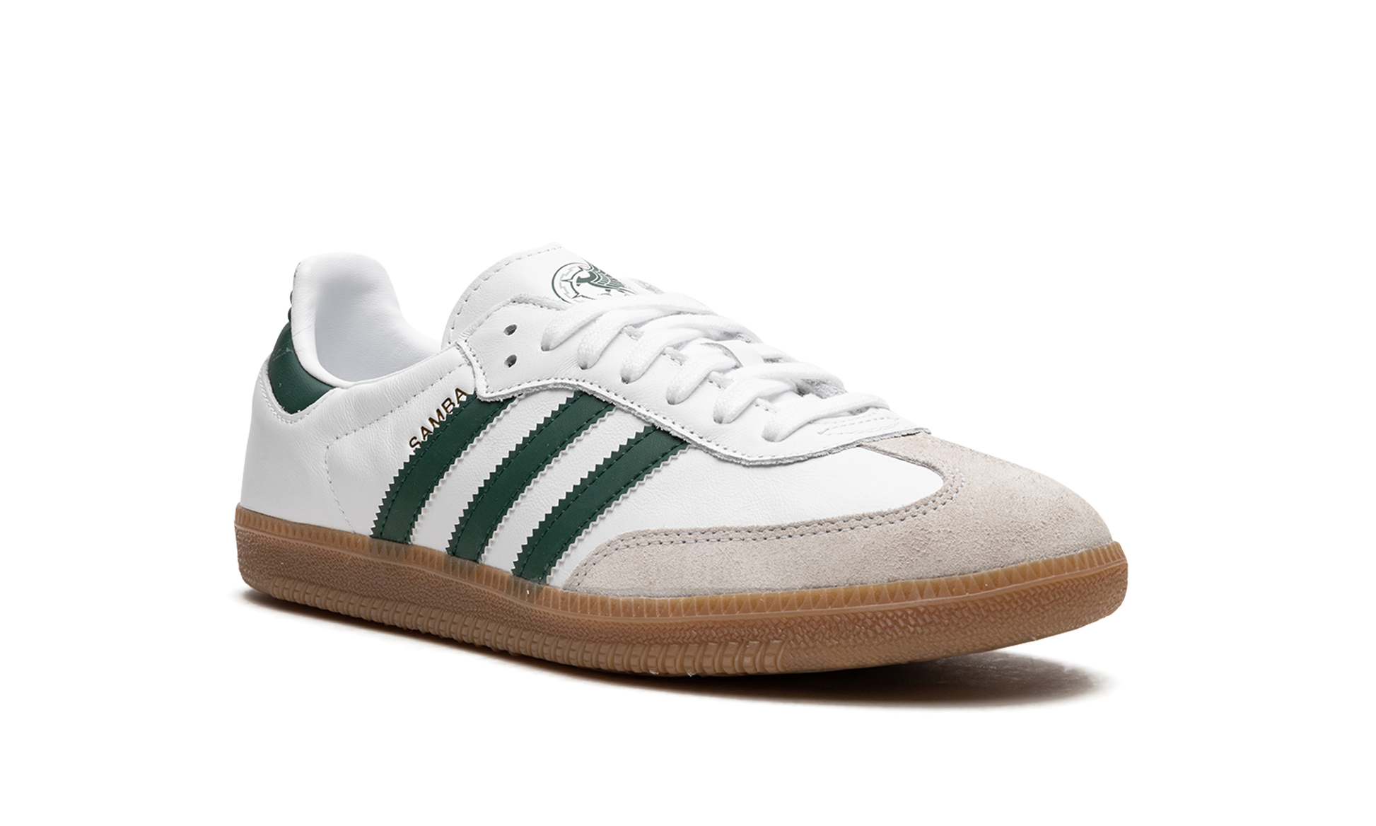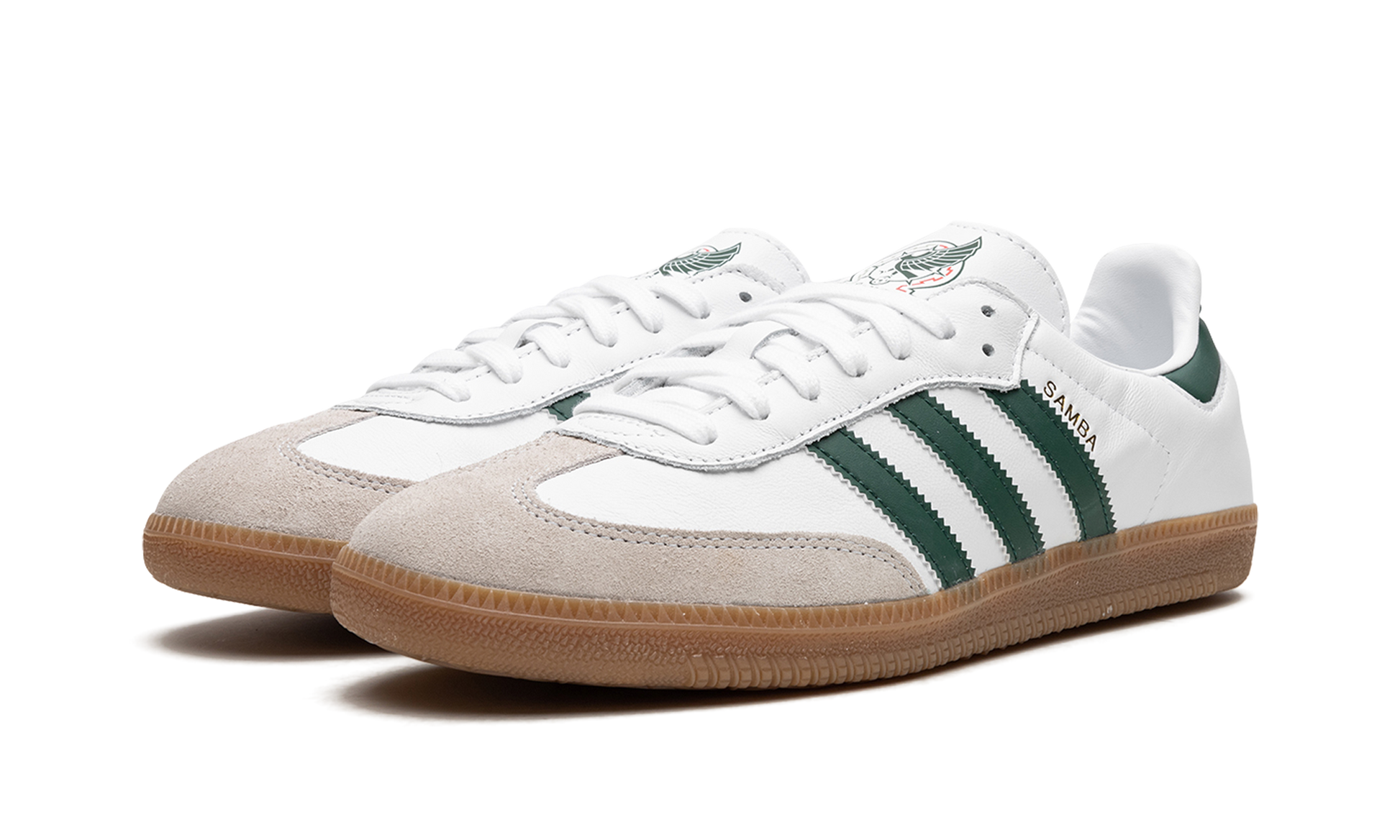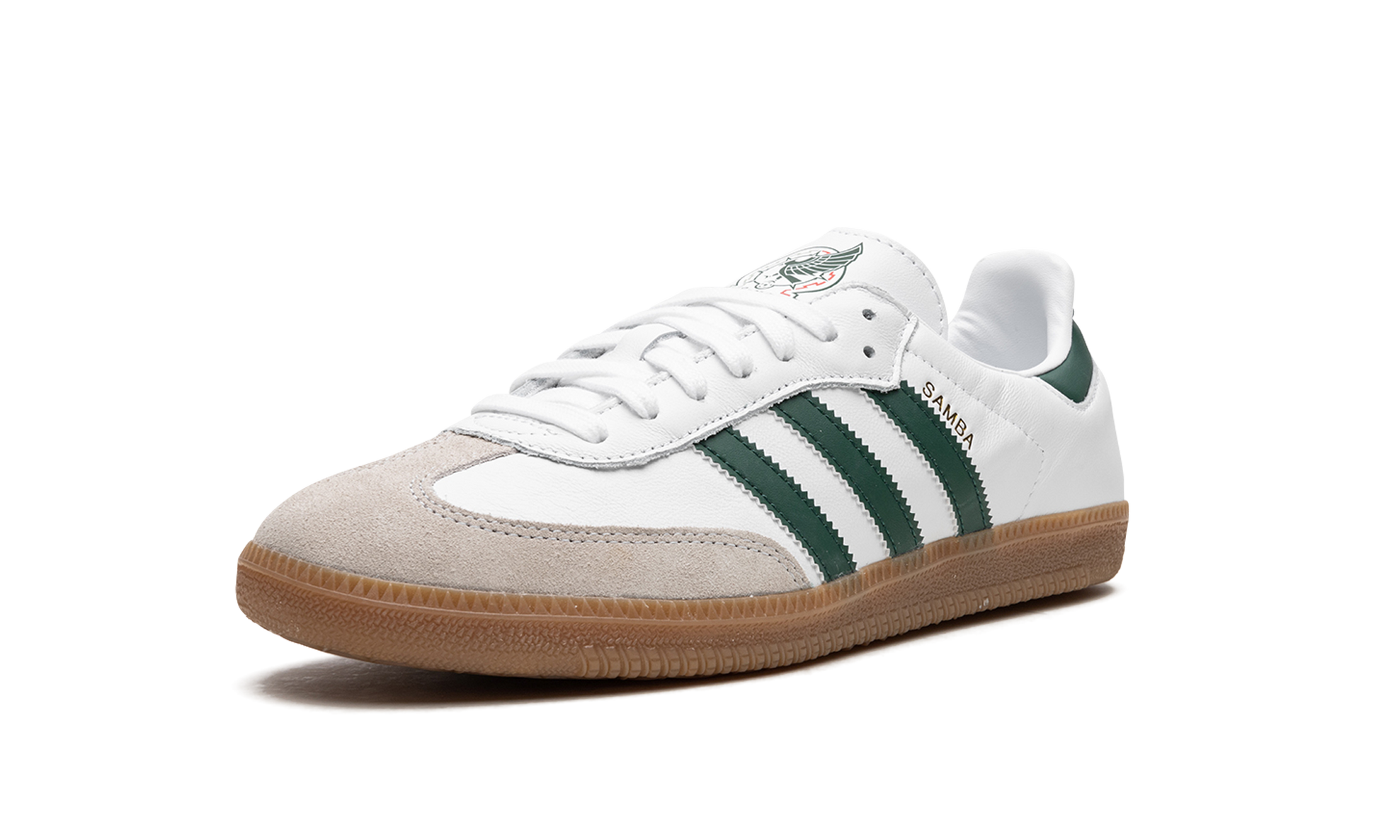 The adidas Samba “Mexico” is a colorway of the retro indoor soccer shoe inspired by Mexico’s home soccer jerseys. A clean look for the ultra popular Samba, the “Mexico” celebrates Mexico’s national soccer club and features a white leather design with green leather Three Stripes branding on the sides. Gold “Samba” detailing appears next to the classic logo. Mexico’s team logo is printed on the white leather tongue, giving the shoe a unique look. A gum rubber sole completes the design. Mexico