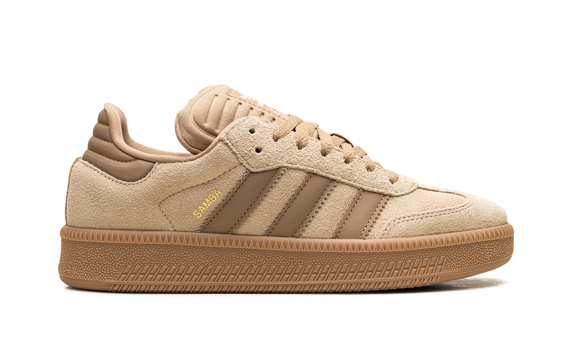 The adidas Samba XLG “Beige/Gum” is a beige-based colorway of the alternate version of the popular retro shoe. The adidas Samba XLG is a modified take on the classic silhouette with a platform-style rubber sole and a thick padded tongue. Here, the shoe has a Beige suede upper with a tonal suede overlay on the toe. A darker shade of beige is used on the Three Stripes branding that appears on the side. A gold “Samba” stamp can be found on the lateral side of the mid-panel. Classic “adidas” detailing is printed on the tongue. A chunky dark gum rubber sole completes the look. Magic Beige Gum
